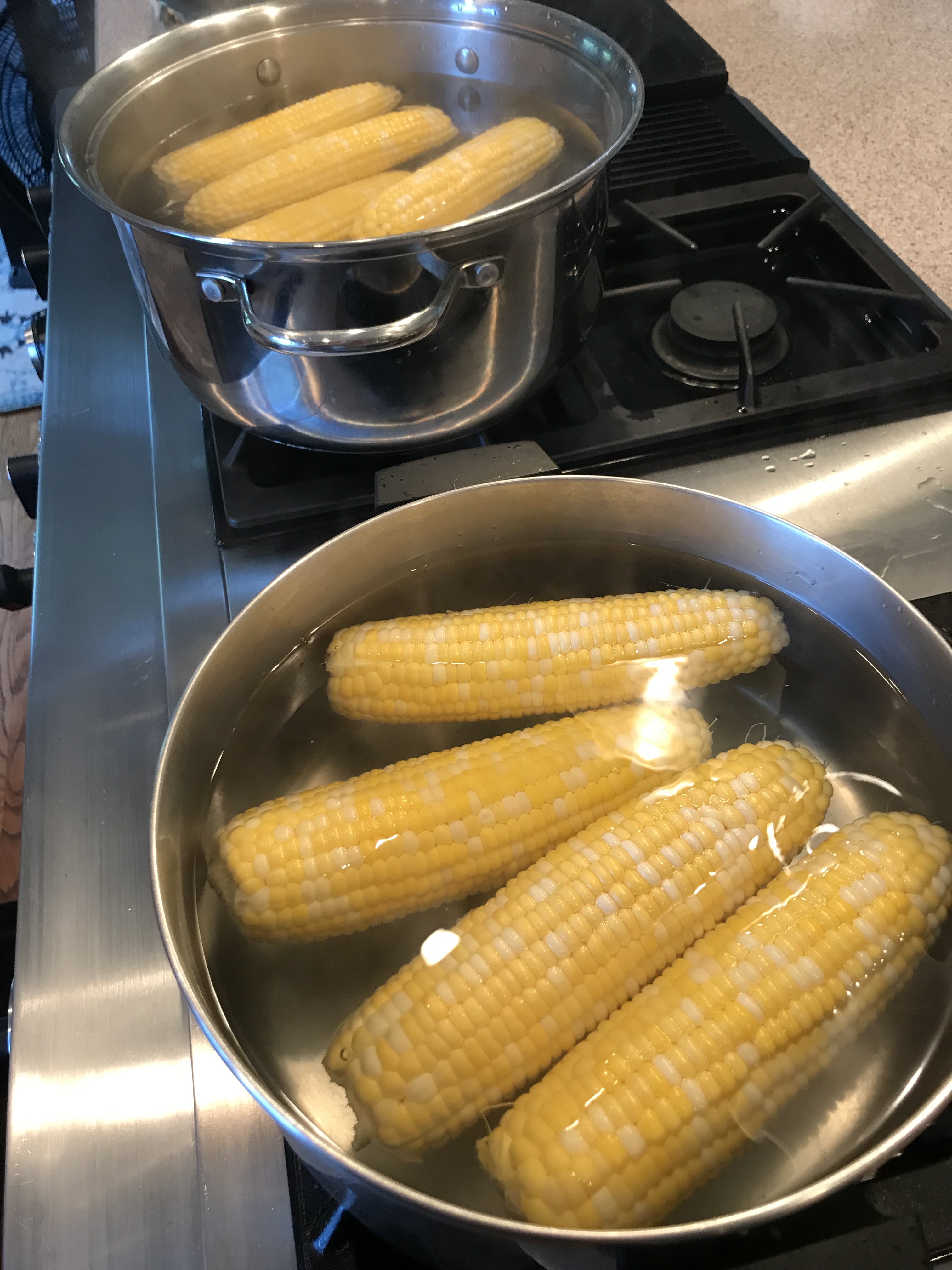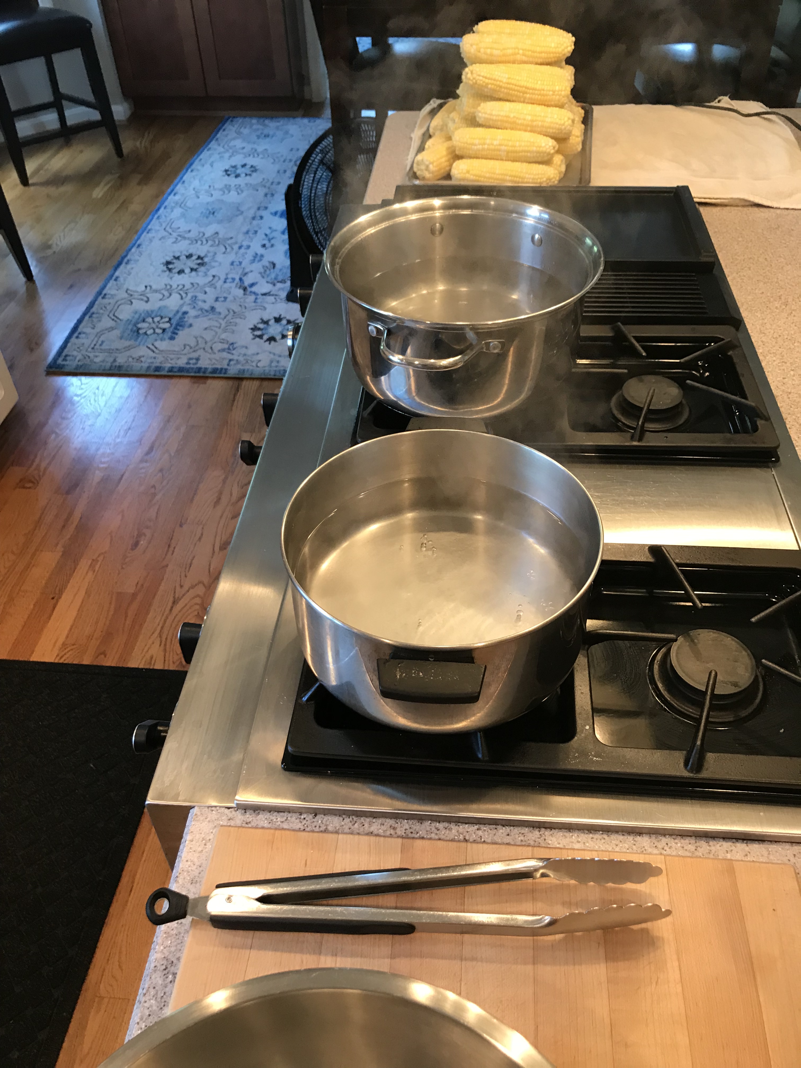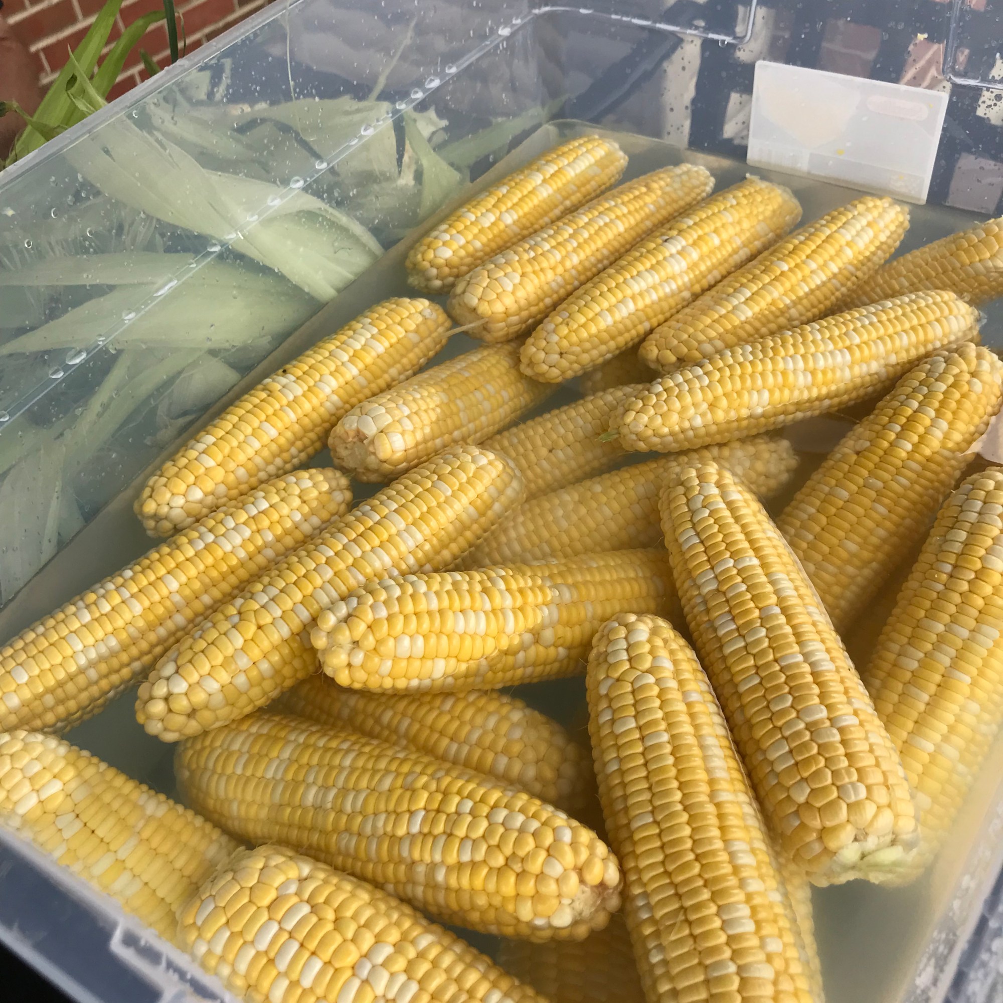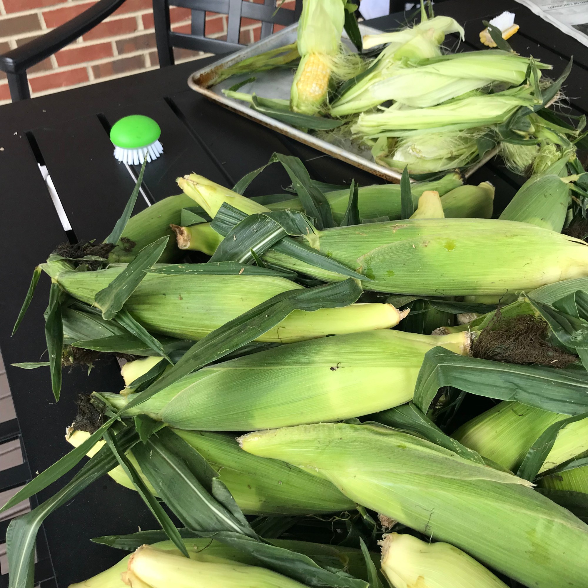 Shuck it, clean it with a vegetable brush and throw them in some cold water until you get through it all. My sweet husband braved the heat and help with this part and cleaned up the mess out there. That’s love my friends.