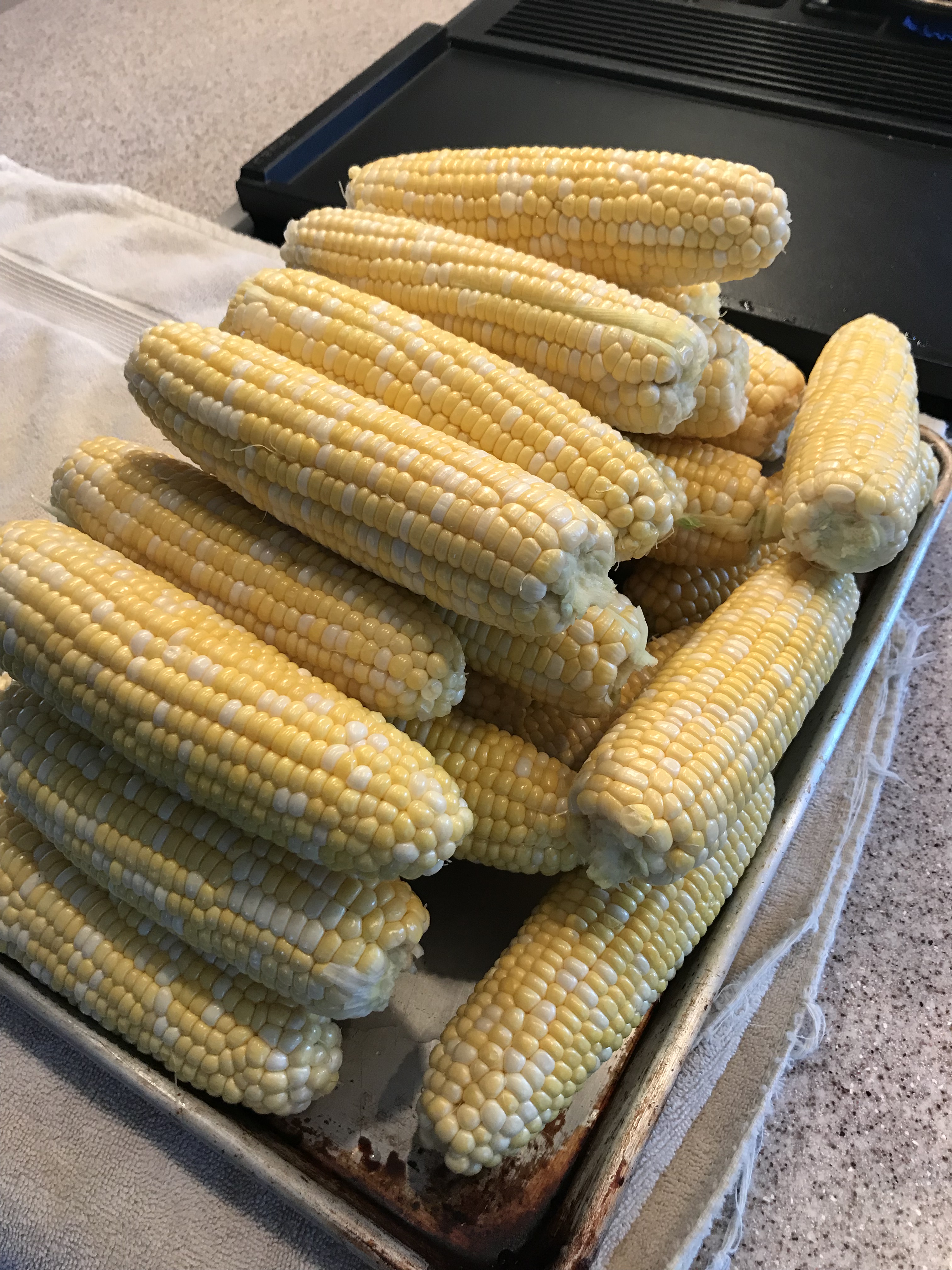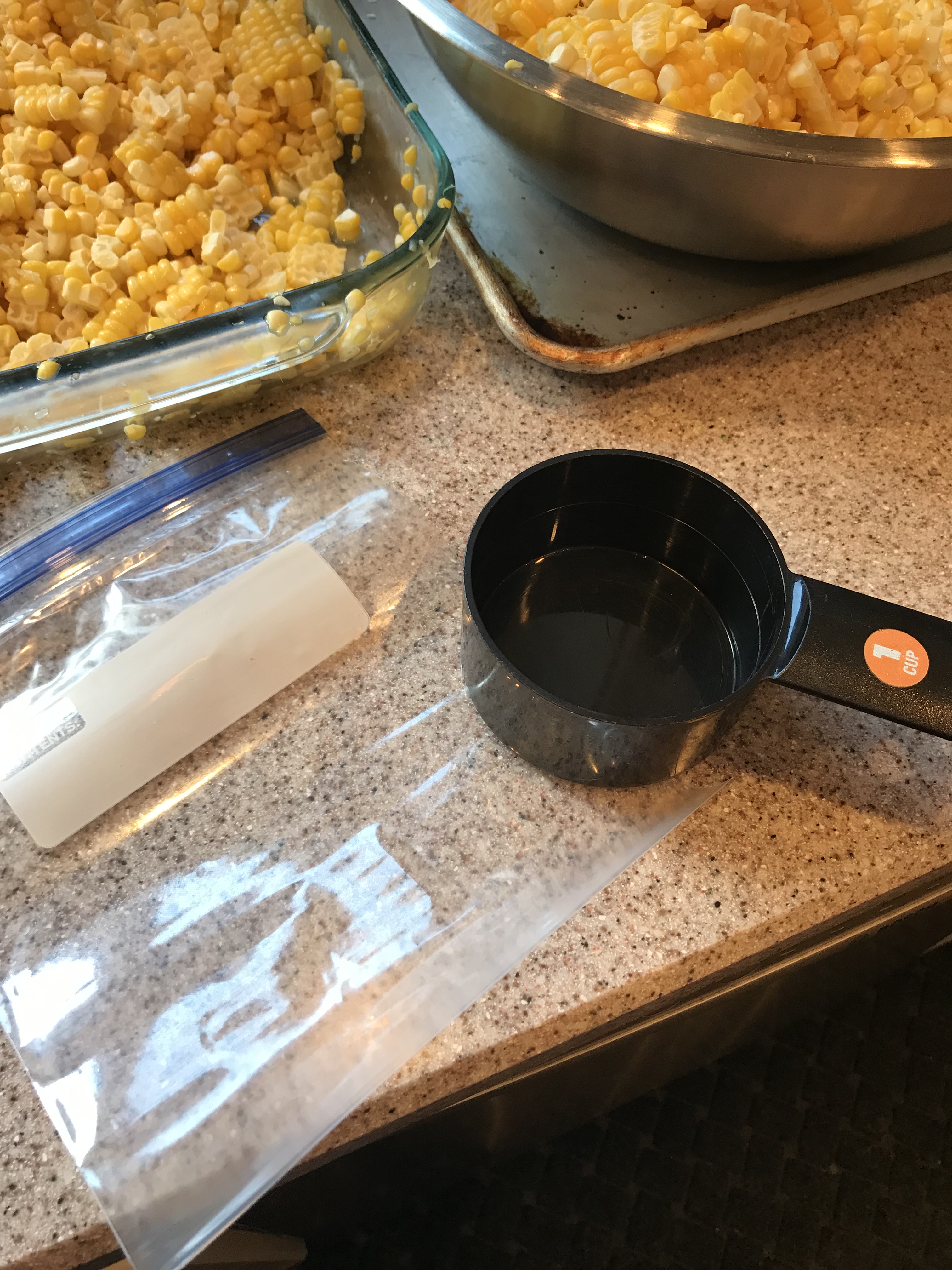 Go buy a bunch of corn. Yeah, it’s easy to say, but pick a place that has the best you can find, even chain grocery stores sometimes have good stuff. Try not to go overboard your first time out. I got 2 1/2 dozen ears and it took me about 2 hours total from shucking to freezer bag. I ended up with about 22 cups of processed corn out of all this.