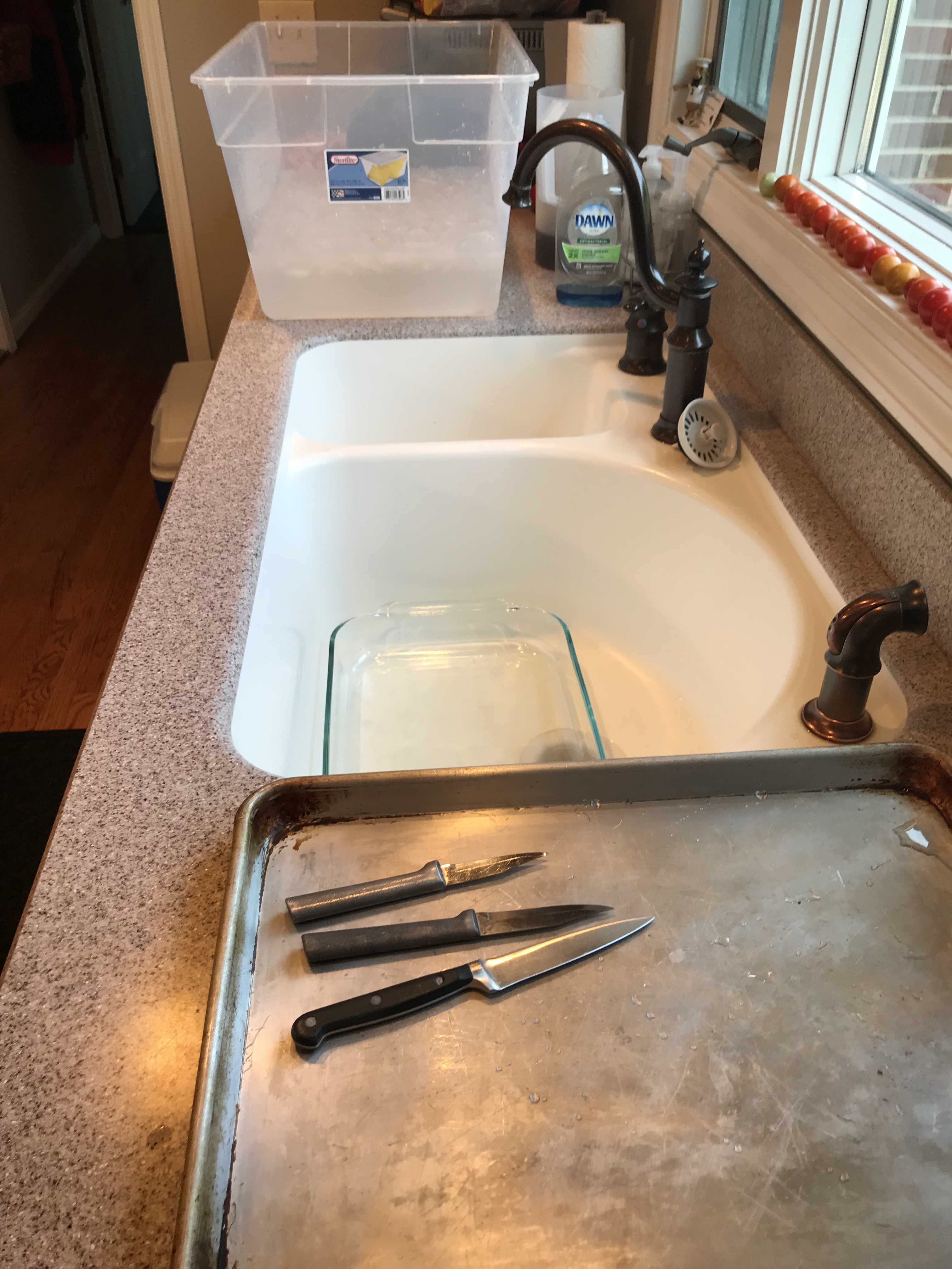 Here’s my setup. Ice bath, baking dish in the sink, paring knives (a well sharpened knife will make this a lot easier, just use caution – No ER!) and the sheet tray is for the completed cobbs. You will need some other bowls to put the corn in when your baking dish gets too full too. Look at all this summer goodness!