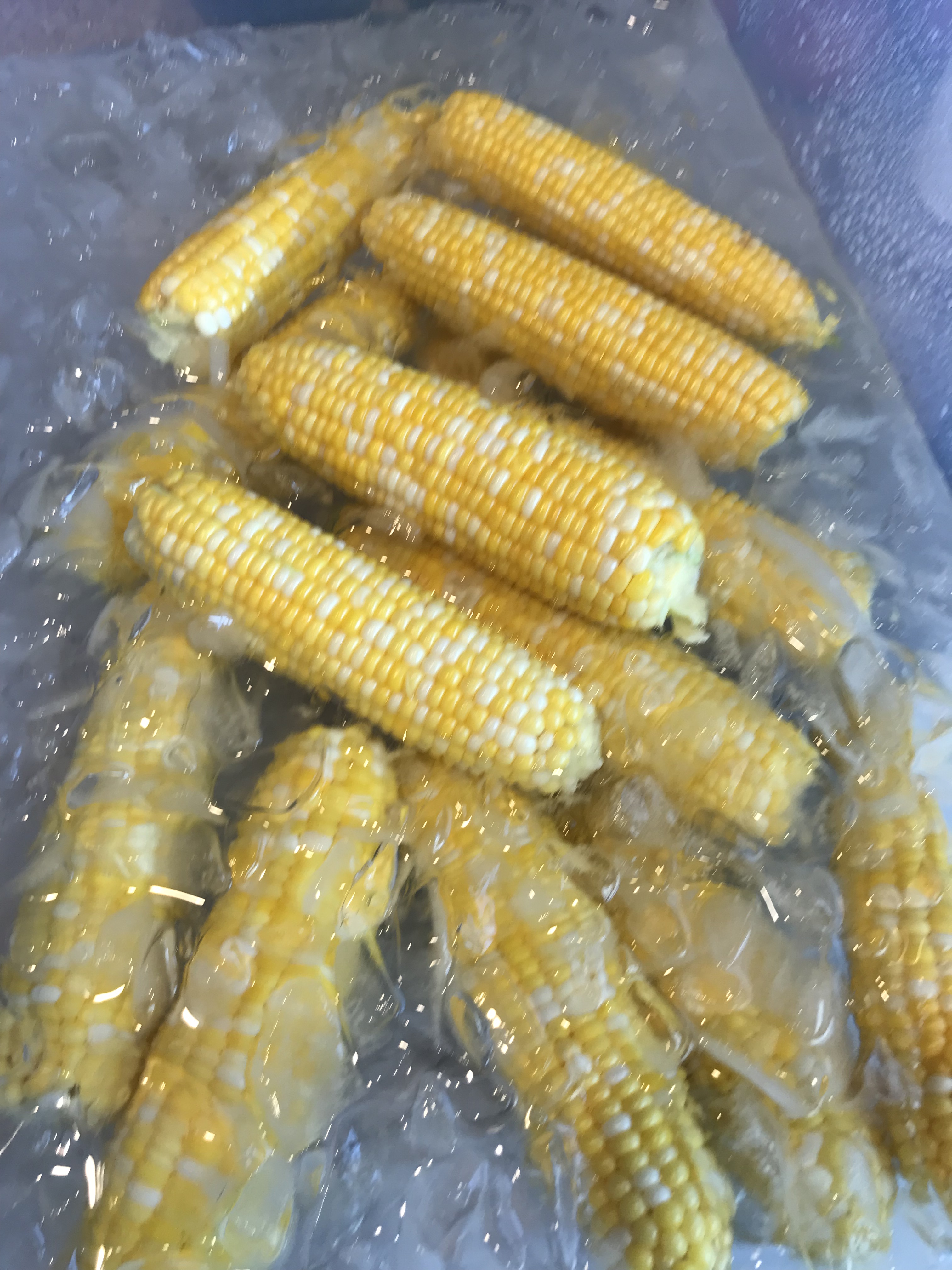 After that’s done, you can move on to blanching and cutting all that sweet corn off. Put on your biggest stock port (or two) and get the water heated up. Once you are up to a simmer, start adding a few ears at a time. It only takes about a minute to get them as cooked as you need, and you can tell because they turn a brighter yellow. Like I said earlier, some people have told me they skip this step, but I like my results so I’ll keep doing it, since it’s not too time consuming. Set up an ice bath to drop these beauties in once they come out of the hot water. That will stop the cooking process and cool them off so you can handle them. I keep up this process until all the ears have been through the cooking step. Then all that’s left is to cut them off and pack them for the freezer.