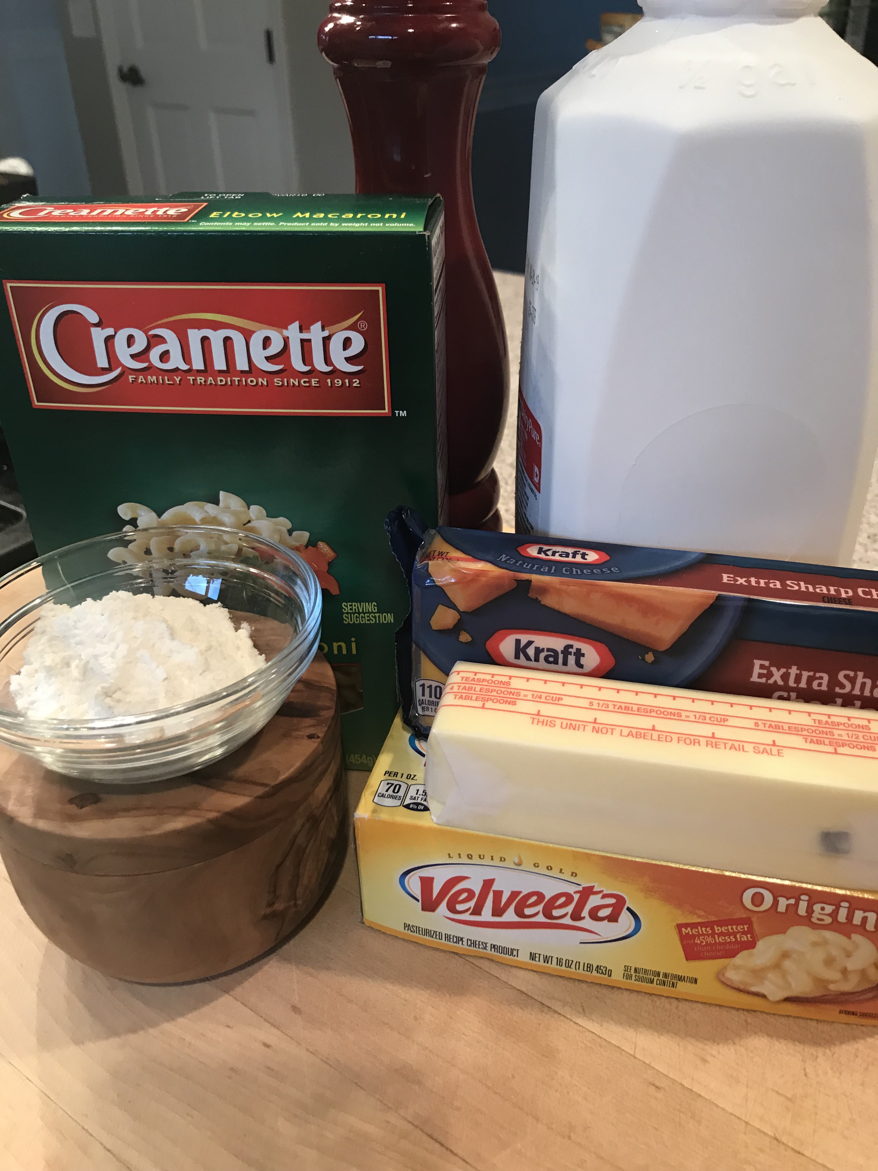 Not a whole lot of exotic ingredients here as you can see. I usually have all of these things on hand and can whip this up in about 20-30 minutes, and it’s not too expensive compared to some gourmet versions.. This recipe makes about 8 servings either baked or stove top. You can cut this in half or double it up. Just make it in a stockpot that is big enough for the pasta to boil. Here’s the list: