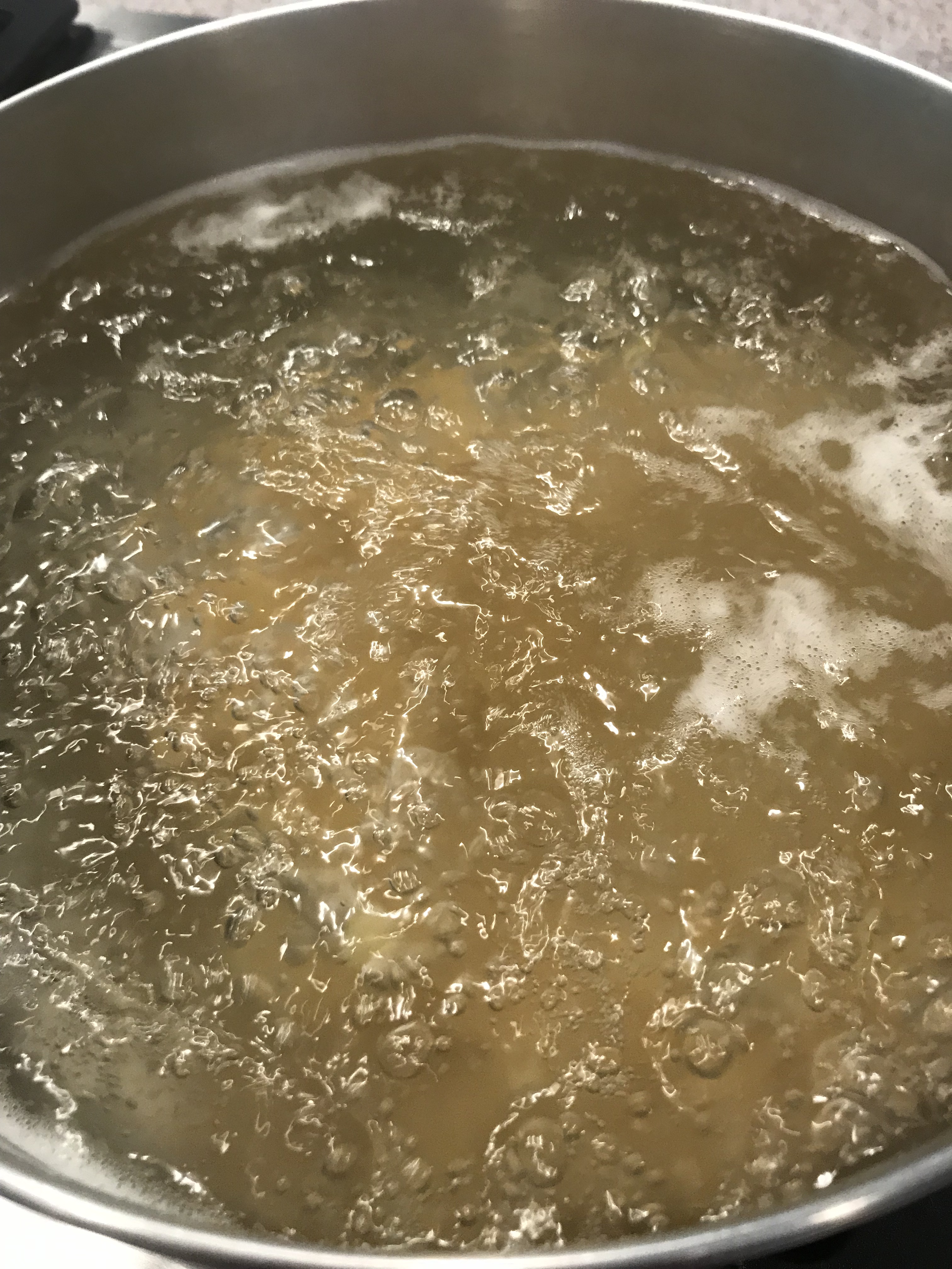 Start by heating up some water in a large stockpot (this one is 6 quarts) with the salt. I stir in the salt so it does not mark my pan, or you can just wait until the water is boiling. I sometimes forget to add it if I wait…one of the perks of being over 40 is forgetting simple stuff. 🙂 Once the water is boiling, stir in the pasta for about 30 seconds. The pasta needs to boil about 9 minutes, maybe a minute or two longer is you plan to eat it right off the stovetop. Give it a stir every few minutes just to keep it from sticking to the bottom, and pull a piece out, let it cool off for a bit, and taste it as you think you are getting close to the texture you like. Before you drain the pasta, take a heat proof measuring cup and CAREFULLY save off about 1 cup of pasta water. It will come in handy later if you are baking the pasta. If not you can probalby skip it. Now drain the pasta.