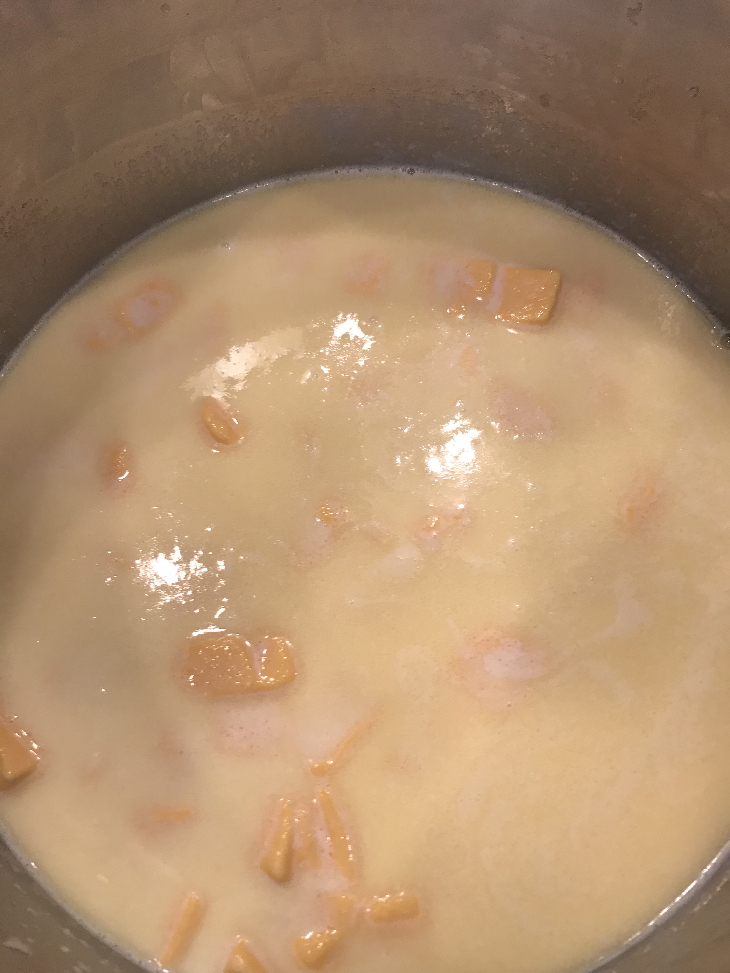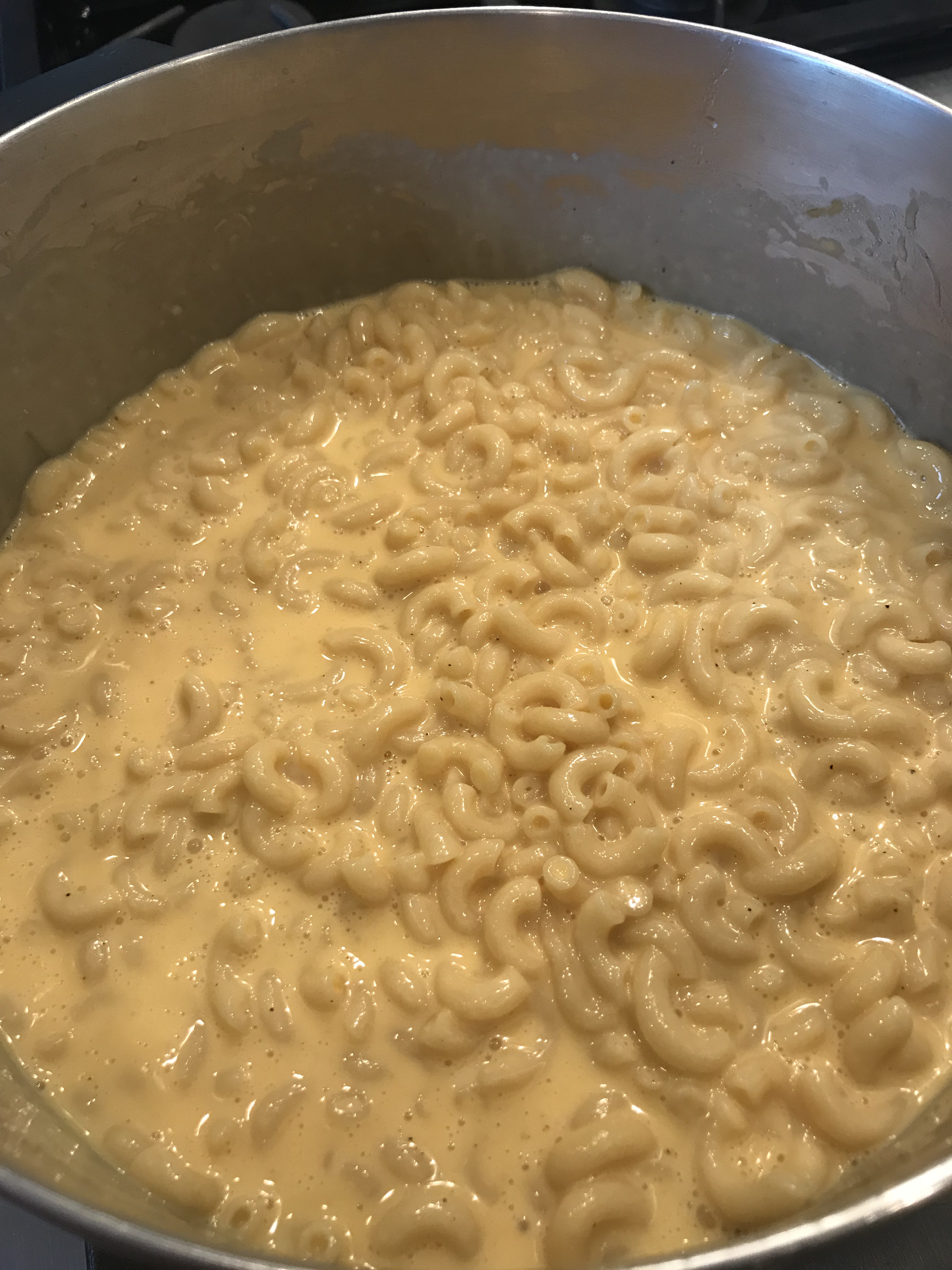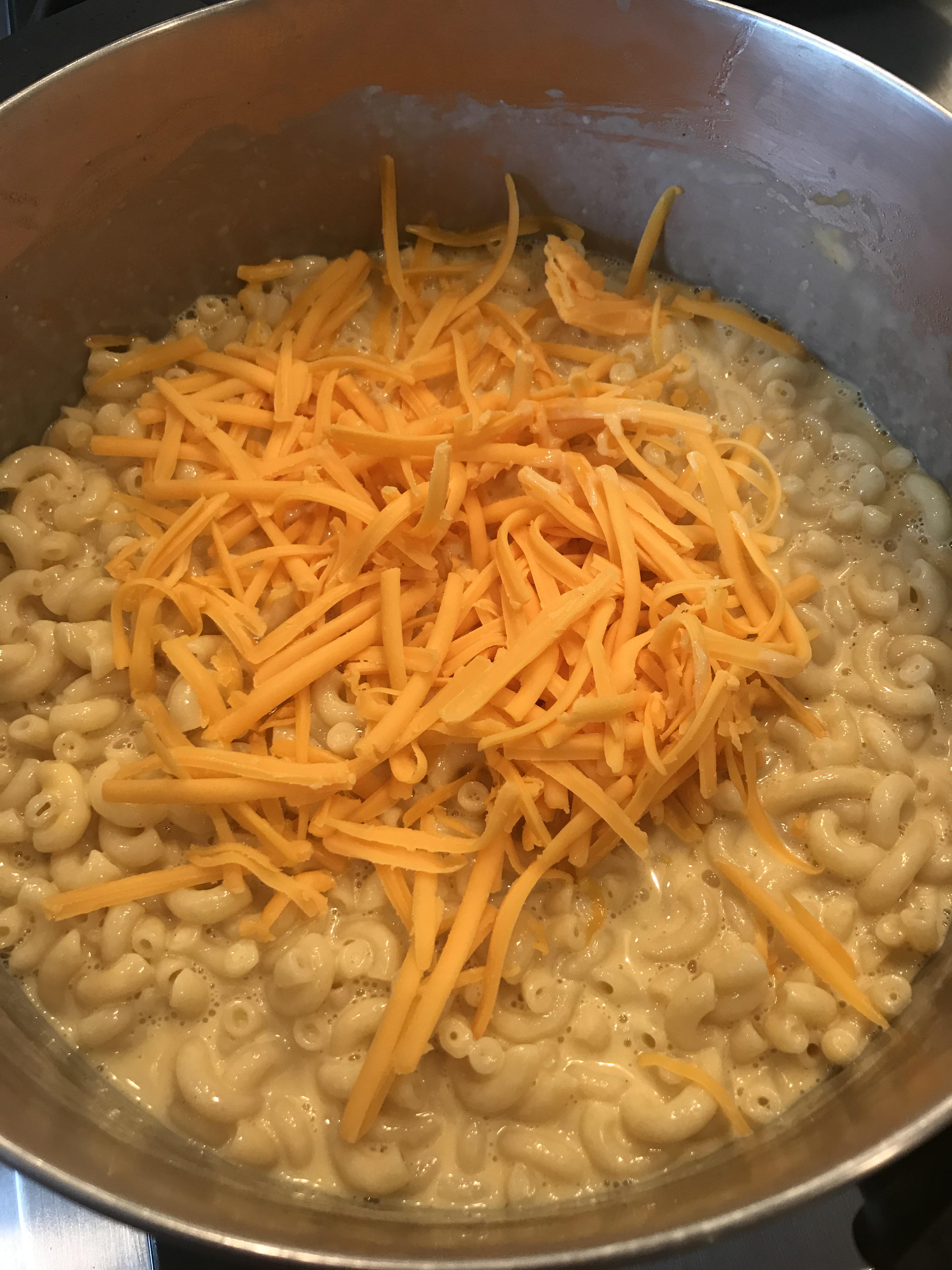 In the same pot (less dishes-yay!) put the butter in and turn the heat on to medium. Once the better has melted, wisk in the flour. Let the flour cook out while wisking for about 2-3 minutes. Stir in the milk and switch to a wooden or silicon spoon. Stir in the American cheese until it starts to melt. Add in the pasta at this point, it’s OK if all the cheese has not melted. Turn the heat down to medium low and stir in the shredded cheese. Taste the pasta at this point to see how much salt/pepper you might want to add. Pasta absorbs salt at different rates so the salt content can vary depending on what brand of pasta you are using. Add as much fresh ground black pepper that you like…I like a lot of it…and adjust the salt. This is the best part of cooking, making things taste how you like, right?
