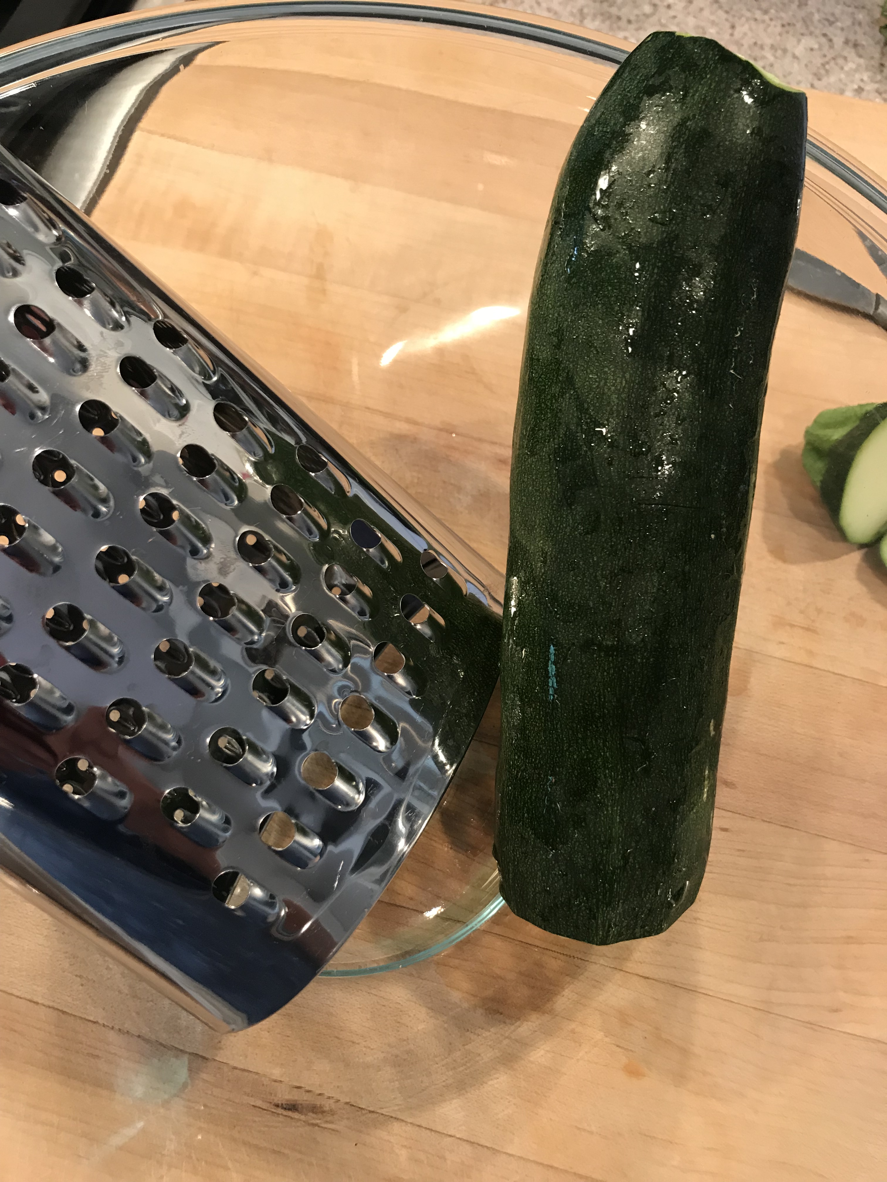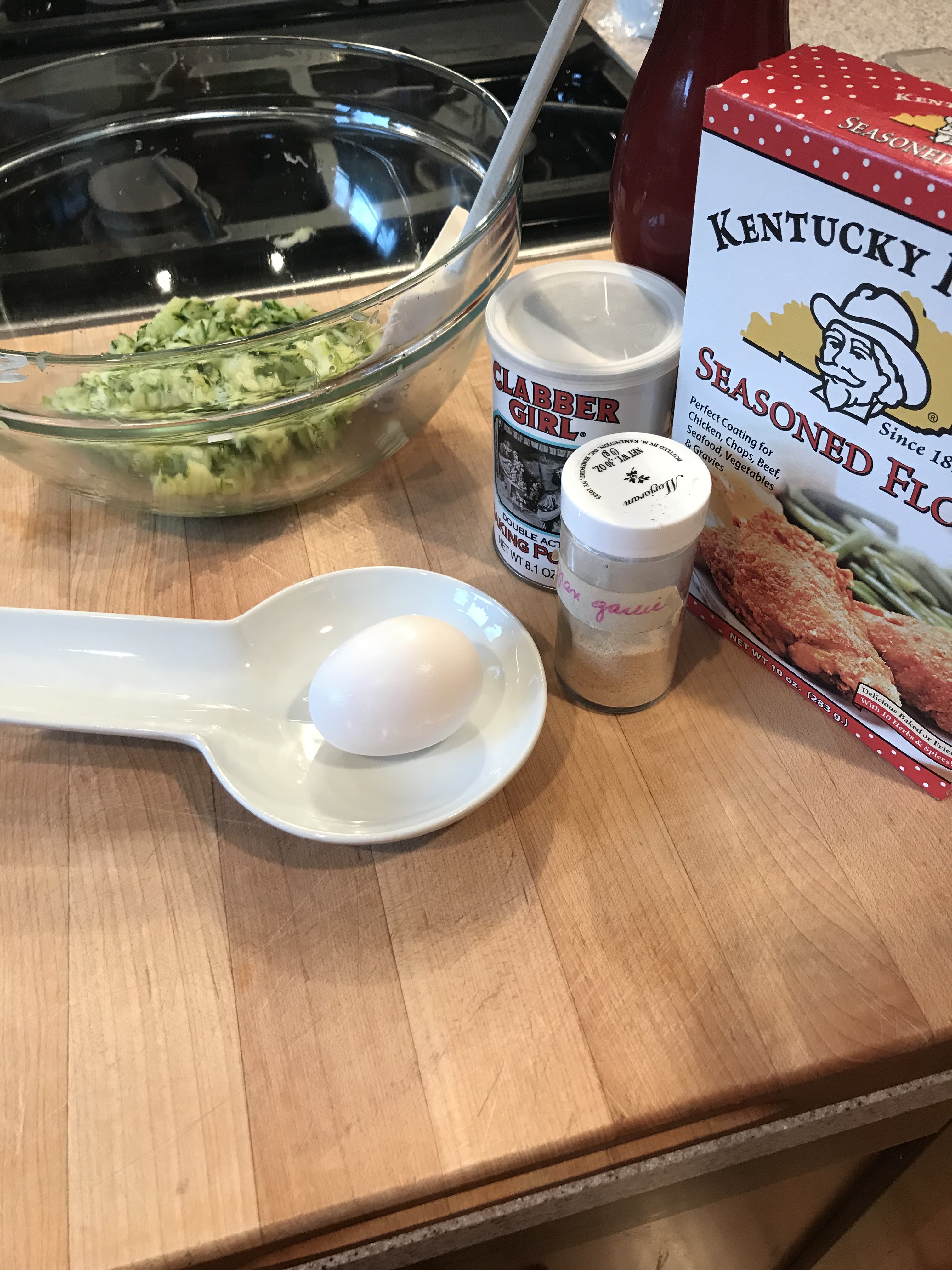 Shred up the zucchini using a regular grater. This is one medium zucchini I used for this recipe. Toss in a mixing bowls and sprinkle it with a decent sprinkle of salt. This will help the zucchini start separating the water out. You can do this is a fine mesh sieve too if you don’t mind extra dishes. I just push the zucchini aside and tip the bowl to allow the liquid to drain to one side. I just use a spoon to get the water out. I gave this about an hour to drain. Grate in about 1-2 tablespoons of red or sweet onion, totally your preference if you want to add it. Mix in 3/4 cup of seasoned flour, and add up to 1/4 more depending on how wet your zucchini is. Your batter should be a little thinner than pancake batter. Add 1/4 teaspoon of granulated garlic (optional), 1/2 teaspoon of baking powder, and one beaten egg. Stir it to combine.