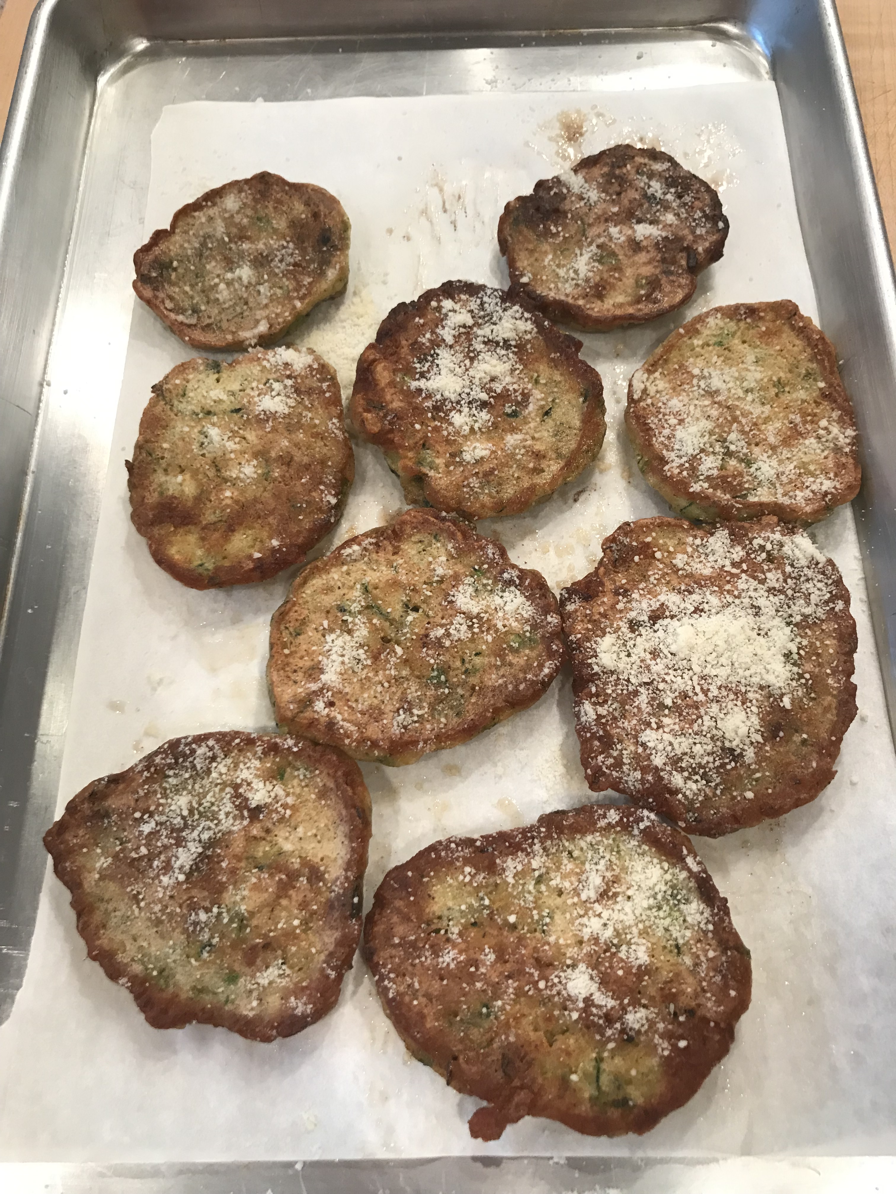 Time to sauté! I put 2 tablespoons of butter and 2 tablespoons of olive oil in a large non-stick skillet over medium heat. Once the butter is melted and the oil has heated up, I use a medium cookie scoop to make sure the cakes are about the same size. (I sometimes make a test cake to see how my seasoning is) You can use a smaller scoop if you want to make these smaller as an appetizer for a party. You cook these a little like pancakes. Wait for them to get golden brown around the edges before you flip them over. As they finish browning, keep them on a cookie sheet in a warm oven while you cook the rest. This should make 12-15 cakes in this size. Add more butter and olive oil as needed between batches.