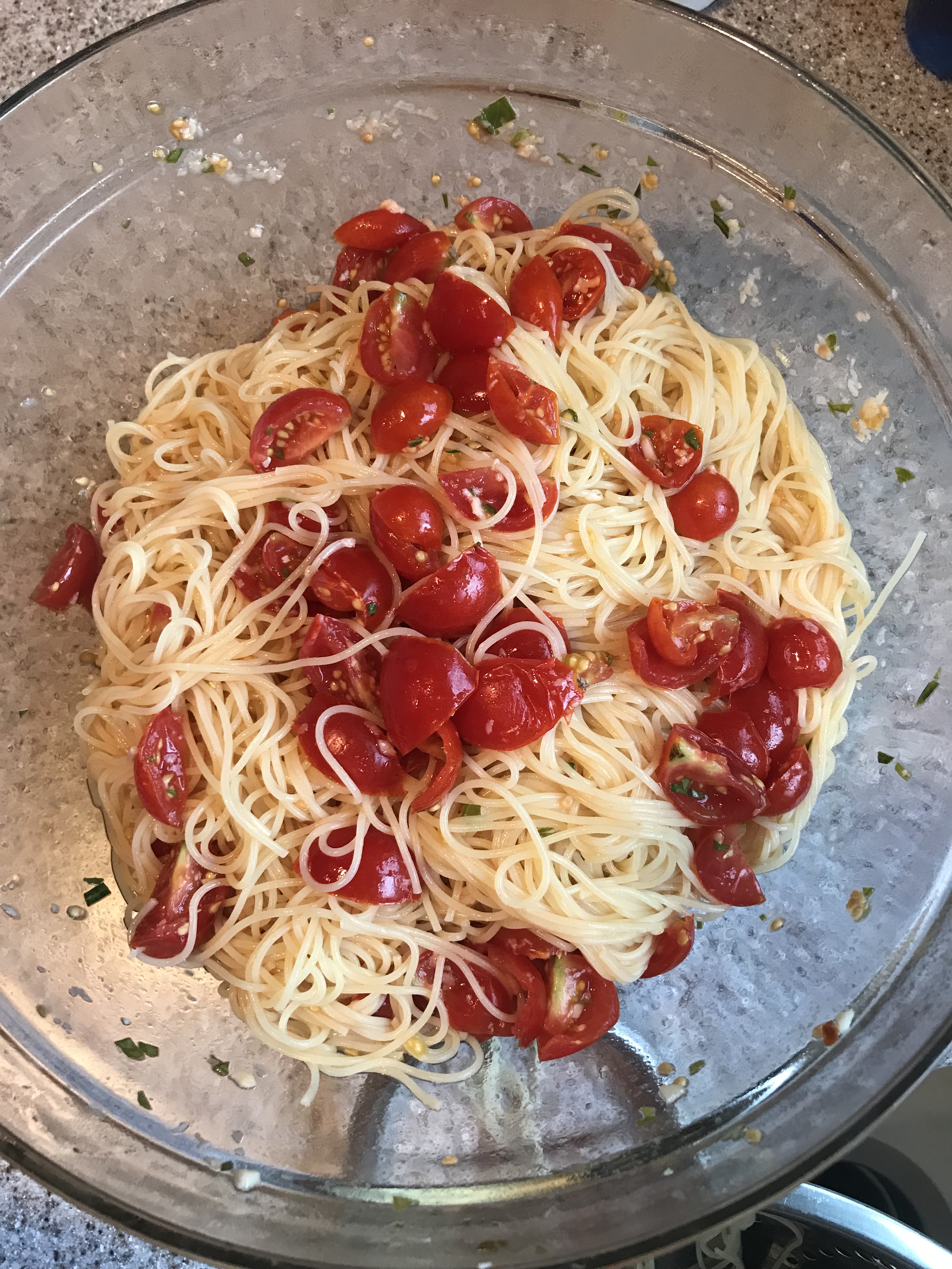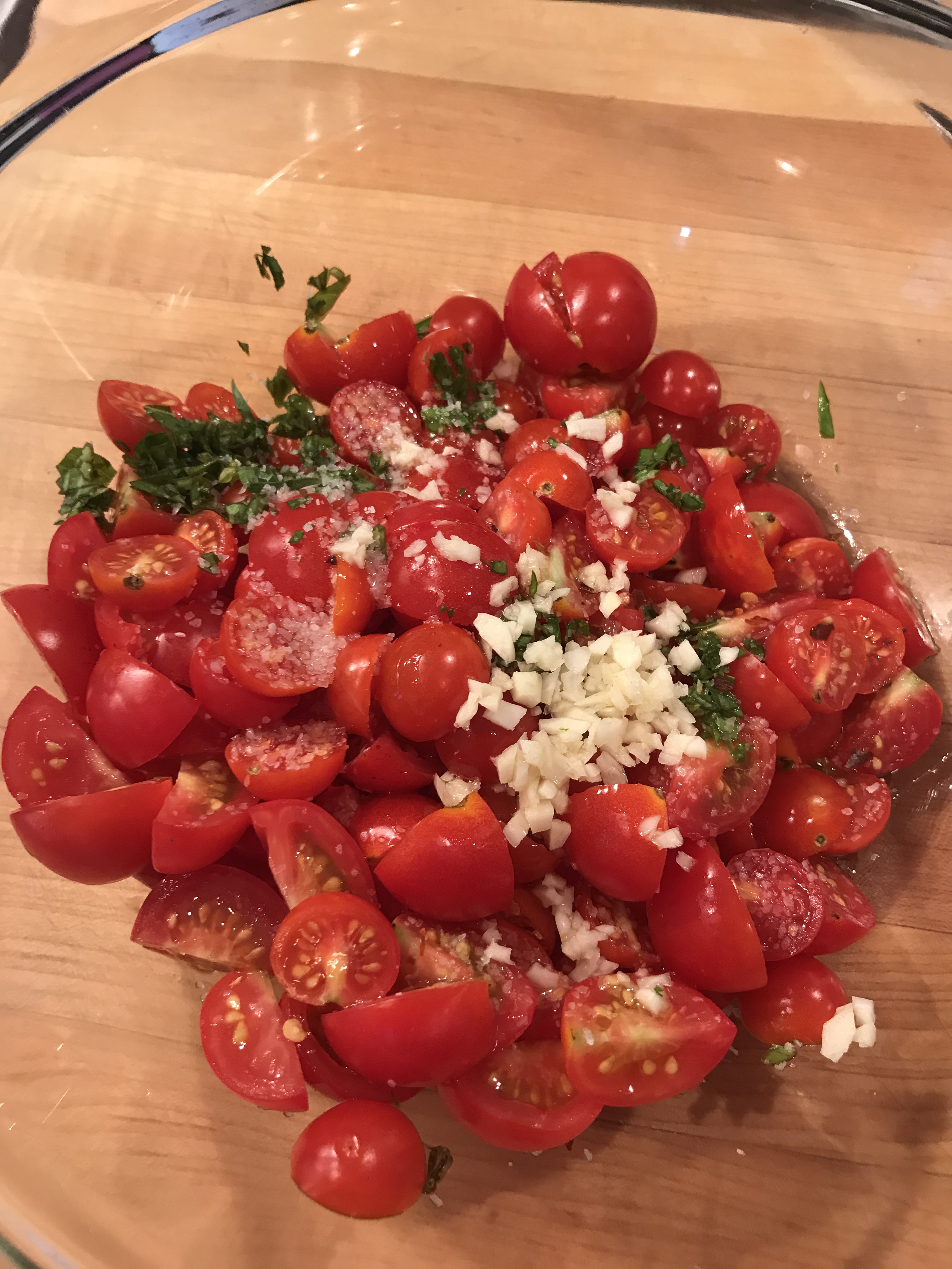 This is ALMOST a great no cook side dish, and it’s really not even something I measure. I know I’ve vowed to get better at that measuring thing, but here it is anyway. Once again I find myself with a ton of little tomatoes from my garden. Ina Garten has a great summer pasta recipe, and this is a version of that. Cut the tomatoes in half and add them to a large bowl. If I had to guess this is about a pint of cherry tomatoes. Add one clove of minced garlic and about 2 teaspoons of fresh basil (also in abundance in my garden right now). I also add a dash or two of crushed red pepper – totally optional – and about 1/2 a teaspoon of Kosher salt. I give it a heavy splash of good olive oil (1/4 cup or so), stir it together and cover it with plastic wrap. Leave it out on the counter for about 4 hours.