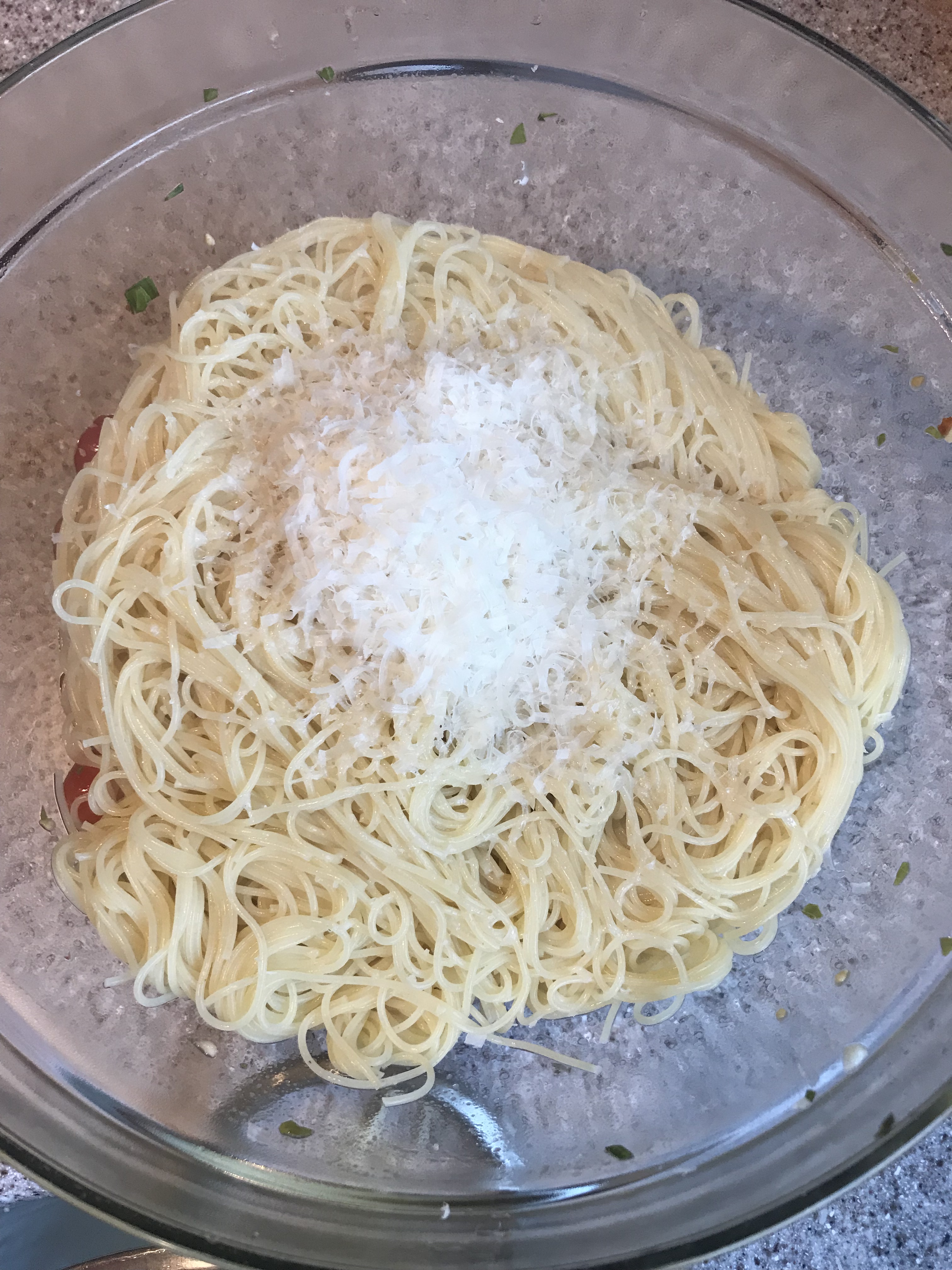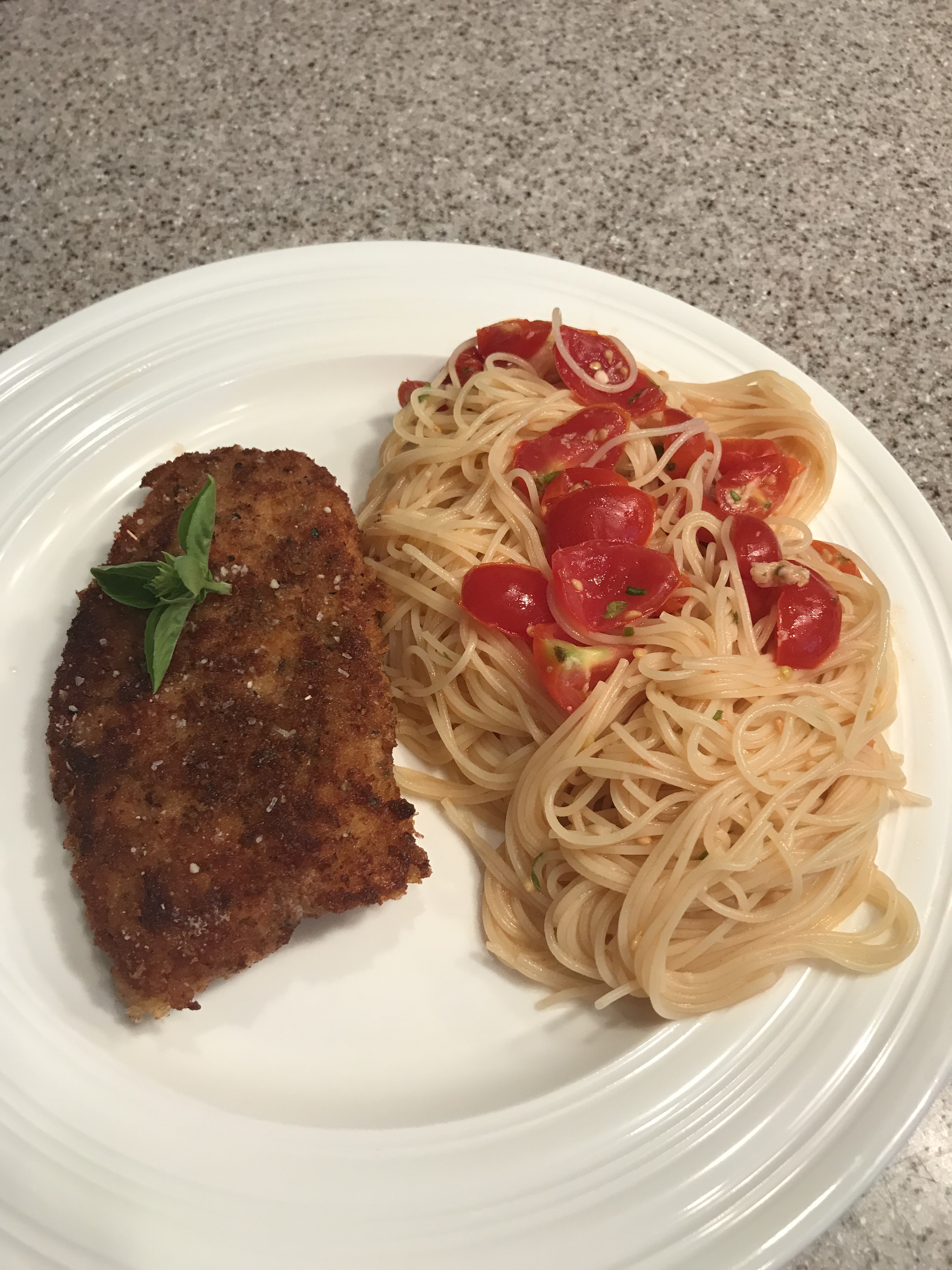 Cook up some angel hair pasta (according to the directions on the box) and toss it in with the tomato mixture. Add some parmesan cheese and a little more fresh basil and olive oil if you like. Check for salt and pepper and add to taste. I love this dish with any kind of chicken (this is a chicken parmesan cutlet), but it’s also really good with shrimp. Serve warm or room temperature. Enjoy!