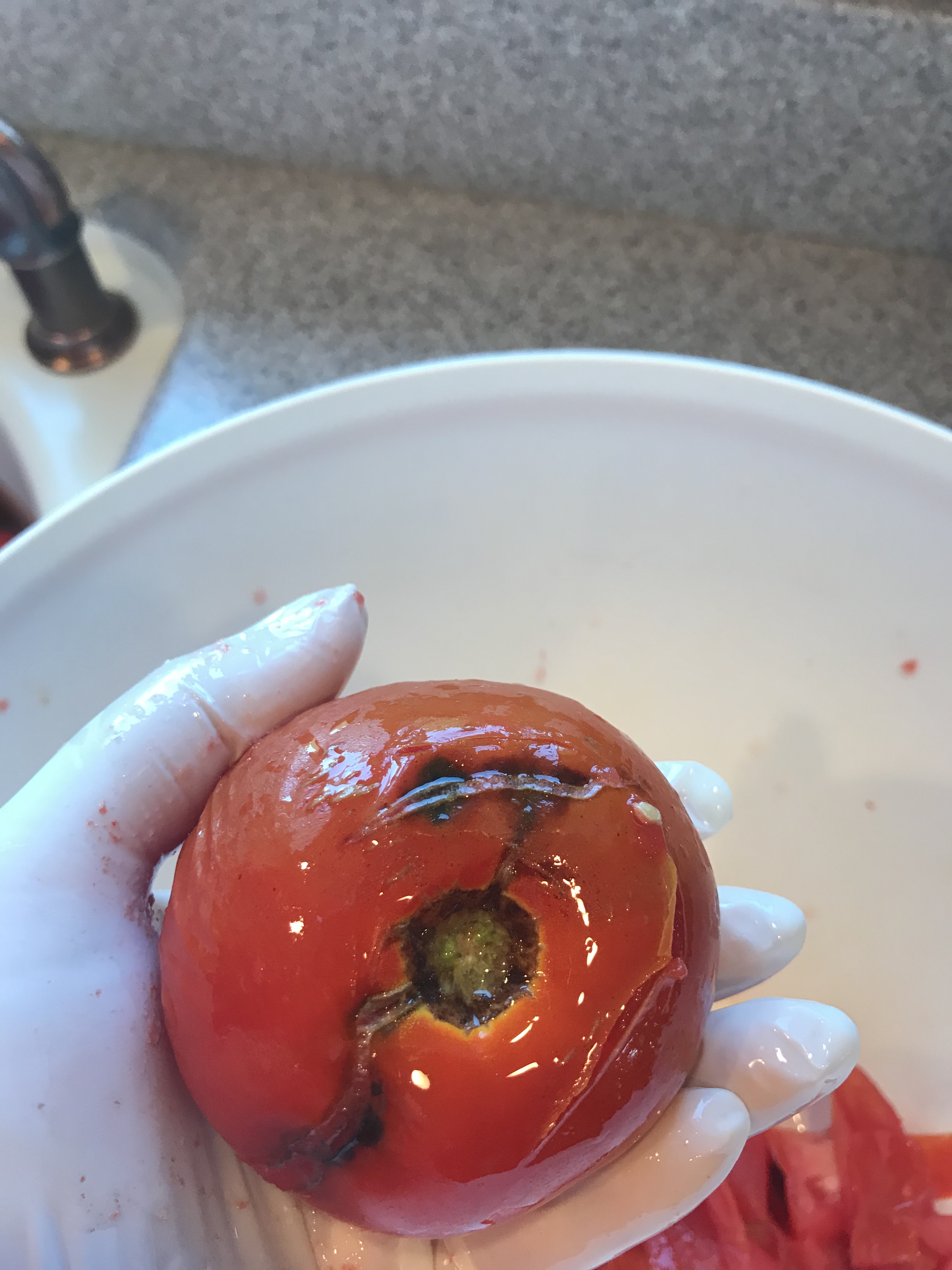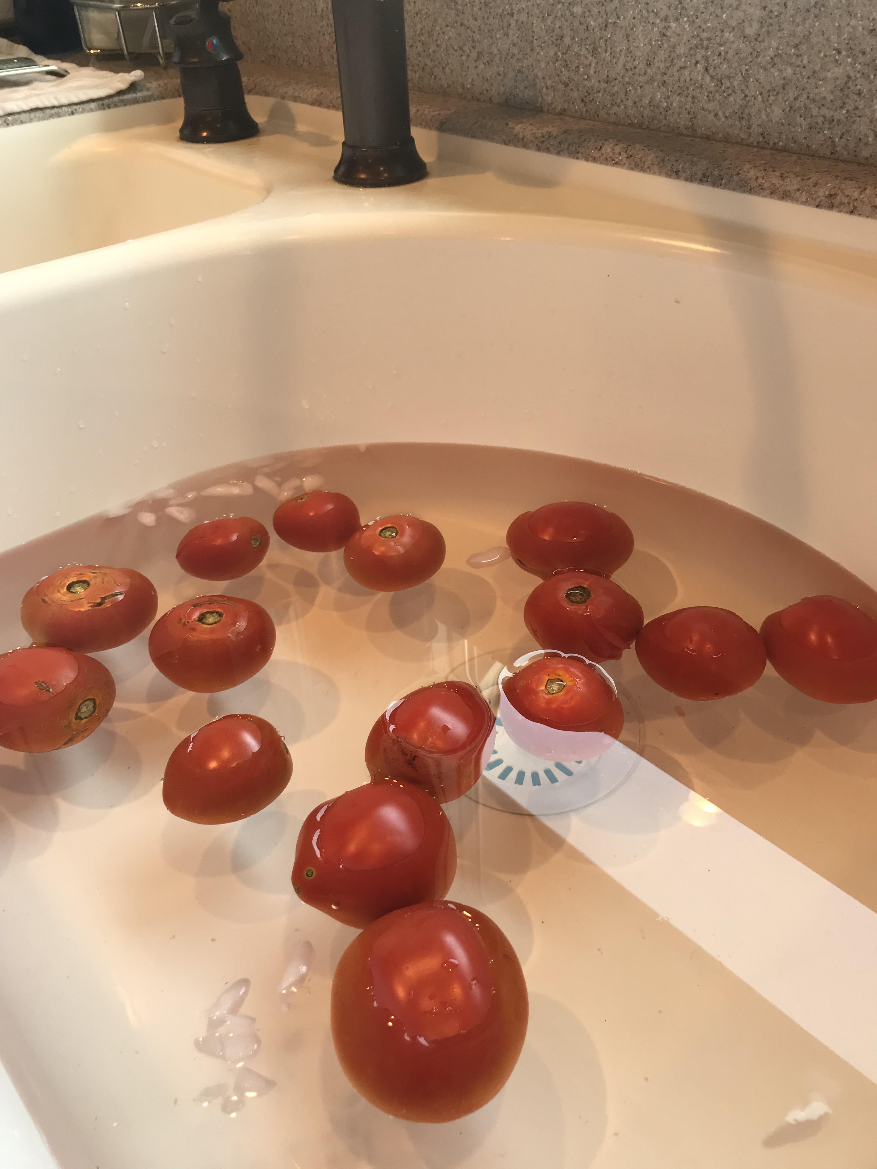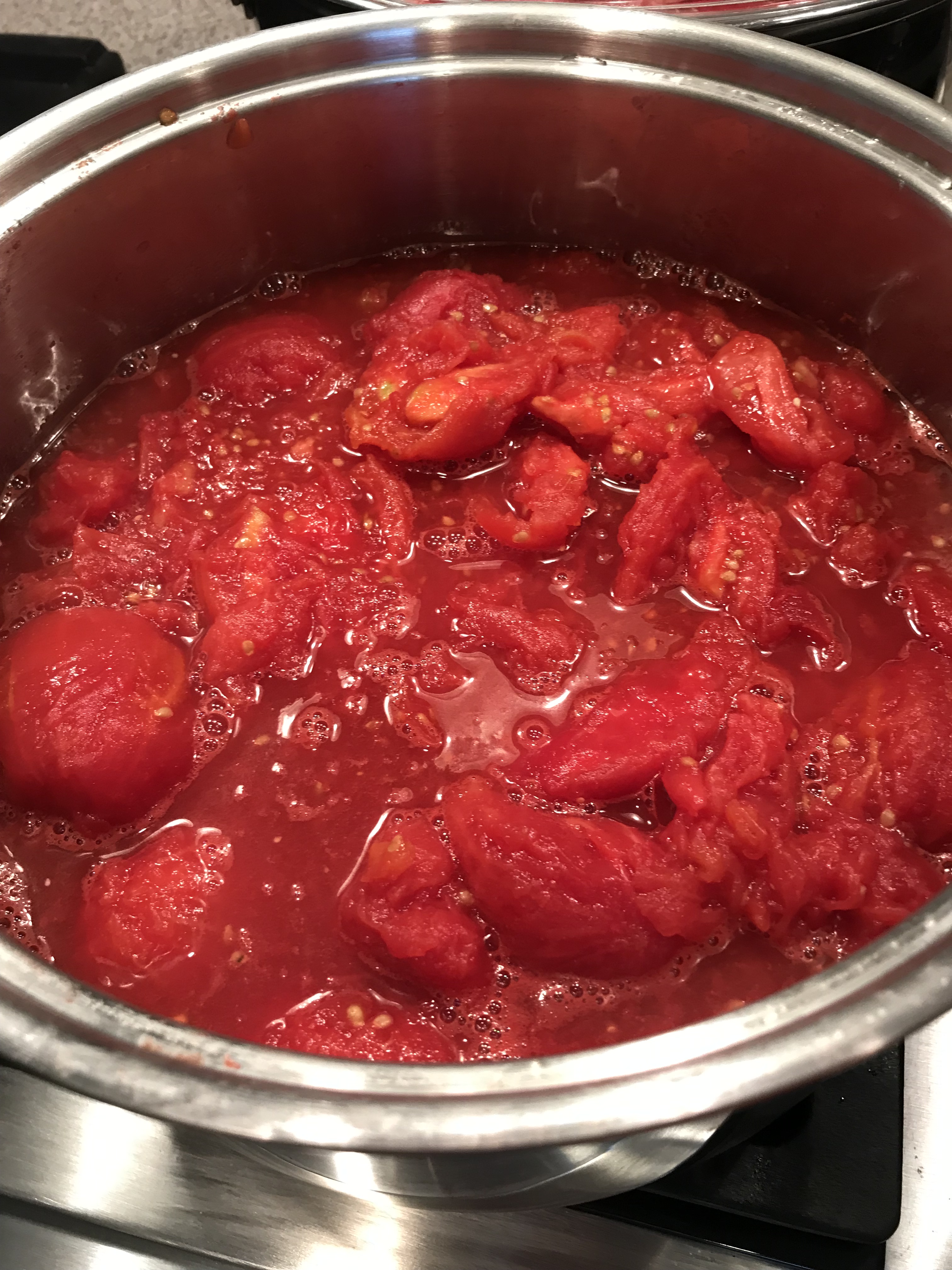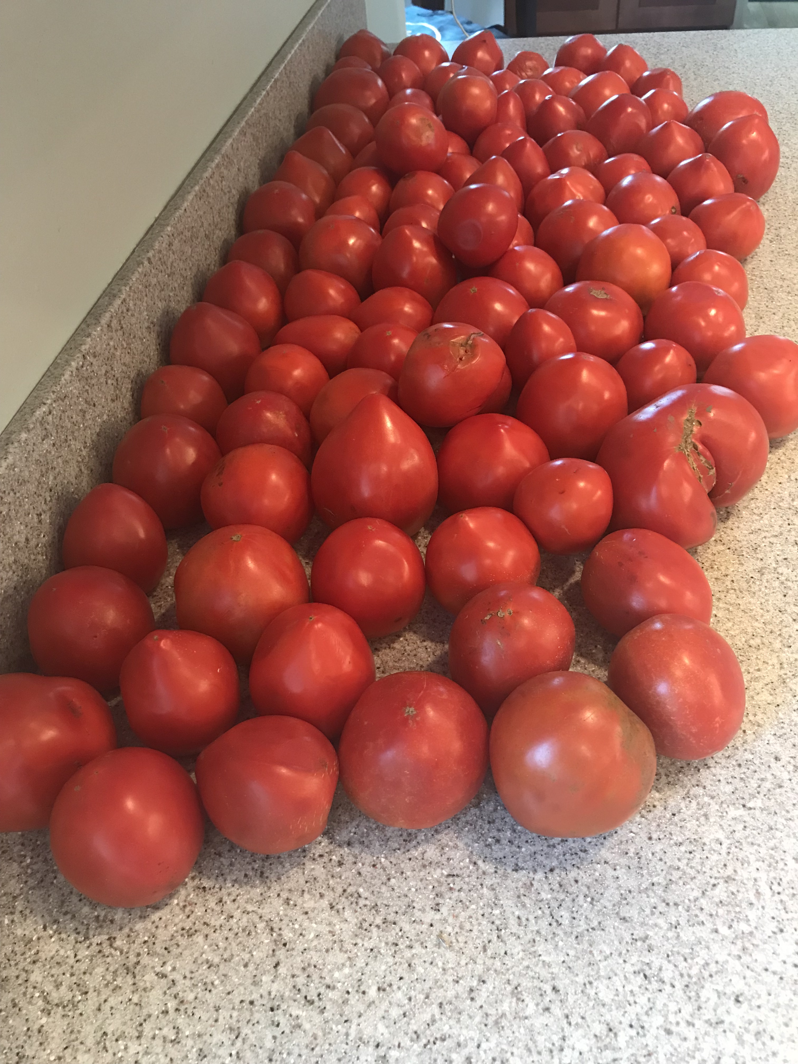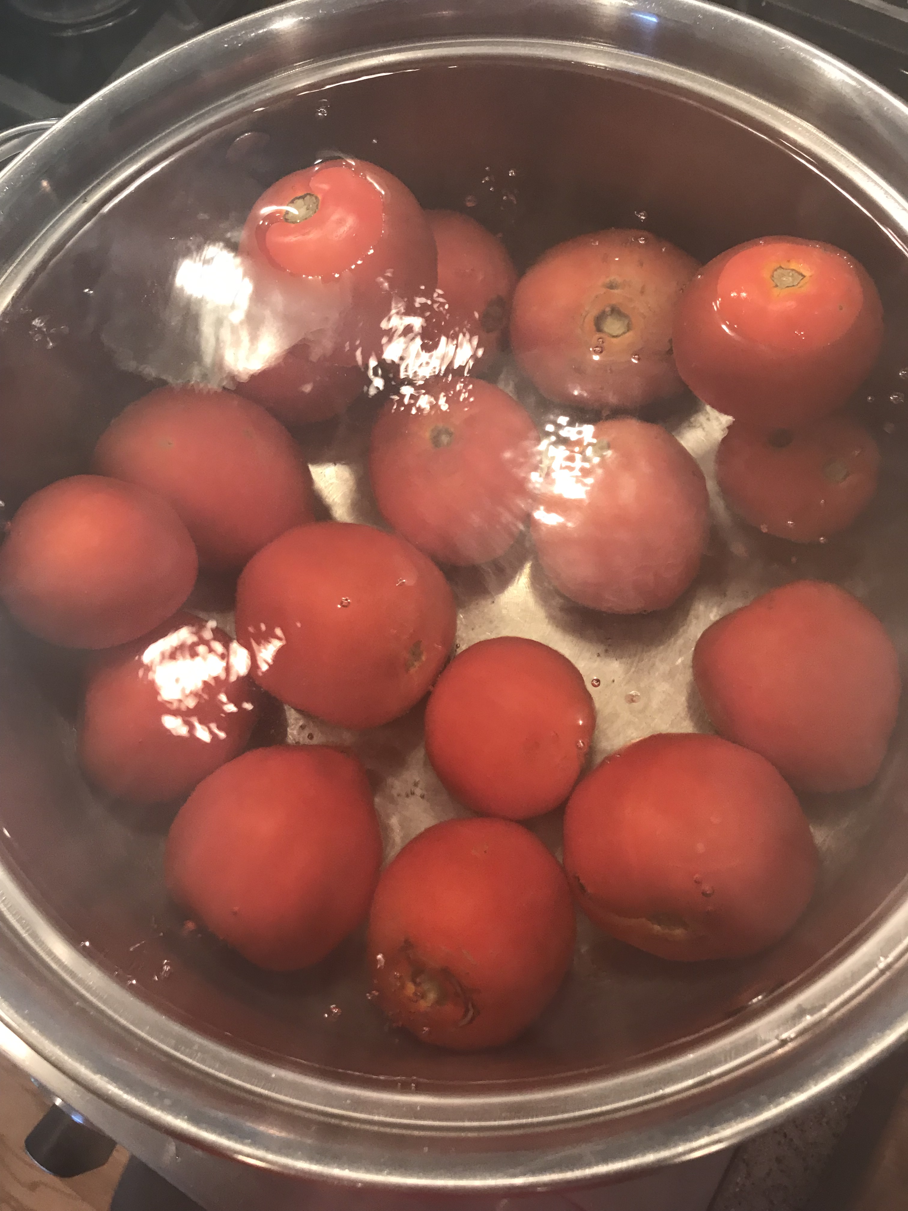 Start by putting all the tomatoes in a sink full of cold water to give them a quick rinse to get whatever leaves and dirt are still on them. Check them out as you are removing them from the sink. Anything that has been too damaged or crushed in transit, I usually pitch. They don’t have to be perfect, remember you are going to peel and core them too. Now you are ready to get started.