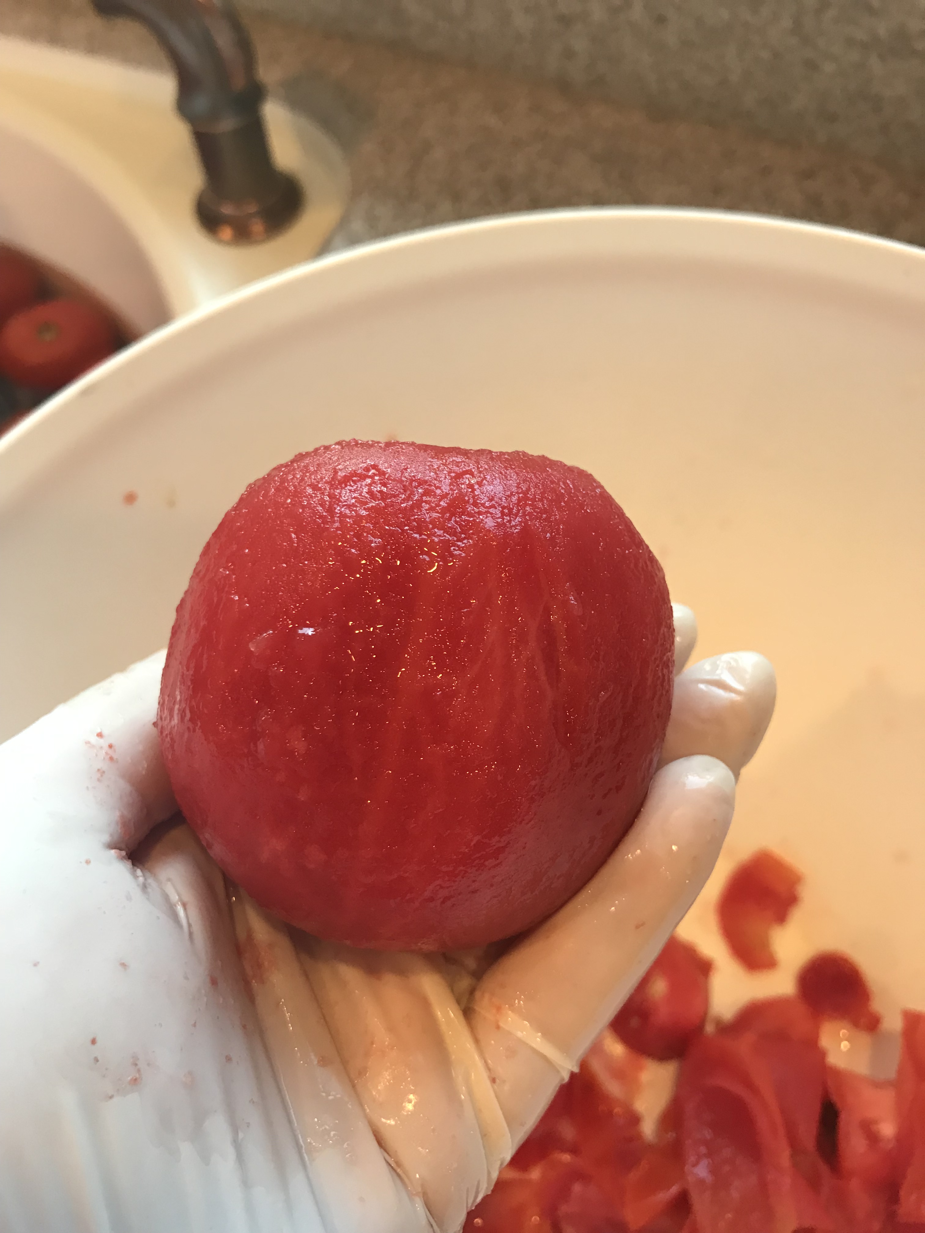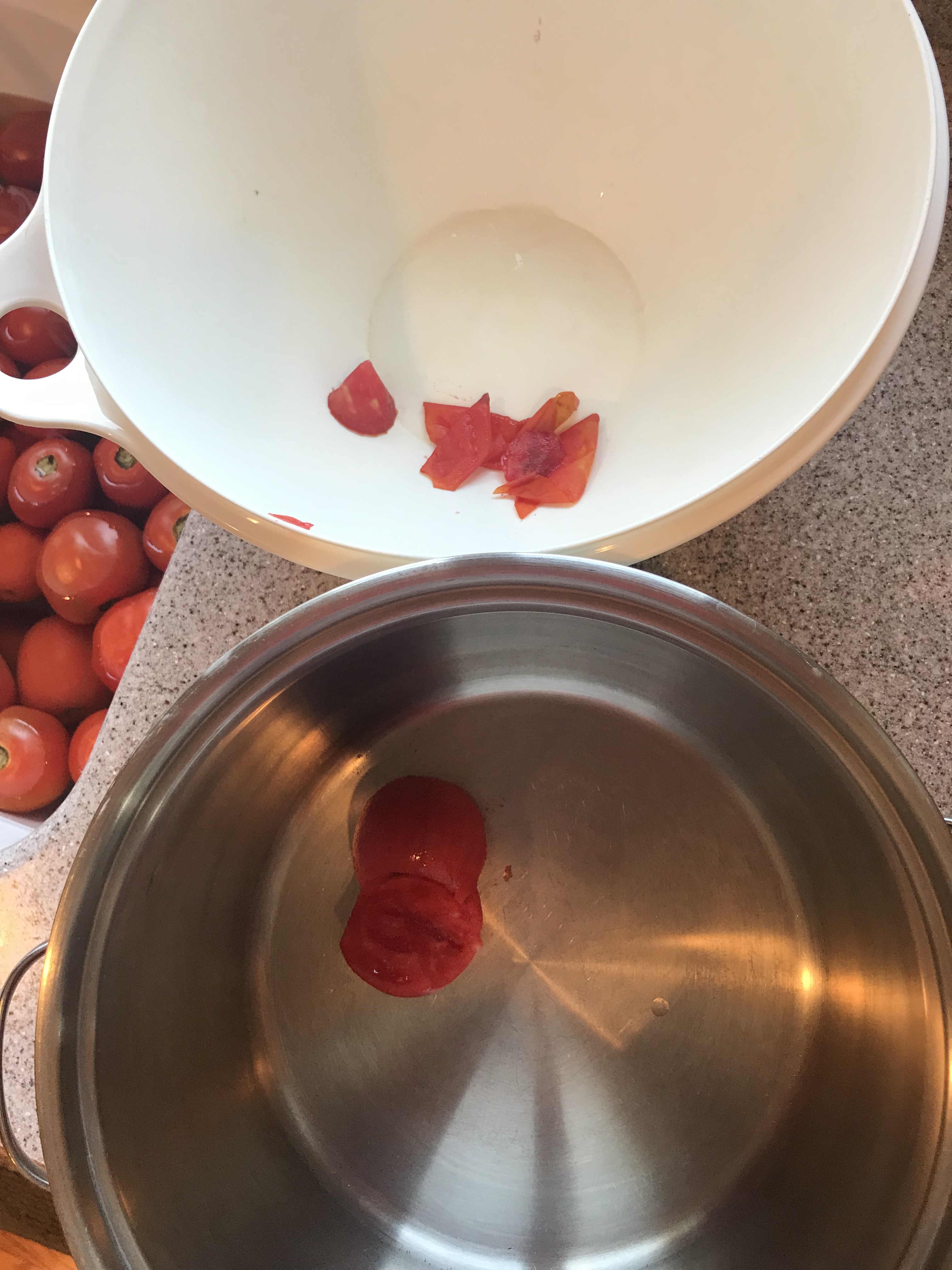 After you give these guys a quick bath, start filling up your sink again with very cold water and ice. Bring a large stockpot of water about 3/4 of the way full to a simmer. Add the tomatoes a few a at time. Let them simmer for about a minute, depending on how big the tomatoes are. The idea is just to heat up the skins so that they will slide off easily. Remove them from the hot water to a colander in a bowl so you don’t get water everywhere. Get them into the ice bath in the sink. Repeat this process until all of the tomatoes have been through the hot water and are chillin’ in the sink.