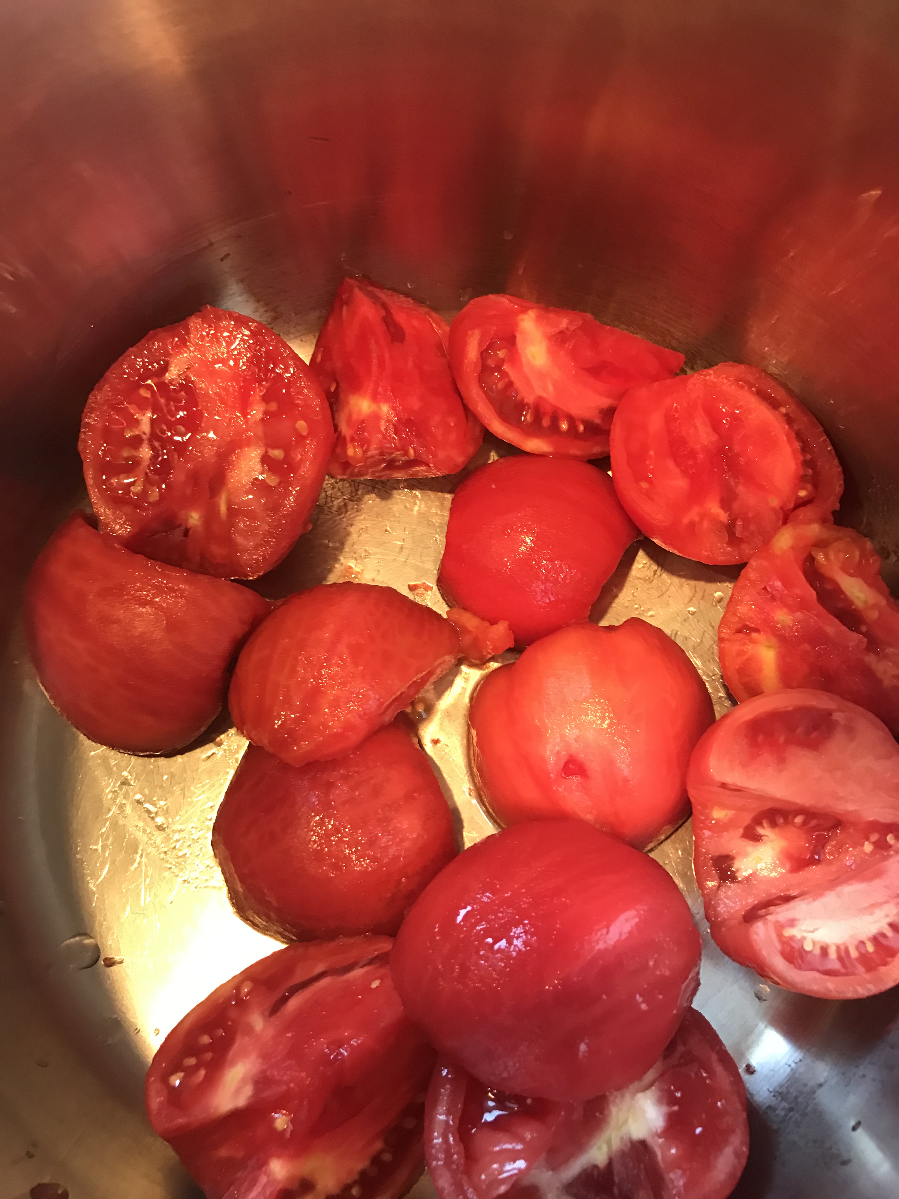 Time to cut these babies up! I set up a bowl for my peels, then a large stock pot to collect them and cook them in. I start with the core, move to the skins and then cut them up. Remove any bad spots and any hard cores that you see. As for how small to cut them, that’s up to you. I like to leave them as large as possible, so I either cut them in half or quarter larger tomatoes. Some smaller ones I even leave whole. Again, what you plan to use them for should guide how you process things.
