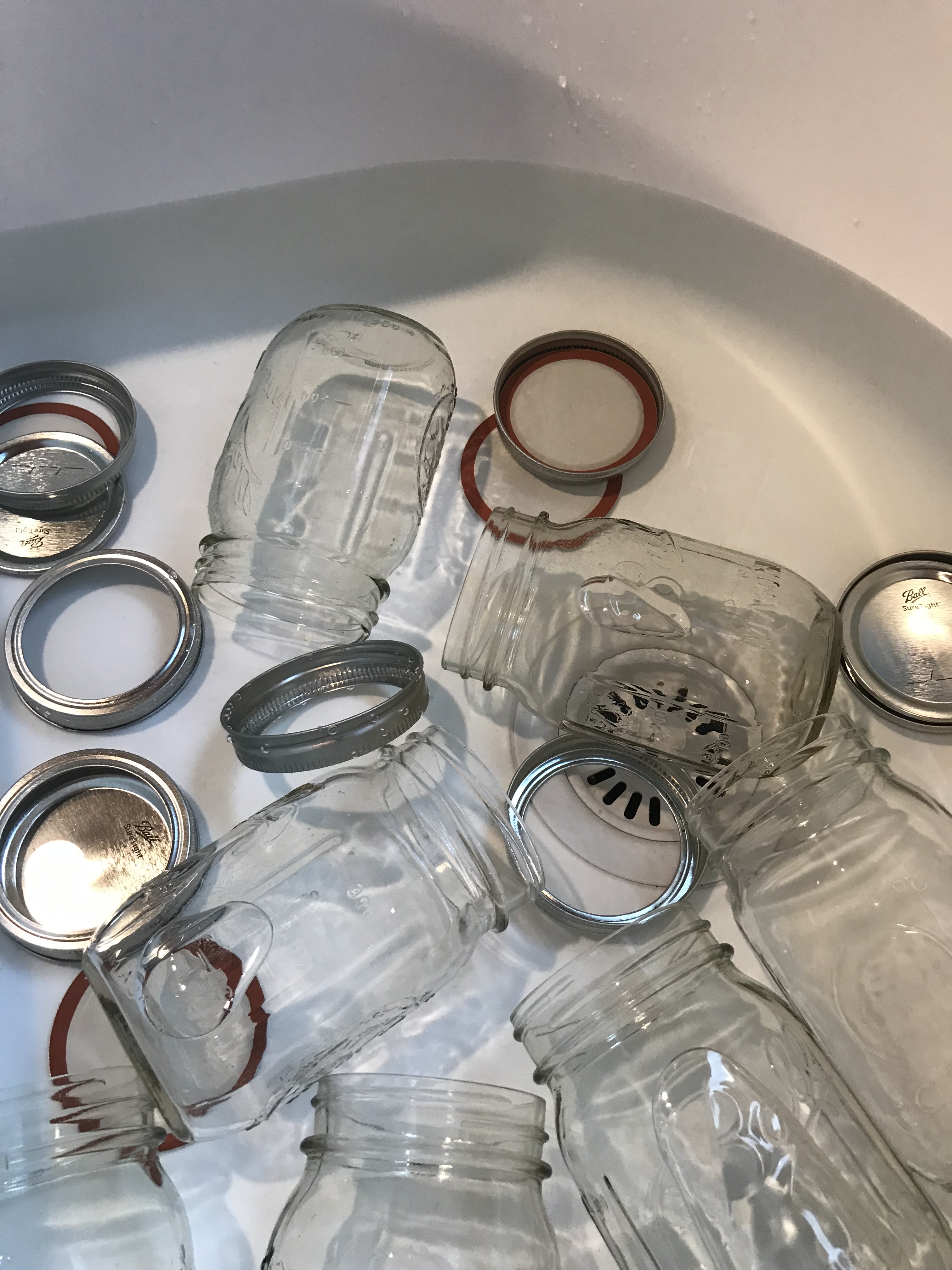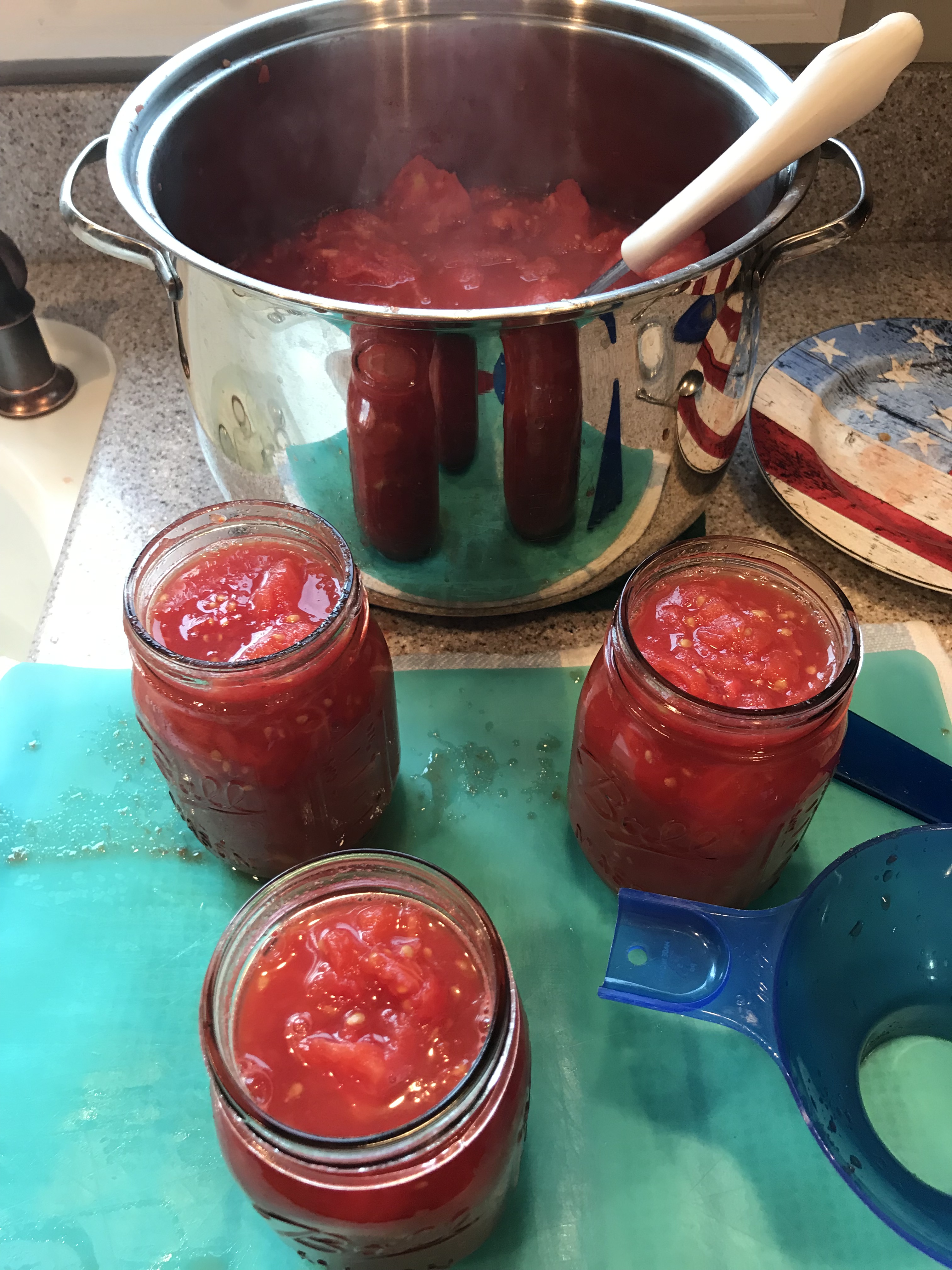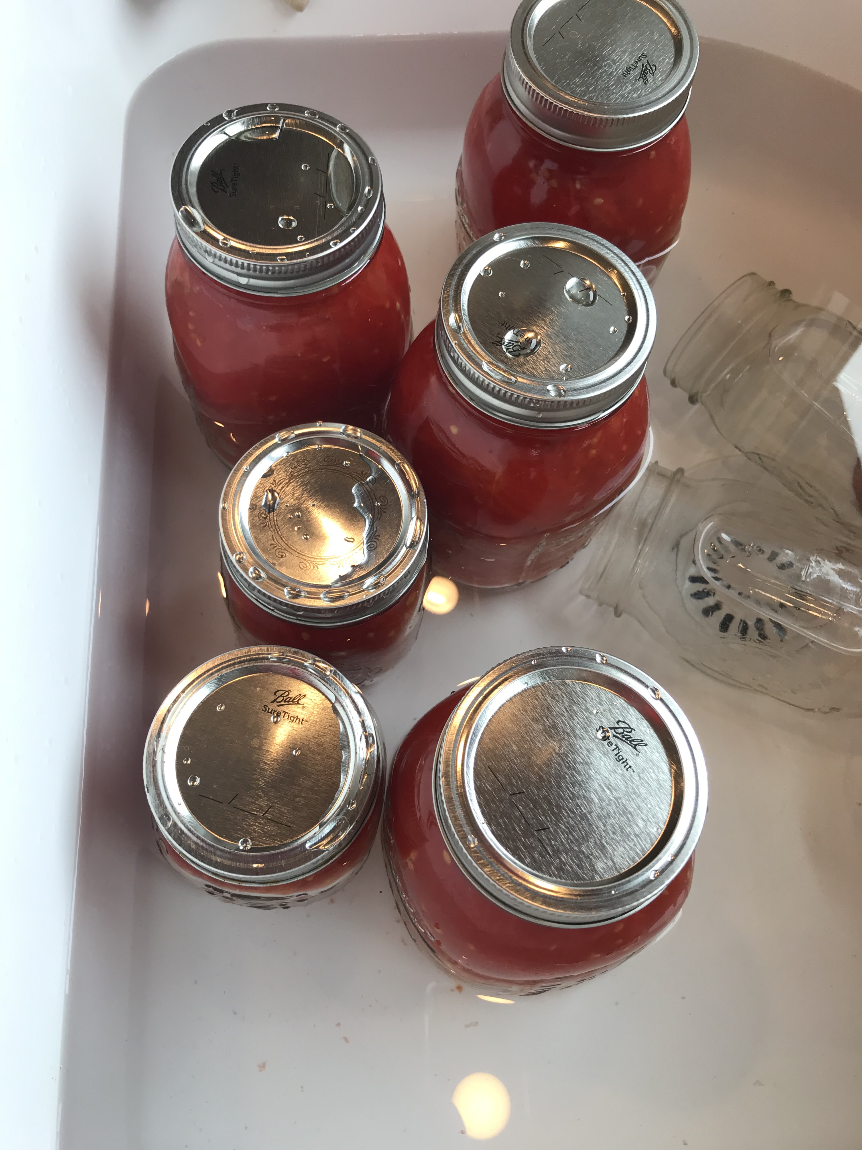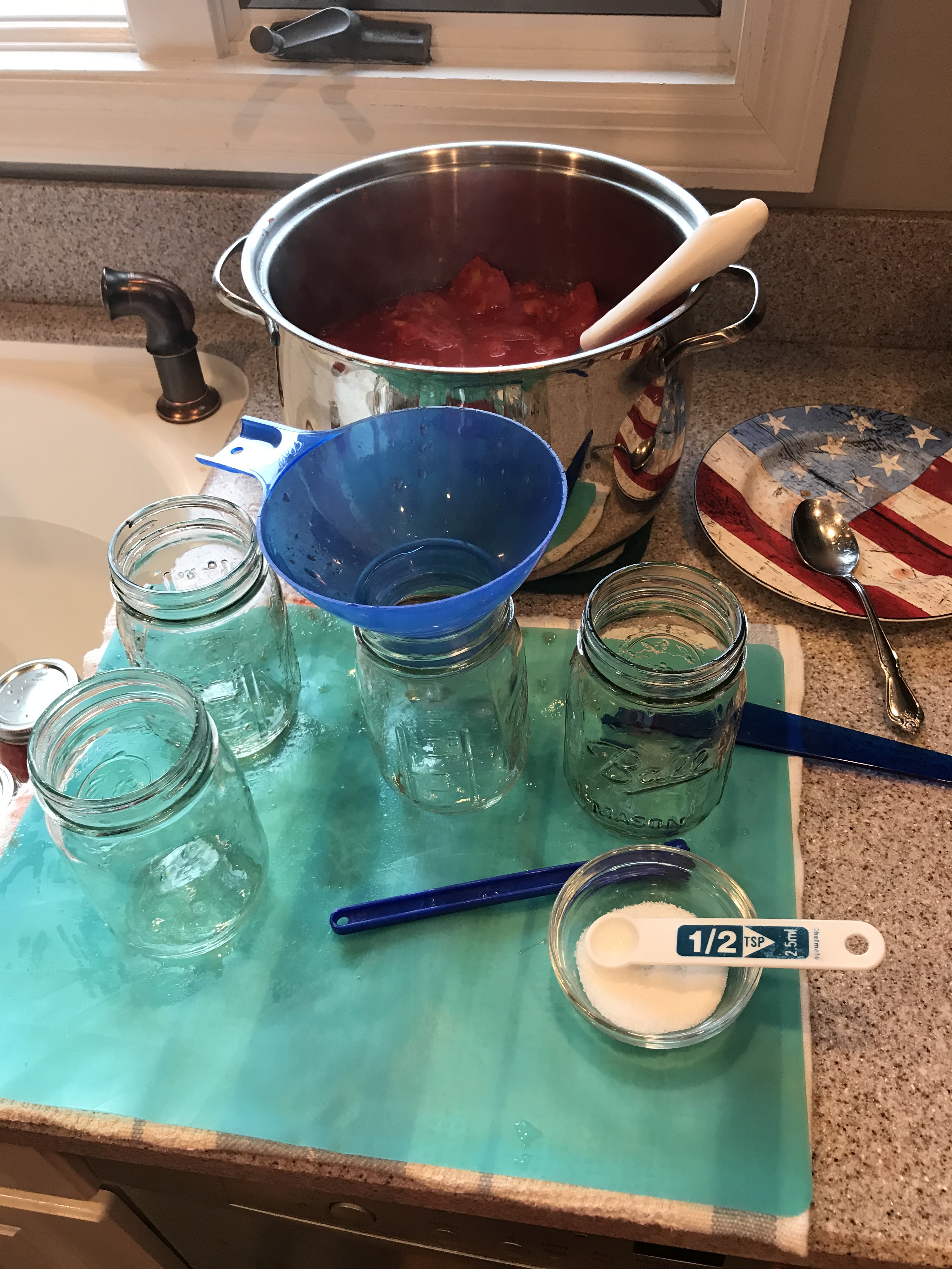 The good news is the cutting and peeling part is the hardest part of this whole thing. Now it’s time to get them in the jars. I start by fulling up my canner about 3/4 of the way full and get it on high heat to start heating up. Heat up the tomatoes on medium heat to a gentle simmer. The reason for getting them nice and hot is to kill any bacteria that could be hanging around in there. While you are waiting for the tomatoes and water to heat, start prepping the jars. Either run them in dishwasher before you start any of this process or clean them by hand in hot soapy water. Put the freshly cleaned jars into some very hot water in the sink, along with the lids. A standard canner holds 7 jars, so only heat up what you need for one canner load. I usually scrub the sink down with a little bleach cleaner before I put them in there just to clean up the mess from the tomatoes in the cooling water. If your water isn’t exgtremely hot, heat some up on the stove and add to the sink . Try to time this so that as your jars are heating up your tomatoes are almost heated through. Be VERY careful with all this hot stuff going on. It’s easy to get distracted and end up in the ER – that’s a NO! NO!