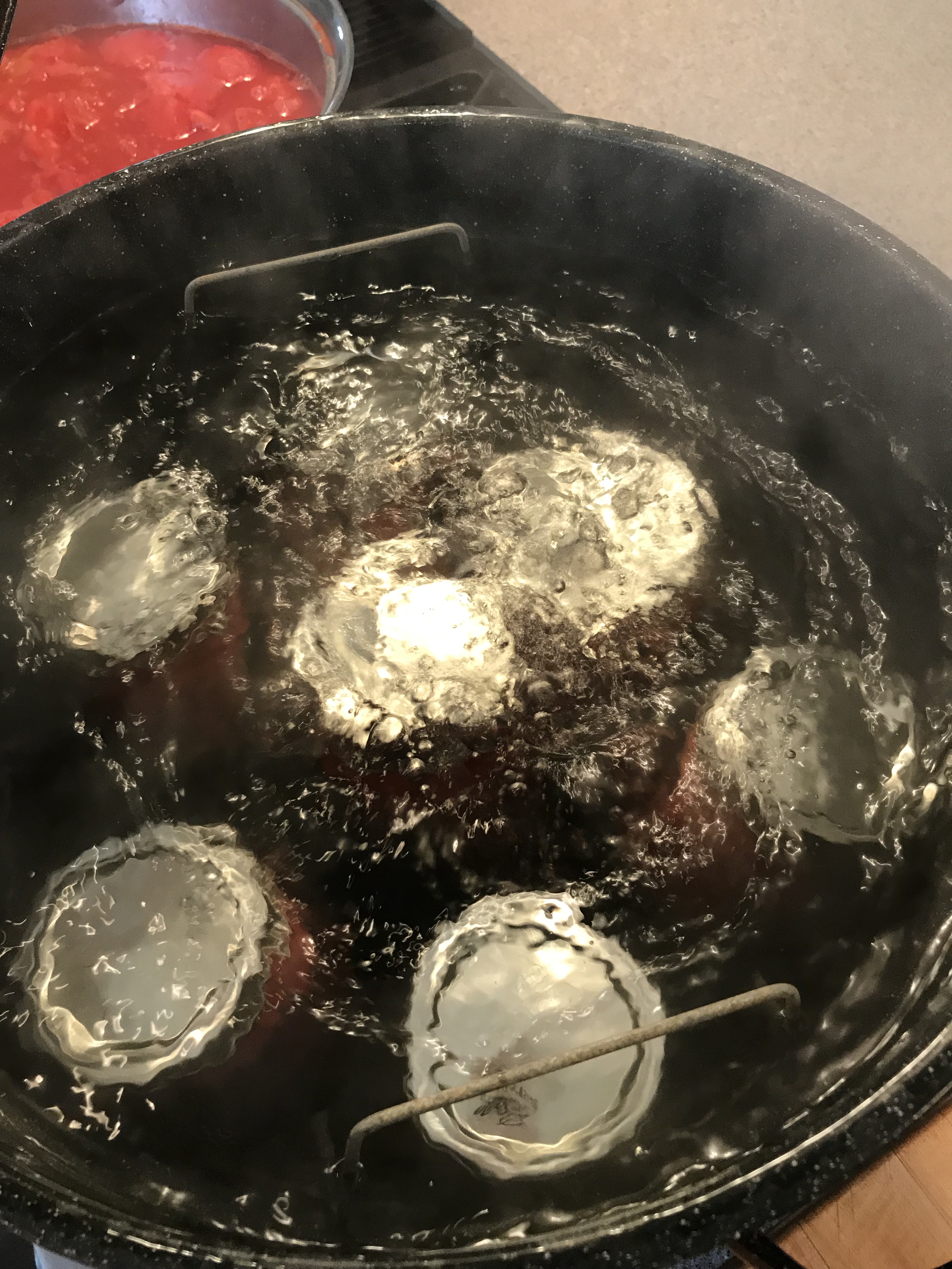 Jar time! I get a station set up with a towel and/or a cutting board underneath. You will need your jars, lids, extra towel for cleanup, salt with a 1/2 teaspoon (for pints) or a tablespoon (for quarts), a funnel, silicone spatula, jar lifter, spoon and the magnet to fish you lids out of the hot water. Grab a jar from the water and drain it, and pack it full of tomatoes use the funnel to help you. Leave about a 1/2 inch head space to start. Use the spatula to run down the sides to remove any air pockets. Add some additional juice to the jar if needed. For pints add 1/2 teaspoon of salt, for quarts add a whole teaspoon. Wipe off the rim and top of the jar to make sure you get a good seal. Put the lid and ring on and tighten, but no need to get TOO tight. Just enough so that it’s sealed. If the canner is not up to a simmer yet you can just use the jar lifter to put them back in the hot water. Fill the rest of the jars until you get 7 completed. As soon as the water in the canner is up to a boil add them to the canner. Make sure the jars are covered by about an inch of water. Make sure they come back up to a rolling boil, then set to a simmer. Set a timer for 40 minutes for pints, and 45 minutes for quarts.