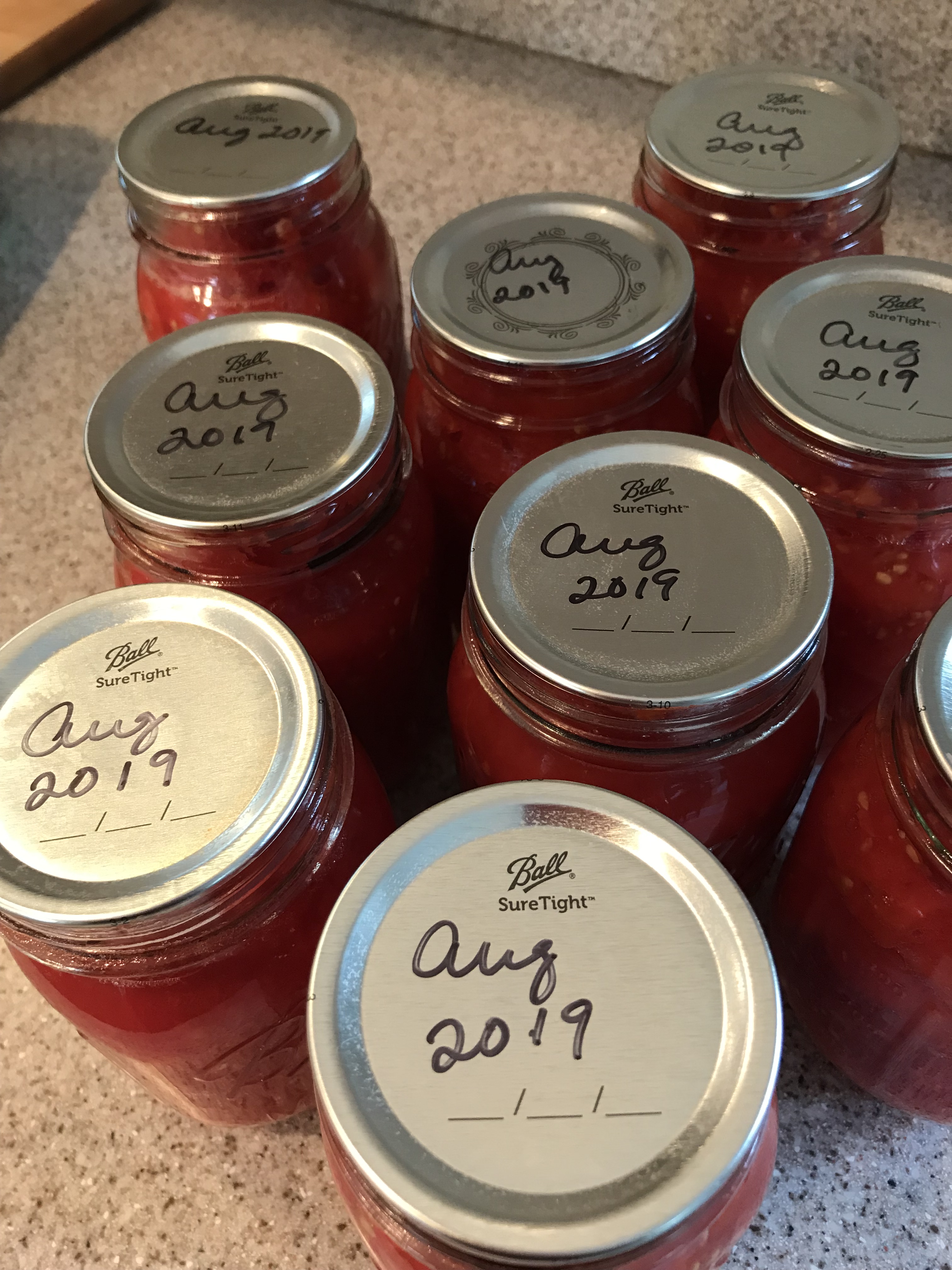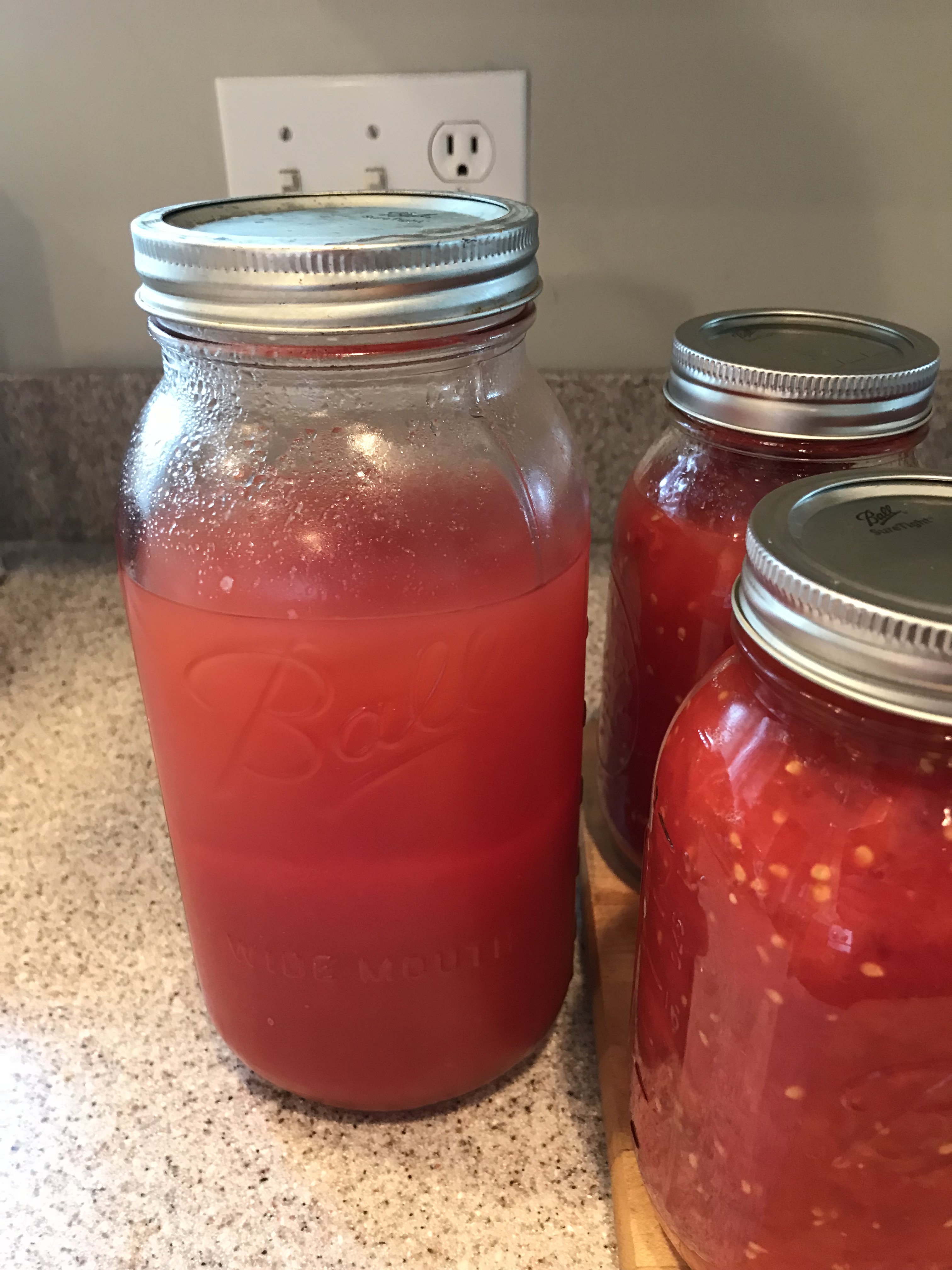Note: You can save all that juice that is left and process it as tomato juice. The LARGE jar in the picture is what was left after I strained it through a fine sieve. Let this sit in the fridge for a few days and separate out the water on the top from the sauce on the bottom. The more you strain out, the thicker the juice/sauce will end up. Can this using the same process – heat up the jars and juice, fil up the jars, add salt and process in the canner. Excellent bloody Mary base…I’m just sayin’. 🙂