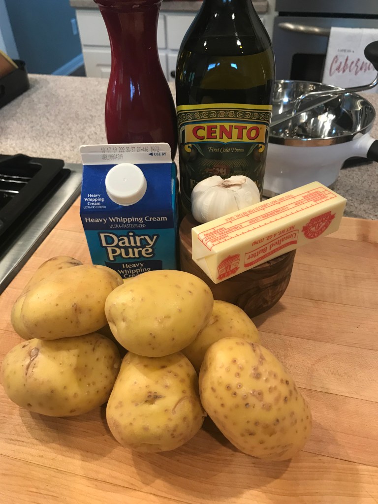 Here’s all you need for this recipe of roasted garlic whipped potatoes via a food mill. You can sub Idaho potatoes, regular milk and leave out the garlic. This is pretty basic: