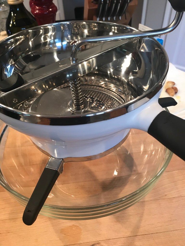 I bought a food mill a few years ago to make and can apple sauce. I keep seeing food shows with people making mashed potatoes using it. I was raised on the hand held mixer version of mashed potatoes, so I was wondering what the big deal was? I was worried that the potatoes would cool off too much before I got them all processed, so I never really tried it – until last week.