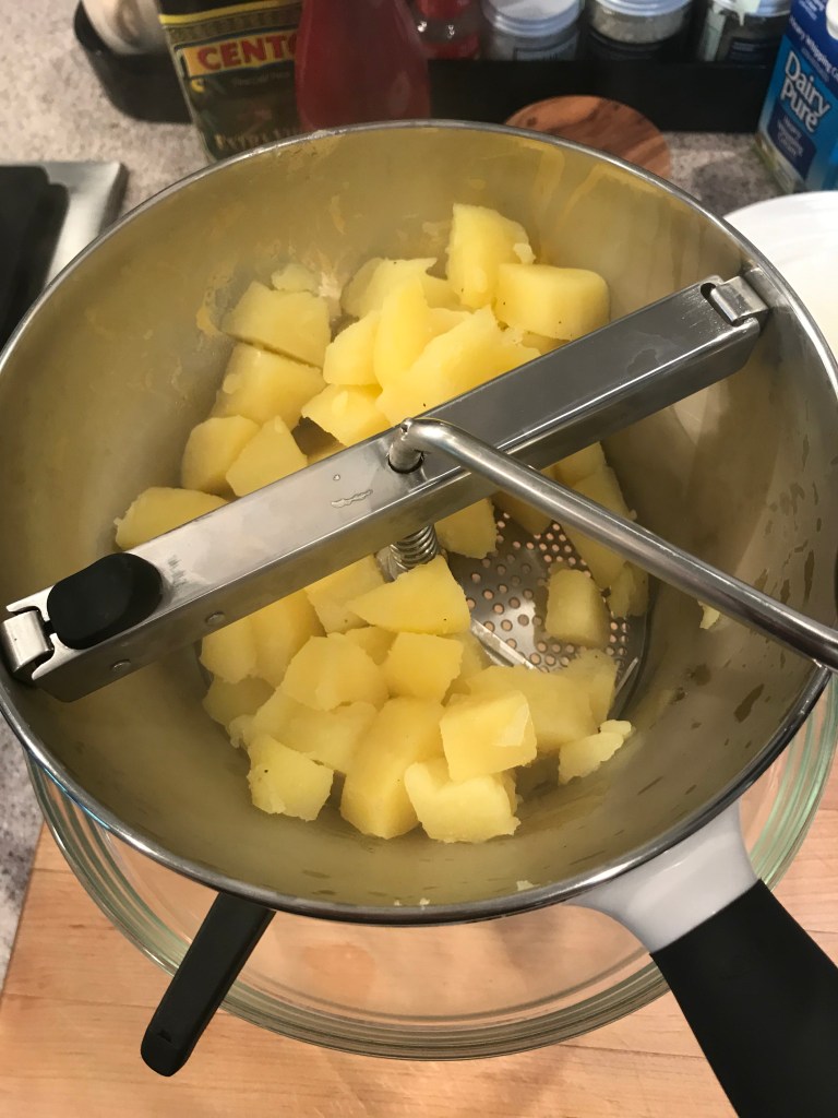 Heat the cream and butter up in a small saucepan over low heat. You just want to warm it up and melt the butter, not boil or scald it. Once the potatoes are finished, drain them and return to the hot pan. Place your food mill over a mixing bowl. Place a layer of potatoes in the food mill and start spinning. Rotate the blade backwards to clean off the bottom every few turns. Add more potatoes as they process through the food mill. Squeeze the garlic out of the skins and drop them into the potatoes and process them through the mill with the potatoes. Repeat until all the potatoes have been processed. Don’t forget to scrape off the bottom of your food mill too. Put the potatoes back in the warm pot you cooked them in. This will help them stay warm.