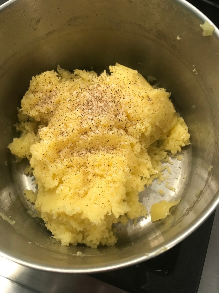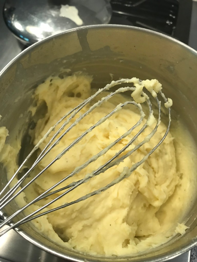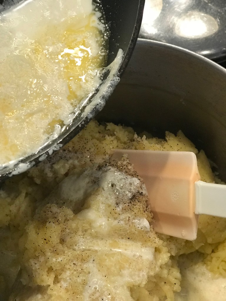 Slowly add the heated cream/butter mixture to the potatoes. I used a spatula at first, but I found that a flat whisk worked a lot better, although I did splatter cream all over the stove at one point. If you aren’t making a mess you aren’t really cooking, right?? Keep slowly adding the cream/butter until they are the consistency that you like, and add salt and pepper to taste – I like a heavy dose of fresh cracked black pepper and salt. Don’t these look lovely? I almost added a dash or two of parmesan cheese too, but maybe next time.