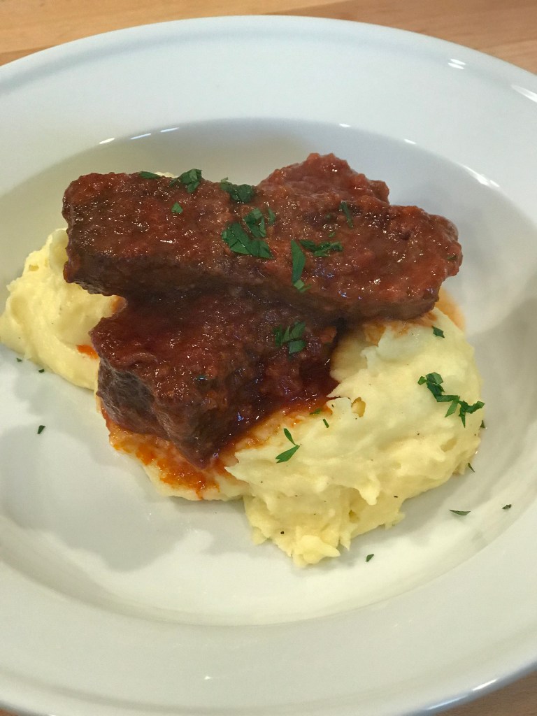 I have to admit, these are very smooth and silky potatoes, just like you would get at a high end restaurant. The cream, butter and garlic made them a tiny bit sweet, but they were really good tucked under a mound of braised beef short ribs. I would definitely make these for a dinner party or a holiday. They are worth the extra effort. Enjoy!