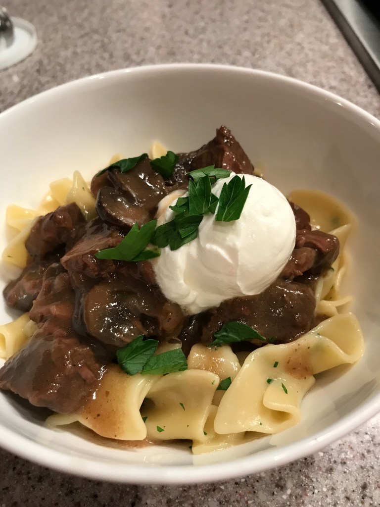 Check the roast – it’s ready when the meat is very tender and you can pull it apart with a fork. At this point, I pull the roast out to a plate and separate the broth from the veggies. Shred or chop the roast up into the size chucks you like, then return to the crock pot. To thicken the sauce, heat the liquid up in a saucepot. Mix the quick flour with the 1/4 cup of beef broth in a measuring cup until it dissolves. Whisk into the stock to make a gravy and bring to a boil. Add a good splash of heavy cream, 1/4 cup or so. Add salt and pepper to taste and pour it over the meat and stir it in. Serve over buttered egg noodles and top with some sour cream and even some parsley if you want to have fancy beef stroganoff! 🙂 Enjoy!