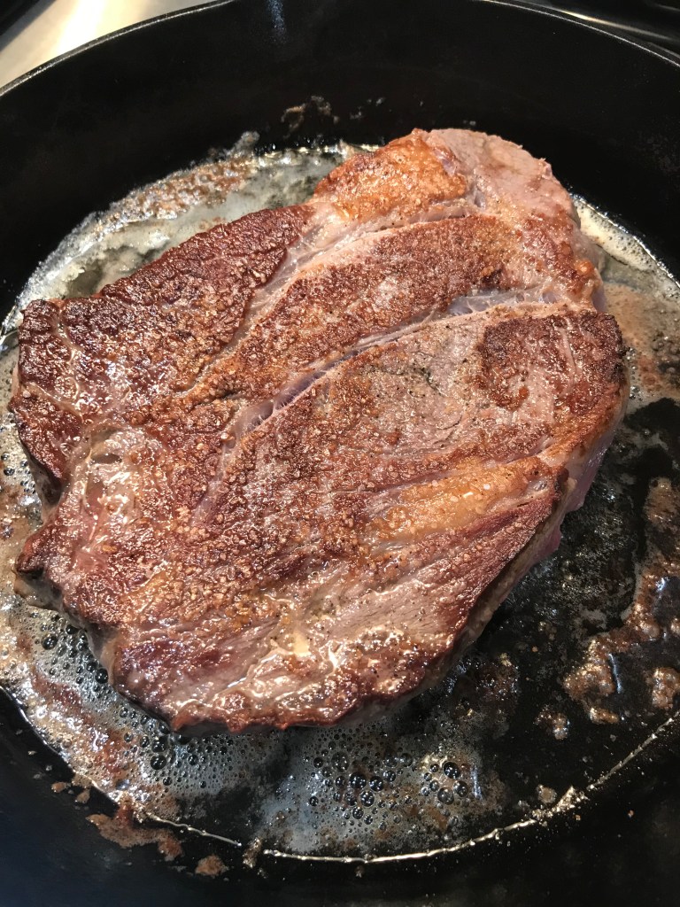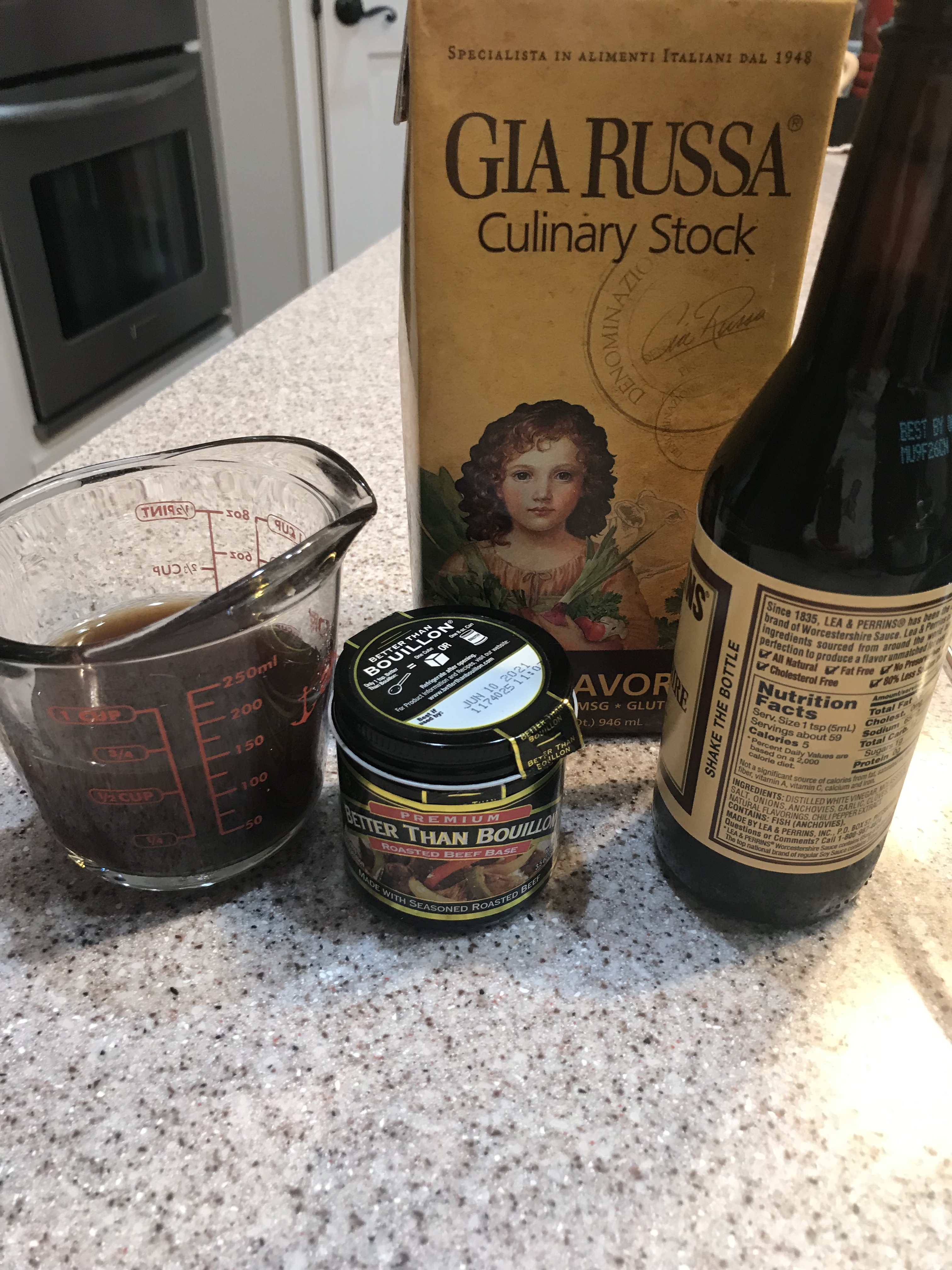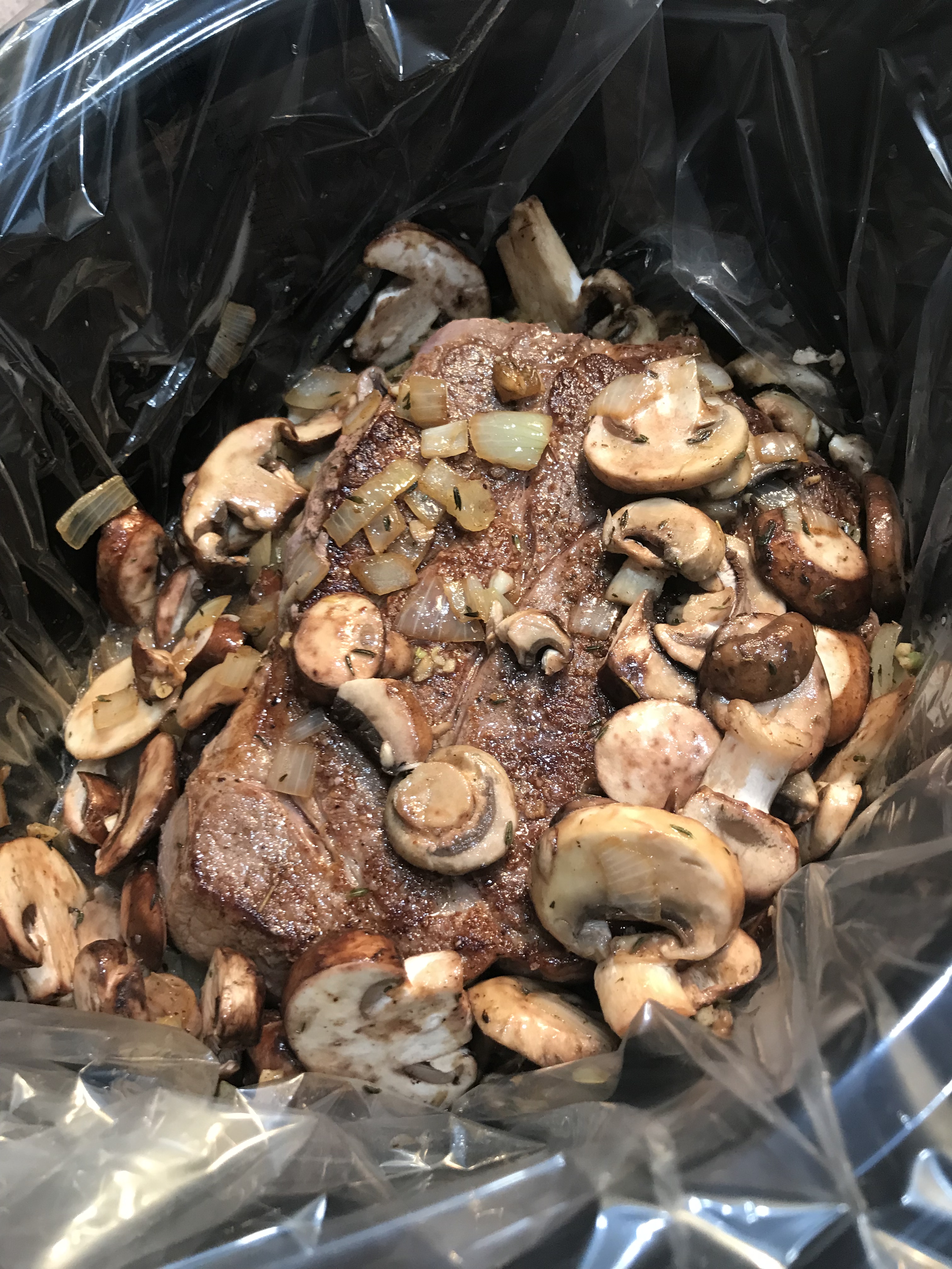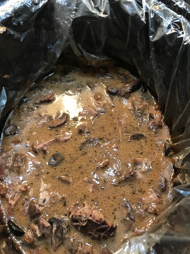 Start by coating the roast on both sides in 1 tsp kosher salt and 1/2 tsp black pepper. Add 2-3 tbs. olive oil plus 4 tbs butter to a cast iron skillet over medium high heat. (Or use whatever large skillet you have to brown in). Once the skillet and butter are hot, add the roast and brown. While the roast is browning, brush the mushrooms with a wet paper towel to remove any dirt and slice, or take some help from the store and buy them already sliced – either works. Chop the onion and garlic and set aside. Once the beef is browned on both sides, remove it to a plate. Add the onions to the skillet for about 4 minutes or until they start to soften. Be sure to scape up all that good stuff left behind in the pan by the roast. Stir in the mushrooms and cook for another 3-4 minutes until they start to brown. At this point you can and a sprinkle of salt and a few turns of black pepper, along with the garlic and thyme. Stir things together and let that cook 1-2 minutes. Add about 3/4 of the veggies to the crock pot, then the beef, then the rest of the veggies on top of the beef. Mix together the beef broth, bouillon and Worcestershire sauce and add to the crock pot and yes, use a crock pot liner if you have them! Cook on low for 6-8 hours, or adjust it to high for 4-6 hours depending on your schedule.