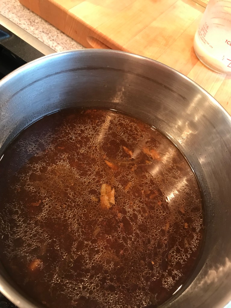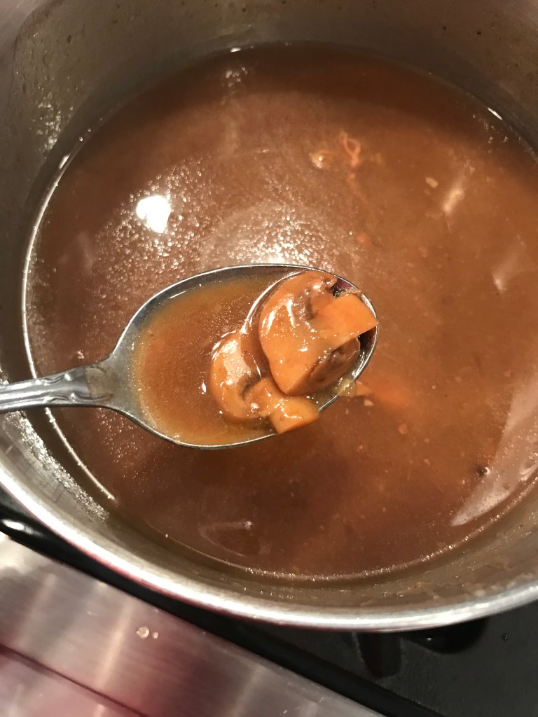 After a couple of hours and/or towards the end of your cooking time, taste for seasoning. Add salt, pepper Worcestershire, or any of the dried seasonings that you feel you need. I do this a few times during the cooking process if I’m home. No rules here, just however you want it to taste is great! Continue cooking until the meat is fork tender – it pull apart very easily with a fork turned in it – then remove the meat to a rimmed baking sheet. Use a couple of forks or a knife to shred/chop the meat into the size chunks you like. Ladle out most of the cooking liquid from the crock pot and put it in a stock pot. It’s OK if you grab a mushroom or two…they are all going back in the same pot eventually. Return the shredded meat to the crock pot and put the lid back on. Lower the temp to Low if you were cooking on high, just to keep it warm.