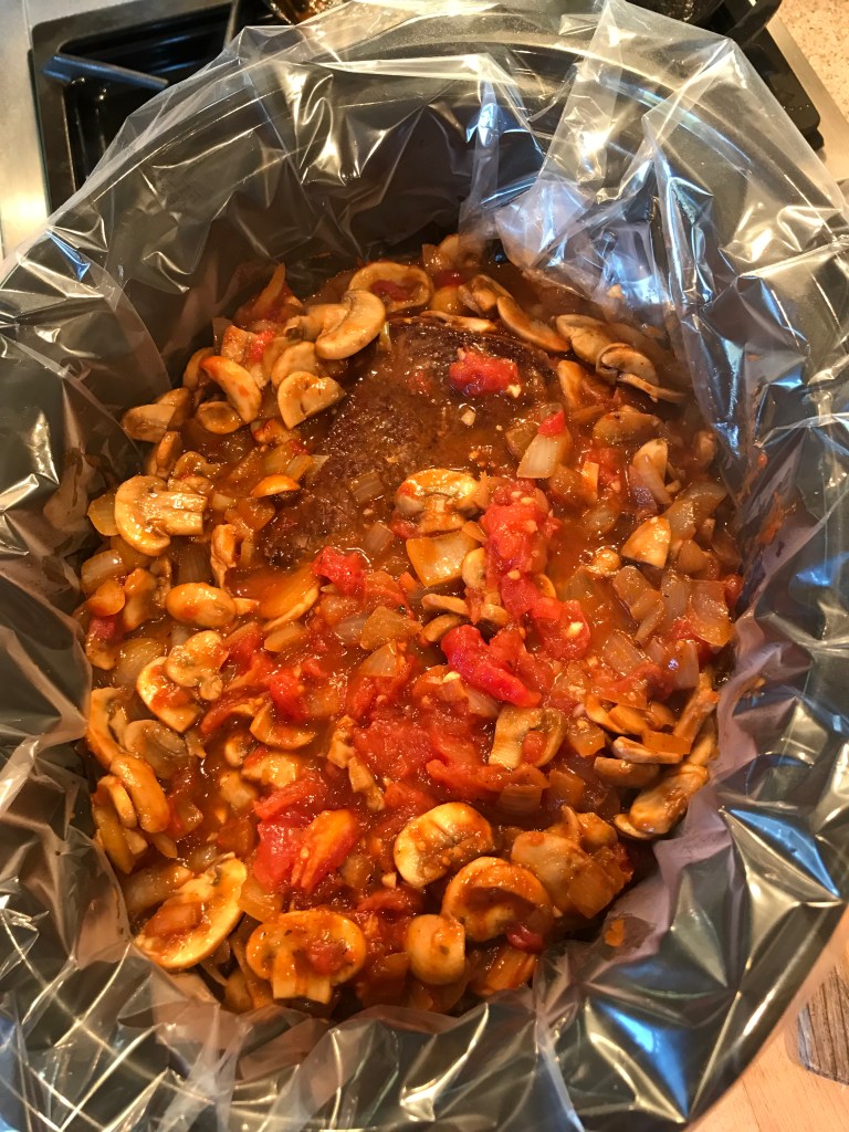 In the same skillet, add the remaining 2 tablespoons of butter and cook the onion and mushrooms until they just start to soften, about 5 minutes. Stir in the tomato paste and let that cook out for about 2-3 minutes. Stir in the tomatoes, Worcestershire, dried thyme and oregano, bouillion, about 1/2 teaspoon of salt and a few grinds of fresh cracked pepper. Stir together and pour over the beef in the crock pot. Add the remaining 1 cup of beef stock and make sure the meat is mostly submerged in the cooking liquid. Add a little more stock if needed. Cook in the crock pot on high temp for 4-5 hours or on low for 6-8 hours. Whatever works for your scheduled is fine…it will be great either way.