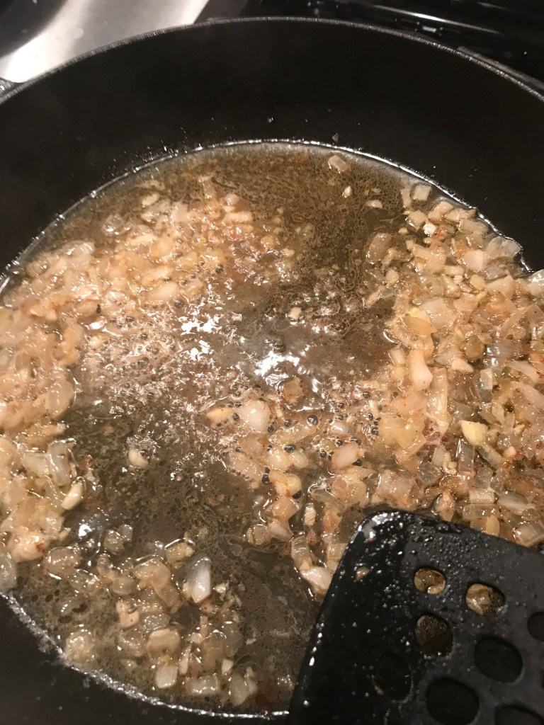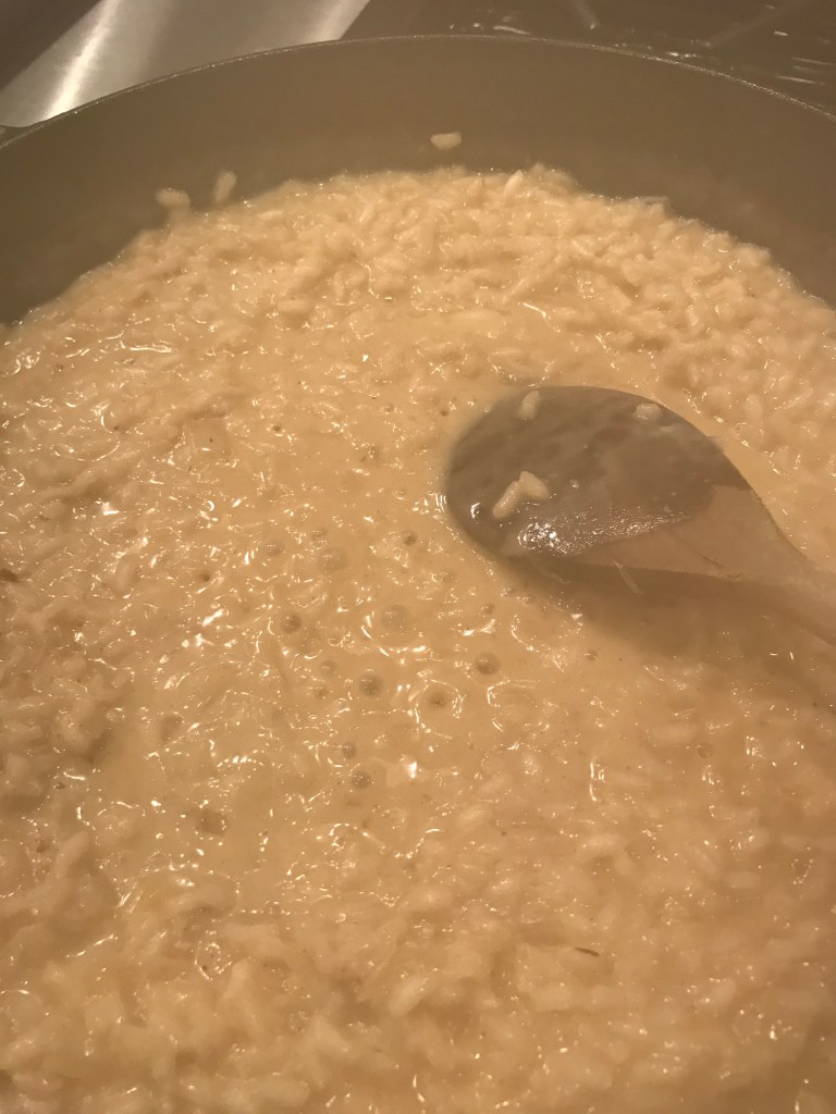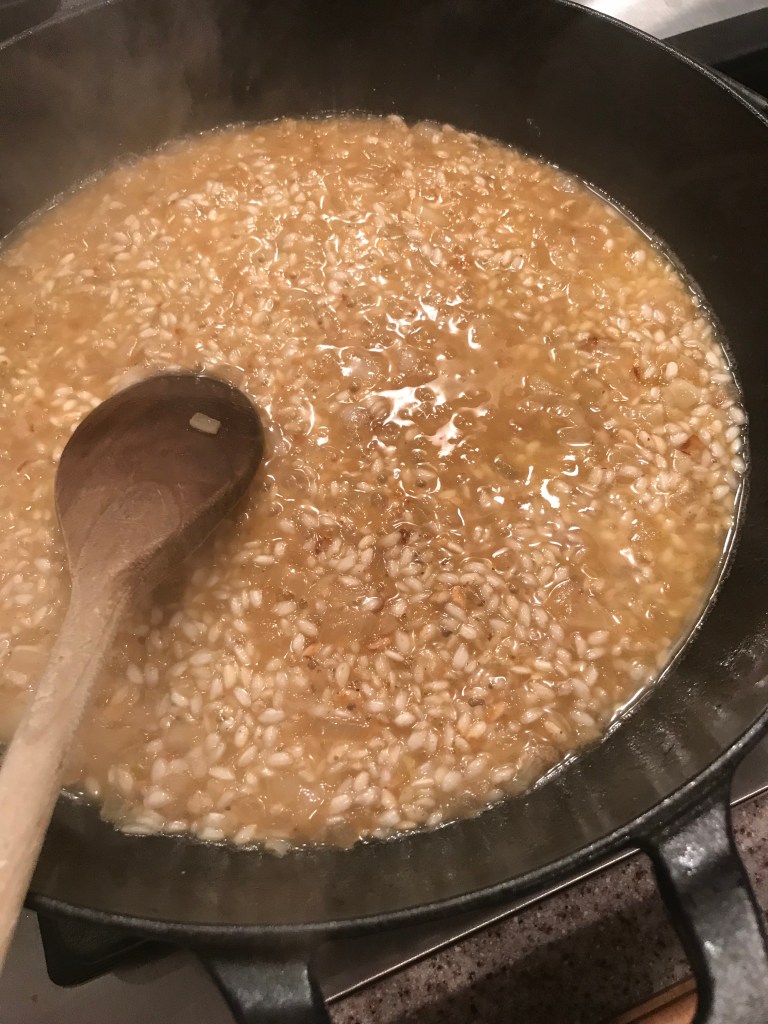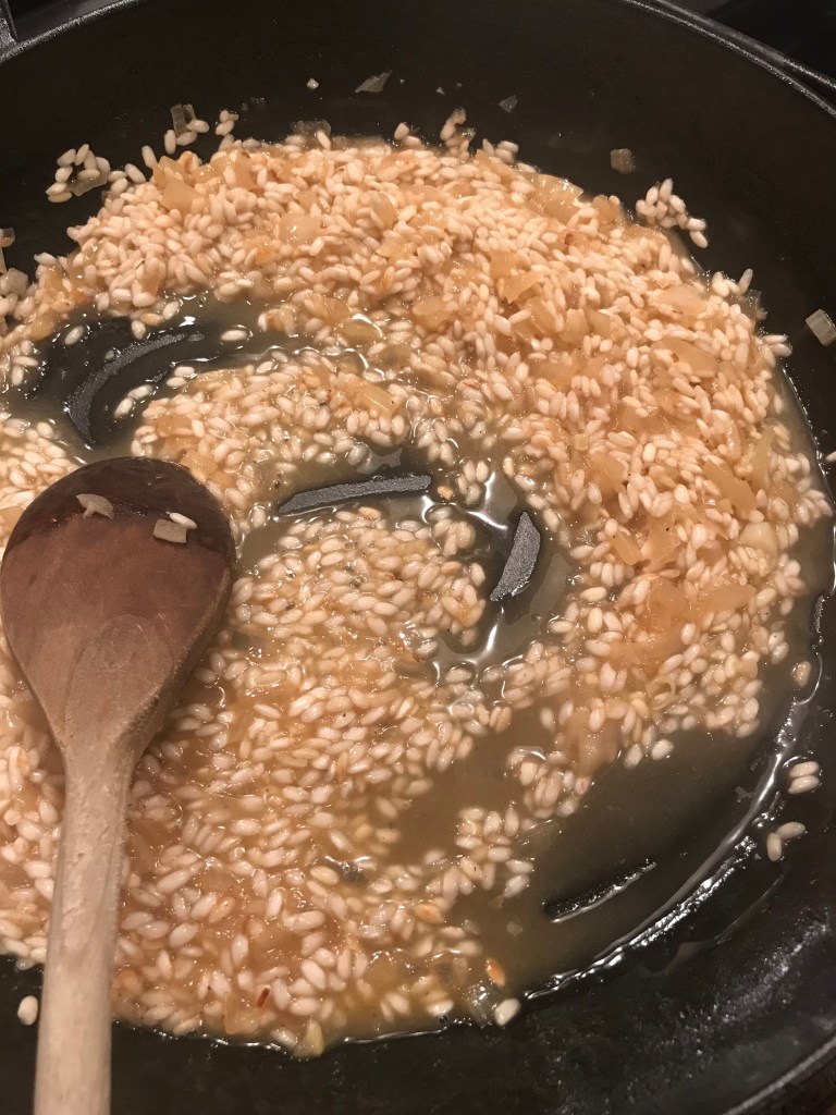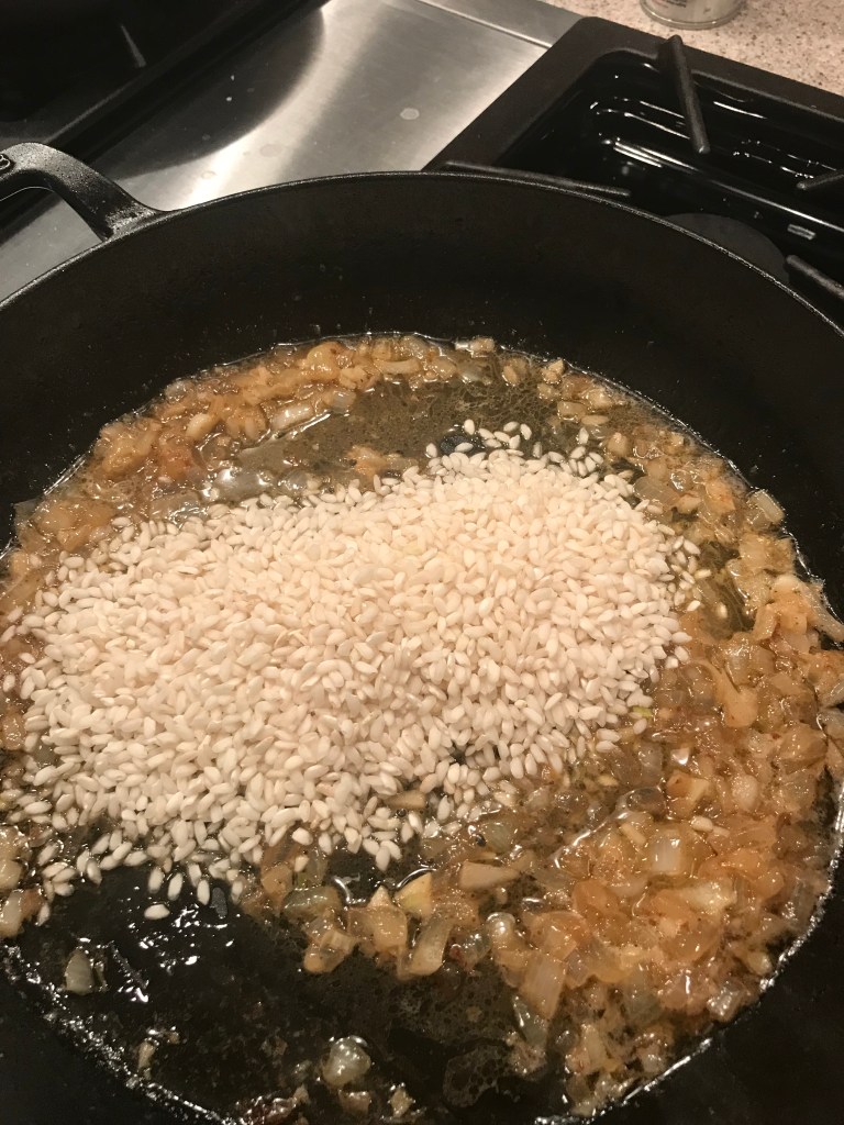 Depending on how much of the oil/butter combo is left in the pan, you may havce to add about 2 more tablespoons of butter, so you have about 4 tbs totoal. Lower the heat to medium. Add the chopped onion to the pan and season with salt and pepper (about 1/2 teaspoon salt to start). Let that cook until the onion is translucent, about 8 – 10 minutes. Add the garlic and the rice and stir to coat the rice with the butter/oil. Saute the rice for about 1-2 minutes to toast the rice. Take your skillet off the heat and add the wine – return the pan to the heat and all ow the wine to deglaze the pan and burn off the alcohol. (Note: You can just use 1/2 cup of stock if you are skipping the wine- no problem) Add 1-2 lades of stock to the rice and stir constantly until the liquid is absorbed. Repeat with another 1-2 ladels of stock, stirring until the liquid is absorbed. You will need to repeat this process 4-6 times until the rice is tender, about 20-25 minutes. Taste the rice when you get to the 4th and 5th addition of stock, making sure the rice is getting tender. Season with salt/pepper as you go too.
