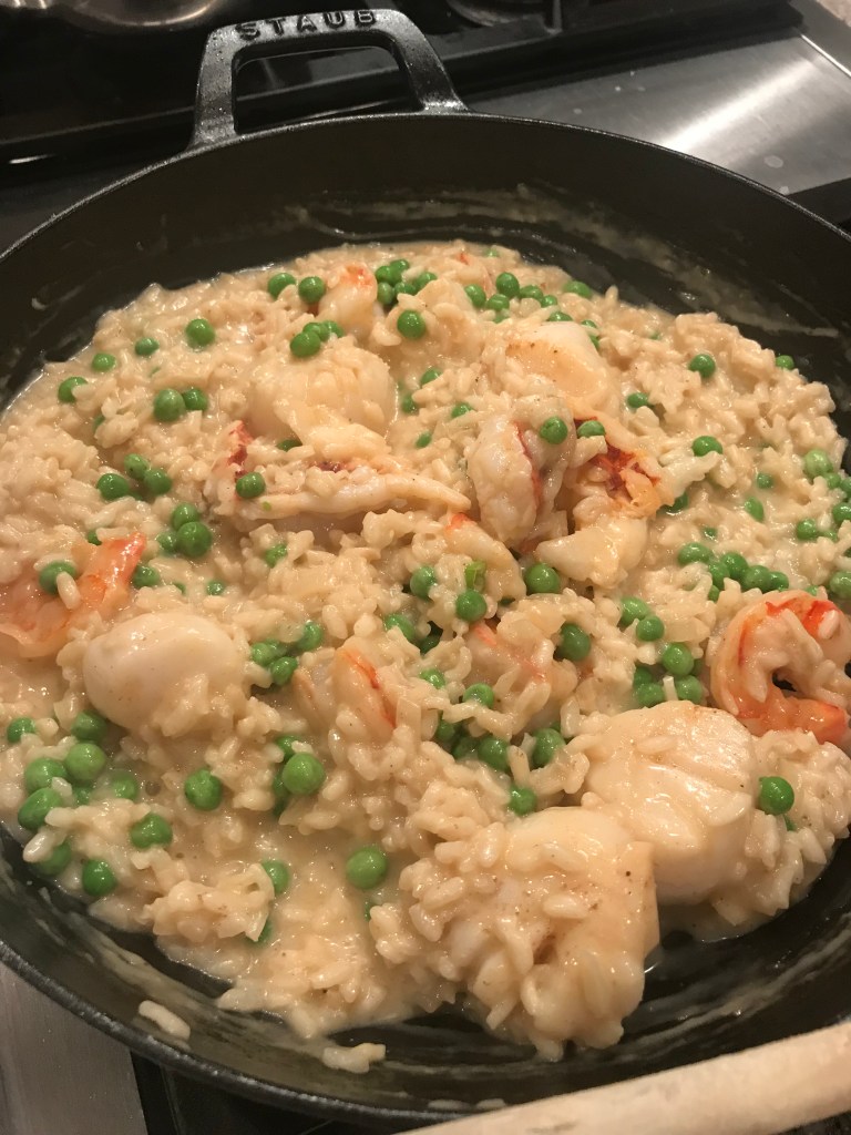 My sister has asked me to make her some seafood risotto for her (very belated) birthday dinner. When she asked, I could not remember if I had ever made a seafood risotto, although I was sure I’d made other types of risotto. So I decided to do a little practice just to make sure I knew what I was doing, since she wants to learn how to make this at the same time. Not a problem really. The trick is to make sure that you cook the seafood at different times to make sure they are cooked correctly. This rice part of this recipe takes some attention, but it’s worth it and it’s really just a lot of stirring. To finish, you just toss the seafood into the finished risotto and you have an awesome dish!