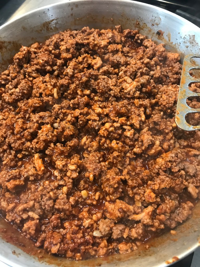For the filling – heat 1 tbsp. of olive oil in a large skillet over medium heat. Add the ground meat and sprinkle with about 1 tsp of salt and a few turns of fresh black pepper. Cook the meat, stirring often until it is all cooked through. Drain off any extra grease. Add the garlic and allow that to cook for 2-3 minutes. Stir in all the dried spices – chili powders, onion powder, cumin, oregano, salt, pepper, cayenne. Let the spices start to warm up and then add the tomato sauce. Turn the heat to low, and let that simmer for 10-15 minutes to allow the flavors to combine.