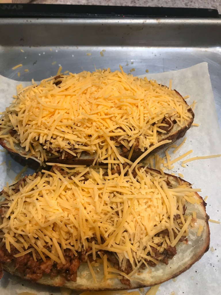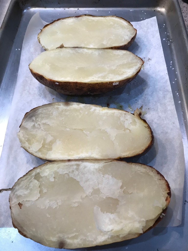 For the potatoes – scrum them clean and pat them dry. Coat them with olive oil, salt and pepper. Cook in a 400 degree oven for about 45-60 minutes depending on the size of your potatoes. The internal temperature should be 300 for a potato to be cooked through. Remove from the oven and allow them too cool before prepping for the filings.