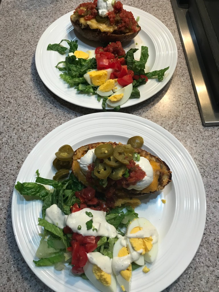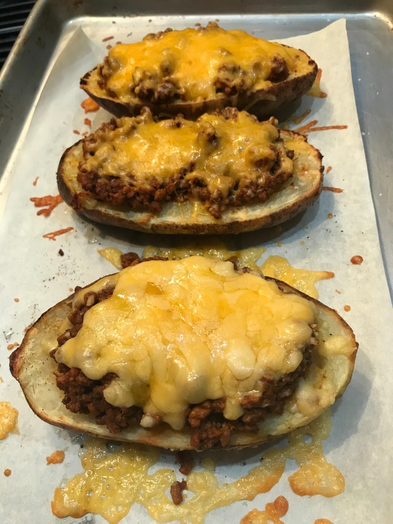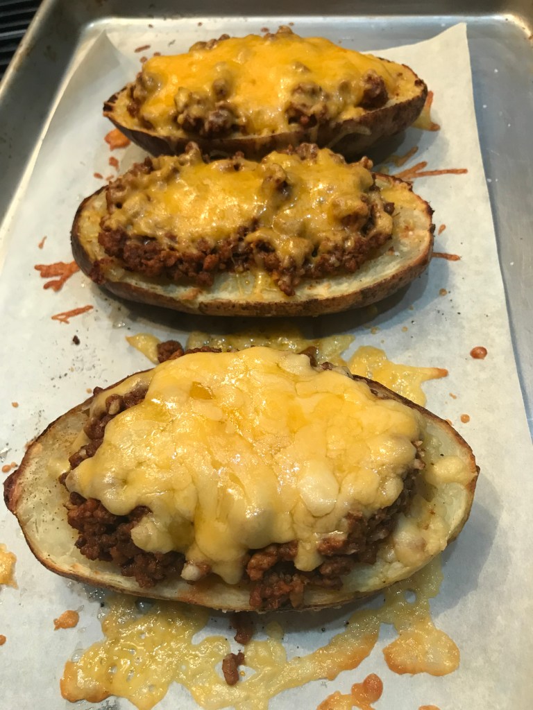 Cut the potatoes in half and scoop out some of the insides. (Use these leftovers in a frittata for breakfast!) Place a little butter in the bottom and sprinkle with salt and pepper. Fill with as much filling as you’d like (you can also add a layer of refried beans in the bottom if you are in the mood) and top with some grated cheese I used cheddar here, but pepper or regular monetary jack cheese would be great – or mix it up will all of those. Whatever you like will work as long as it melts nicely. Toss in the oven at 350 for 10 – 15 minutes until the cheese melts and every thing is nice and hot.