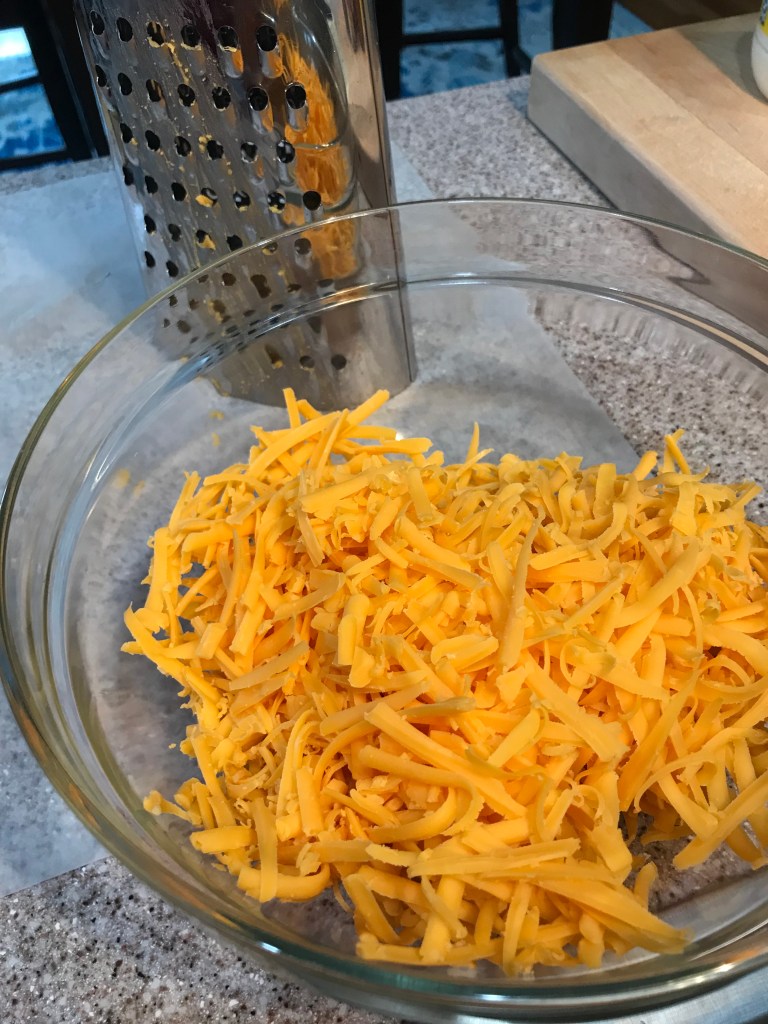 - Cheddar cheese – what I haver here is a block weighing .65/lb – hand shredded