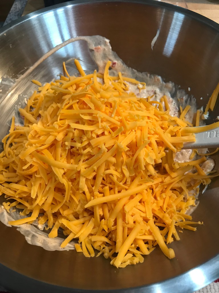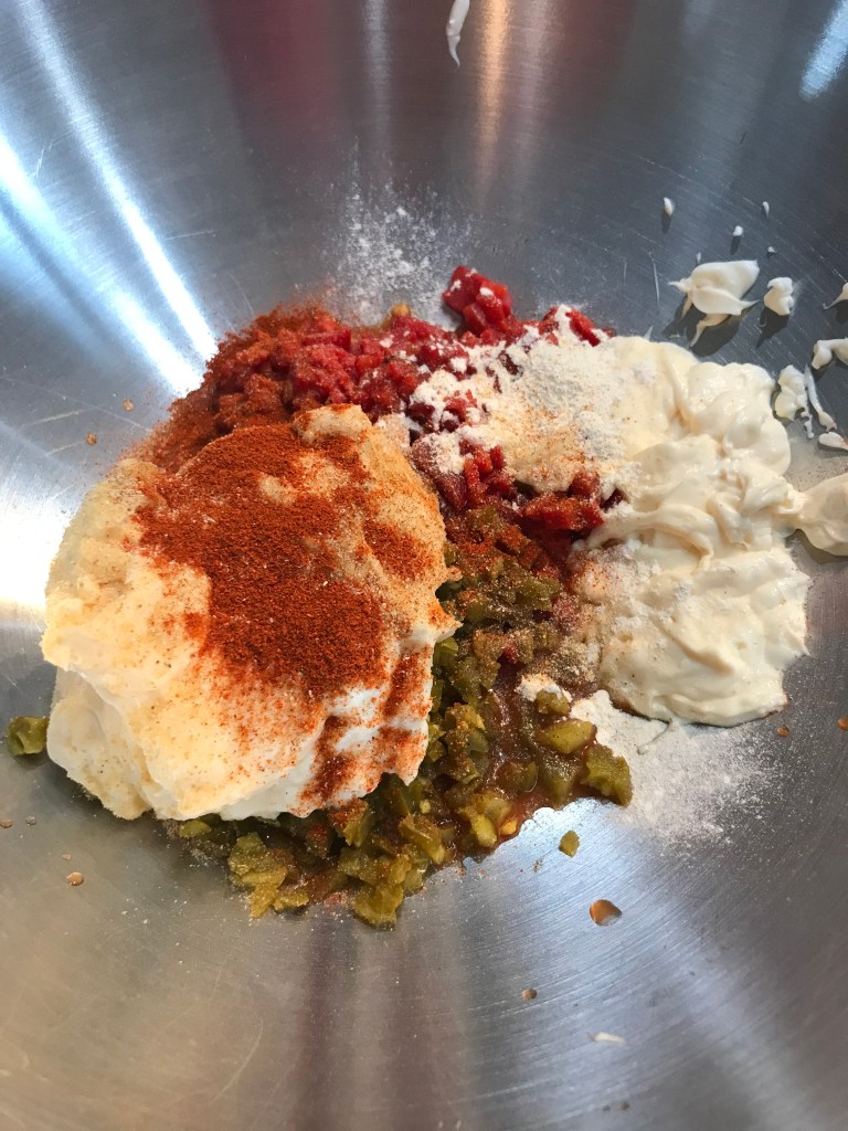 I found pimento cheese while we were living down south and let me tell you, I’m now an official fan for life. I mean, who can’t find some way to eat this versatile cheese spread? Crackers – check! Celery – check! Pimento cheese sandwich on some soft white bread – check! Taco chips – check! Probably my favorite is to put it on a cheese burger with some crispy, crumbled bacon – OMG Check! With the Super Bowl coming up, I needed a low carb dip that I can handle on veggies, so I decided to go with this, but, this is not my usual version. I saw an older episode of Barfoot Contessa where she was touring around New York and she was in a cheese shop (Stinky’s) that made this spicy version. All I had was the video so I’m not sure my measurements are the same as theirs, plus I added some granulated garlic and some smoked paprika – yeah!! It’s super easy and you can adjust the spice and heat levels according to what you like.