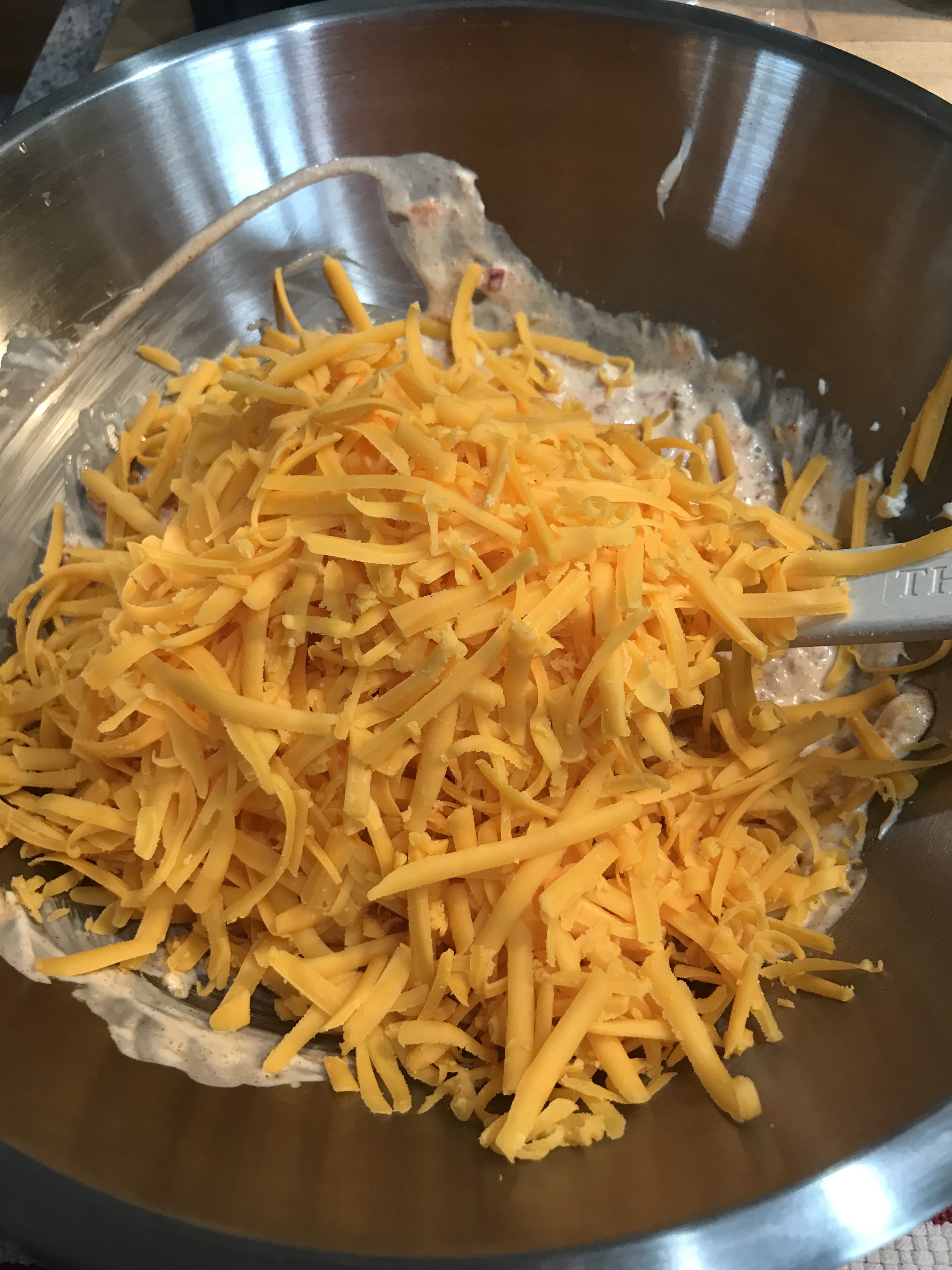 Add the mayo, pinch of salt and the spices – stir to combine thoroughly . Add the cream cheese and the cheddar – fold in the cheese until it’s all mixed together. Add as much Siracha or hot sauce as you like. Taste for seasoning, but remember it’s going to chill in the fridge and the spice will increase a little. Chill for a few hours, just to let the flavors mingle. Use for a dip or a sandwich or anything else you can think of. Enjoy!!