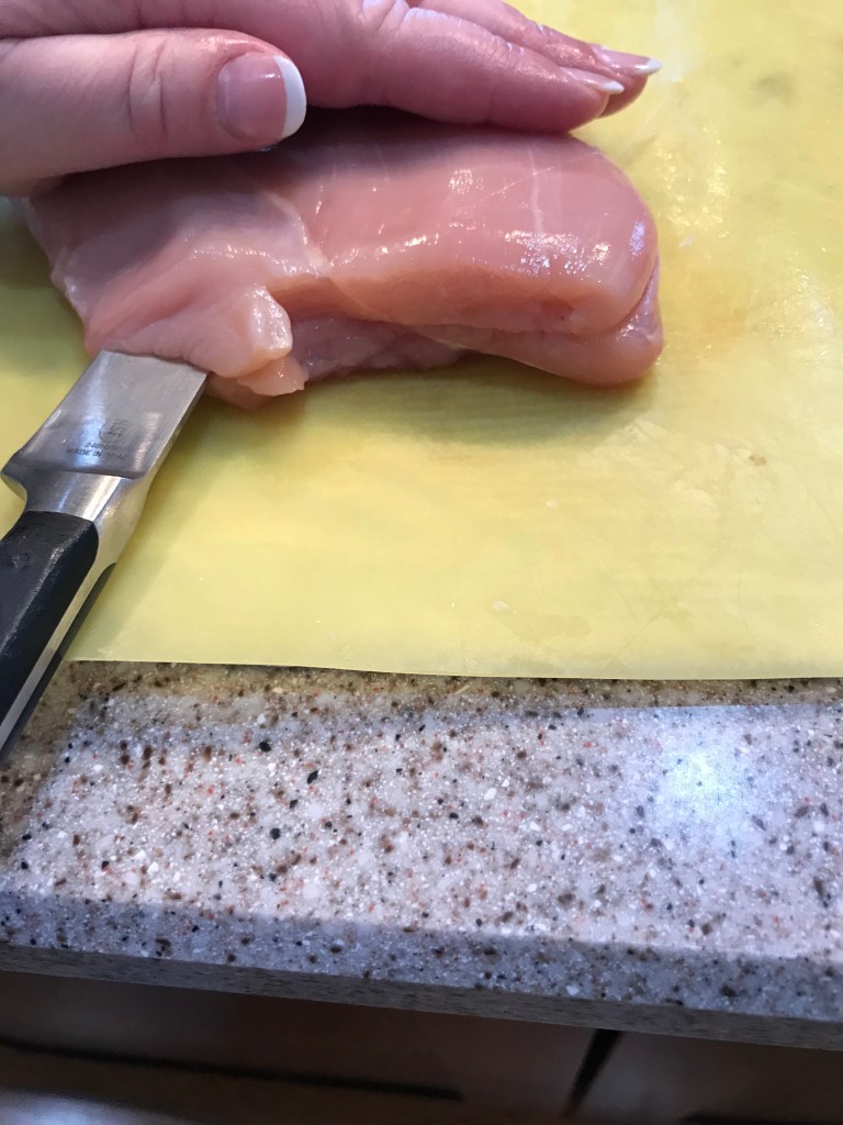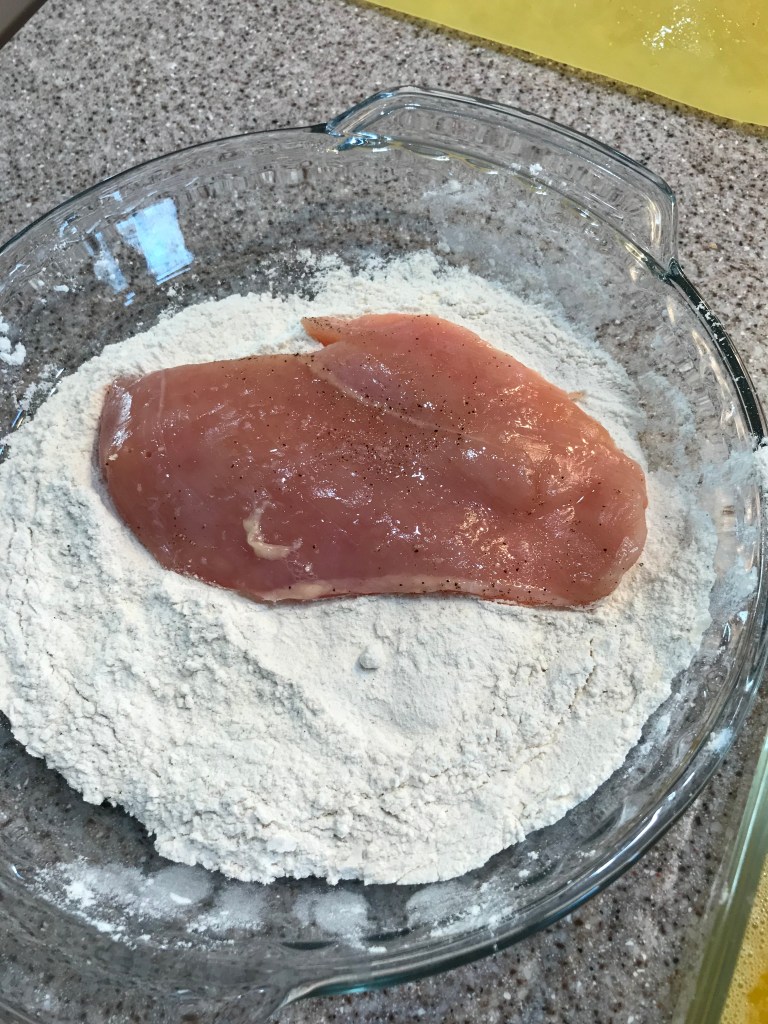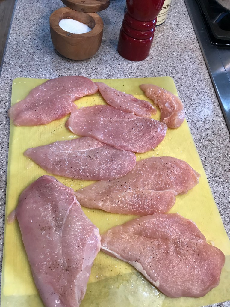 You want your chicken to cook evenly so you may need to slice them in half. I like to make them a little thinner anyway, just my preference. You can sometimes find chicken breast in cutlet form, but there are not always available. Feel free to change this up to boneless and skinless chicken thighs too. Note: If you leave them whole, you will have to cook them a little while longer, but they will be just as tasty. Carefully start at the thick end of the chicken and hold in place with your hand placed flat on the top, make sure you keep that hand out of the way. Nobody likes fingers in their chicken parm. 🙂 Season the chicken with a light layer of salt and pepper. We are going to add salt and pepper to all the dredge pieces so start lightly.