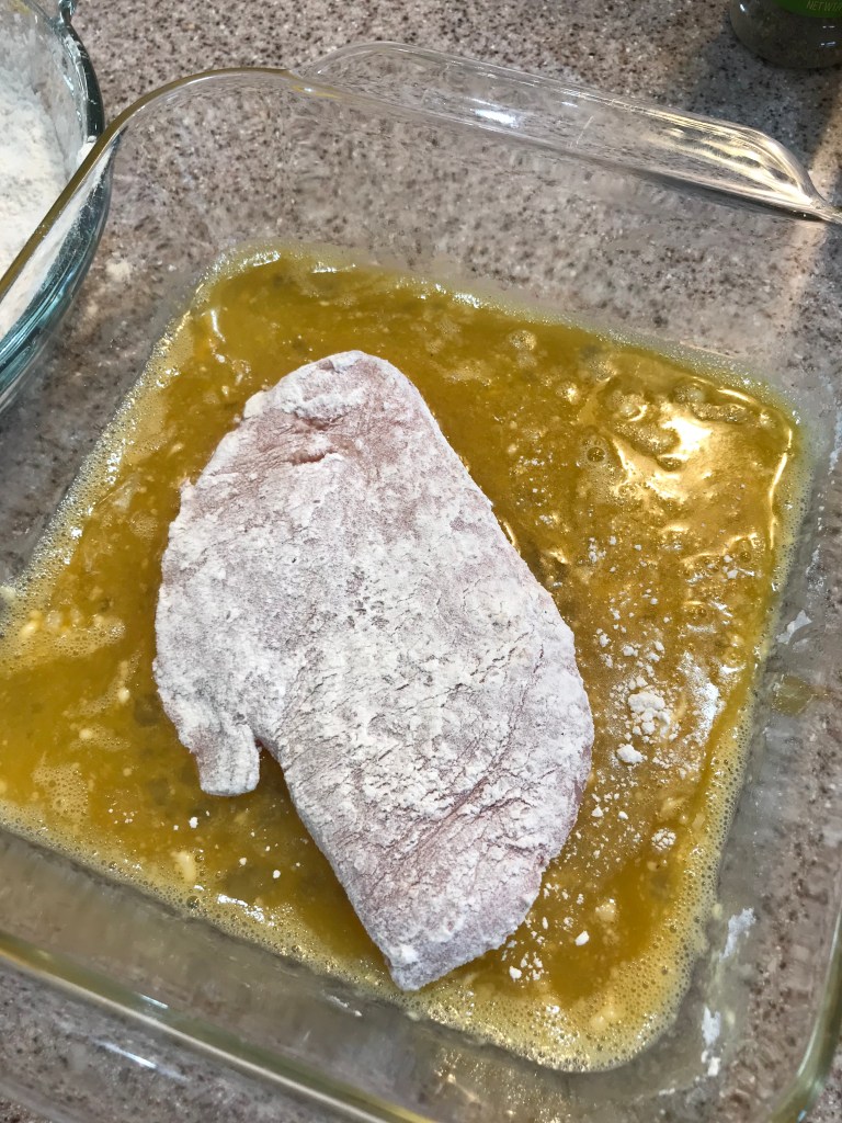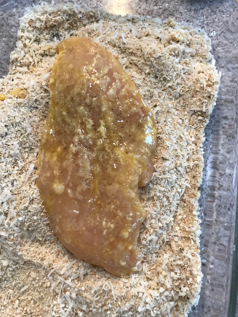 You are ready to start coating your pieces of chicken. Turn the chicken in the flour until coated, tap off excess. Dredge in the egg wash on both sides until coated. Finally drop into the breadcrumbs, press the breadcrumbs into both sides to make sure every bit is coated. Set aside on a baking sheet, sprayed with cooking spray. Continue the same process with the rest of the pieces until they are all coated.