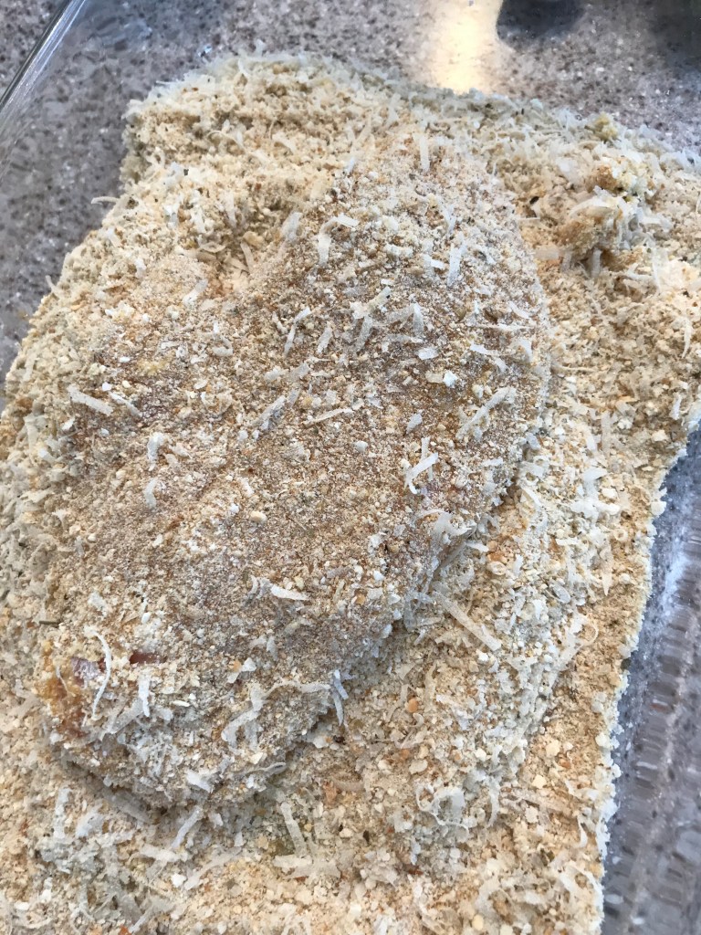 Create your dredging station – flour, eggs and breadcrumbs. Start with the flour – season with about 1/2 tsp salt and a few grinds of black pepper. Next, crack the eggs in a baking dish or pie dish – anything with sides the chicken will fit in works. Add about 1-2 tbsp. of water and whisk until combined. Add the bread crumbs to the same kind of dish and season with the granulated garlic, dried oregano or Italian seasoning, a good pinch of salt and a few grinds of pepper, and 1/2 cup of grated parmesan cheese. The cheese will add salt here so tread lightly. Stir that up until combined.