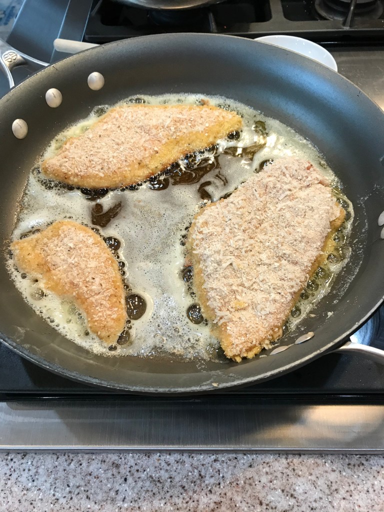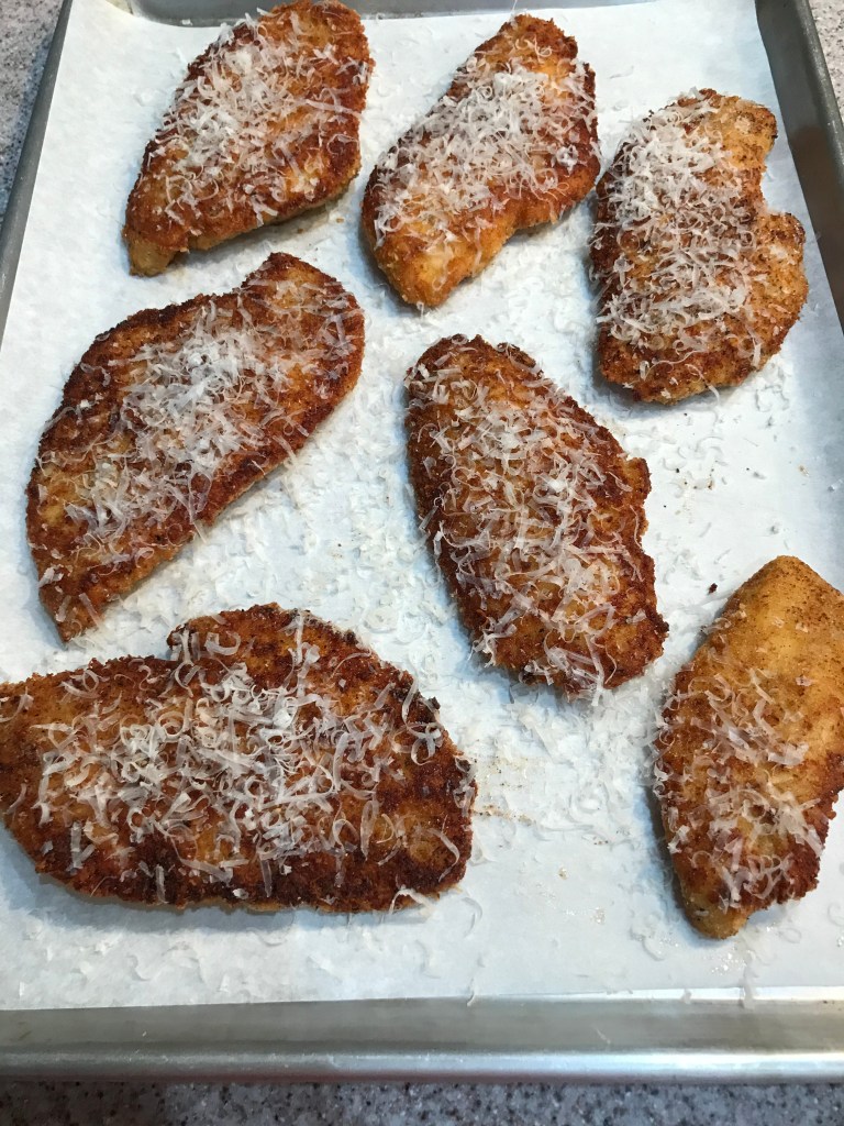 At this point it’s time to pan fry the chicken and get it ready for the oven. Melt 3 tbsp. butter with 3 tbsp. of olive oil over medium high heat in a large nonstick pan. Add 2-3 pieces at a time, being careful not to crowd the pan because you want these crisp, not steamed. Cook about 3-4 minutes per side, until they are golden brown. Set the finished pieces on a new baking sheet lined with parchment paper. Sprinkle with parmesan cheese. Repeat the process until all the chicken is brown and delicious looking. Add more butter and olive oil as needed. The chicken will not be totally cooked through, but that’s OK….it’s going in the oven to finish. Note: I have made this dish ahead to this point and then covered and refrigerated the chicken for a few hours. When you are ready to serve, just finish up from this point. All the hard work is finished and all the dishes are already done! Winner! Winner! Chicken dinner!