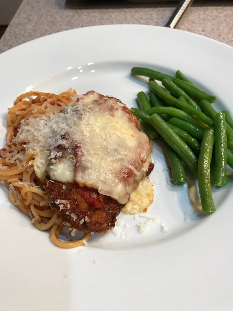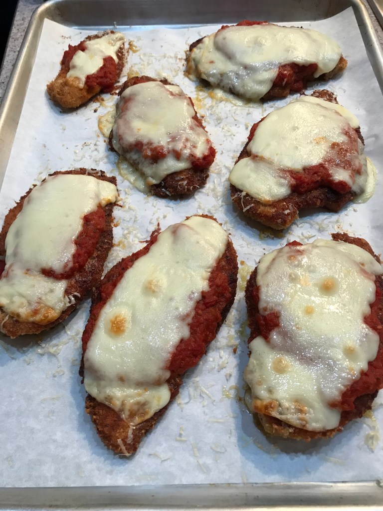 Preheat the oven to 350 degrees. Warm up the sauce you are gong to use as your are working on the chicken. If you are cooking whole breasts, then you will want to put these in the oven without sauce or cheese for about 10-12 minutes to make sure they are cooked through. If you have half pieces that are thinner, are ready to add sauce. Add as much or as little sauce as you like. I usually put a huge spoon full right across the middle and cook in the oven for about 8 minutes. Carefully pull the baking sheet out and add the mozzarella cheese and a little more parm . Put the pan back in the oven for 5-10 more minutes until the cheese is melted. Garnish with more parm or some parsley – both optional. I like to serve this with green beans that I blanch and then sautéed in a little butter and some spaghetti tossed with some of the marinara. A huge piece of garlic bread is never a bad idea either. 🙂 Enjoy!