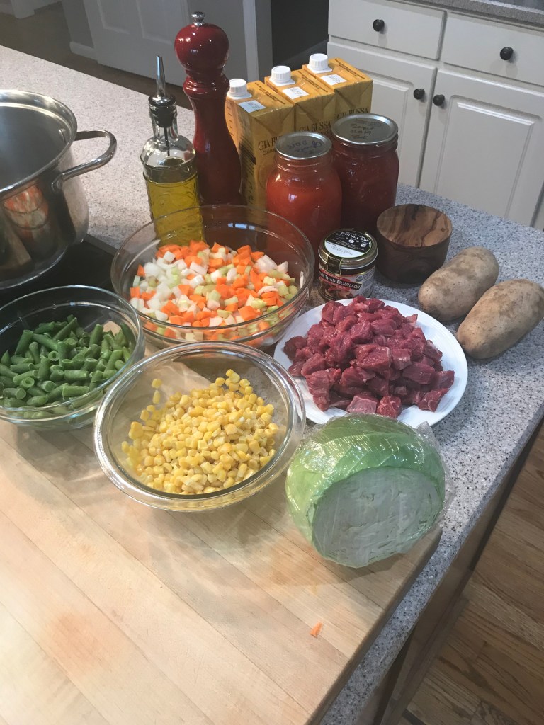 The good news is all of these measurements are just suggestions. You can adjust according to what you like in your soup. Feel free to add more of something, or leave something out if you don’t care for it. If you want to make this completely vegetarian, skip the meat and use some veggie stock. I try to cut all my veggies about the same size and so that they will fit on a spoon. All you need is a large stock pot plus….