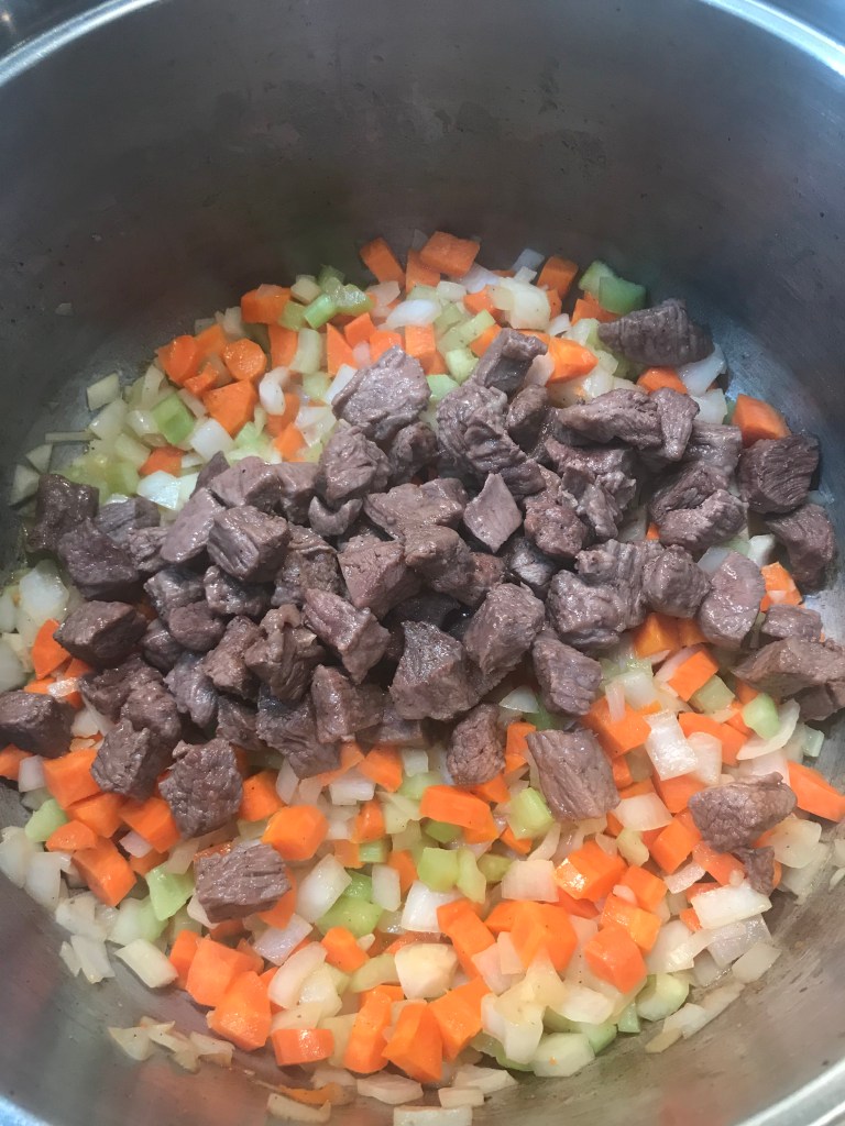 Start with about 1 tablespoon of vegetable oil and 2 tablespoons of butter over medium high heat in a large Dutch oven or stock pot. Season the beef with a sprinkling of salt and pepper – don’t worry we will measure and add layers of seasoning as we add the veggies. Cook/sear the beef for about 8 -10 minutes, flipping on all sides of the meat. Remove the beef to a plate. Add another tablespoon or two of butter to the pot. After the butter has melted add the onions, celery and carrots. Add one teaspoon of salt and quite a few turns of cracked black pepper. Sweat the veggies for 10-12 minutes until the veggies start to soften. Stir in the meat and all the juices collected on the plate.