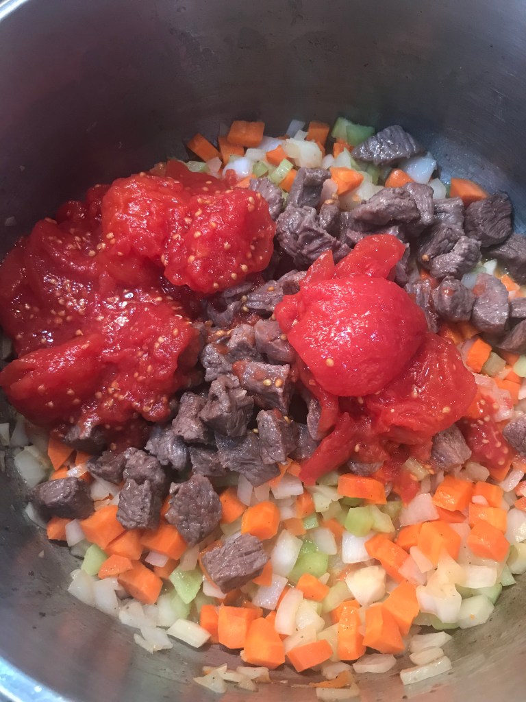 I add the whole tomatoes first and use my spatula to break up them up, then add the tomato juice and the beef stock. You cold also add some bouillon at this time if you want to bump up the beef flavor. Stir in another teaspoon of salt and more pepper. Bring to a boil then lower the heat to low to keep at a simmer for about 1 1/2 hours, to allow the meat to tenderize and the vegetables to flavor the liquid. Taste for seasoning as you go along.