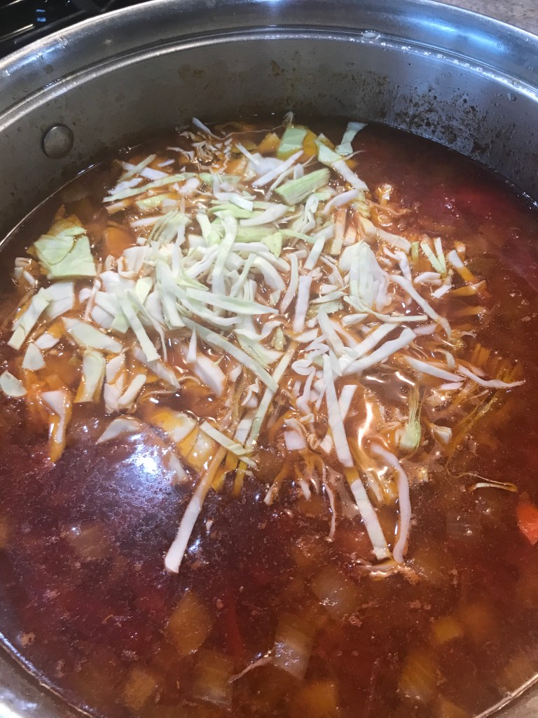 Now we’re ready for the liquid part of the soup. For the tomatoes, you can use whole or chopped, totally user preference. This soup is one of the things I spend time canning my own tomatoes and juice for in the summer months. My how to on canning tomatoes is on this blog in Sept 2019.