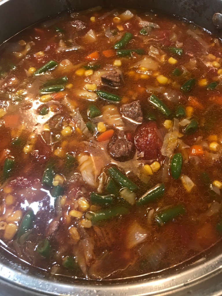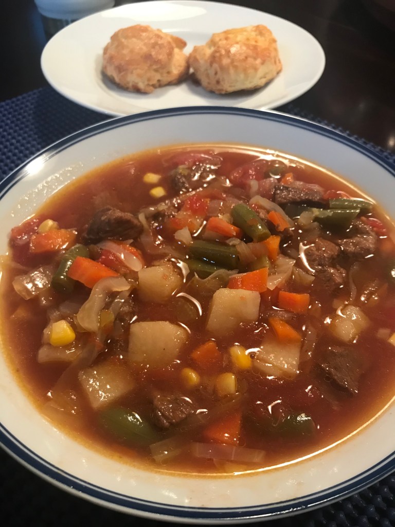Next add the potatoes and the cabbage to the pot. Allow about 30 more minutes for the potatoes to cook and the cabbage to soften up. Stir in the corn and green beans and allow them to warm through. Again, taste for salt and pepper and adjust to your liking. I usually serve this soup with some warn and crusty bread or these yummy cheddar biscuits seen in the pic below(coming soon on this blog). It’s also good served with a few cooked egg noodles tossed in to make this a more hearty dish. Make this and enjoy tonight! Stay warm!