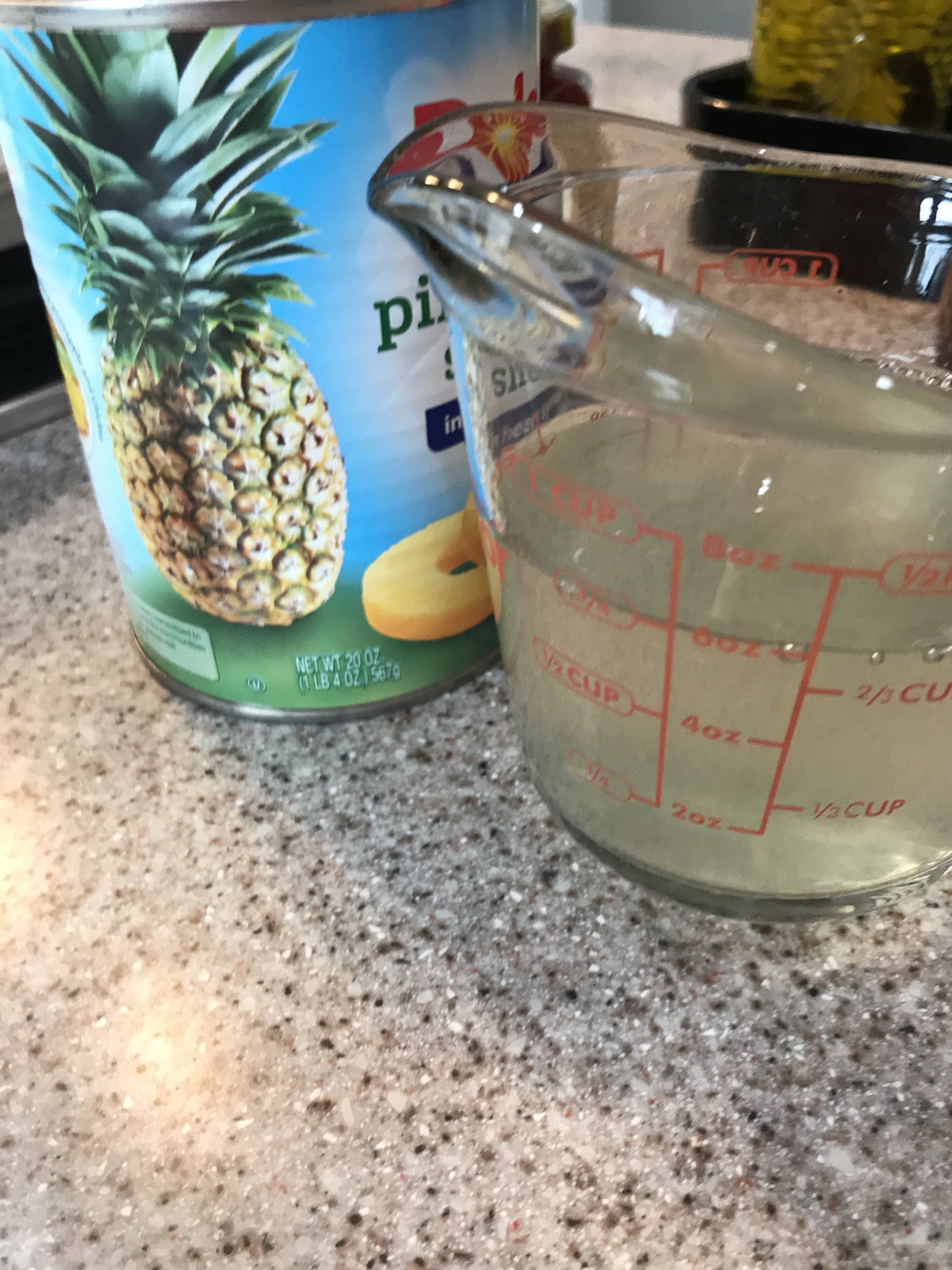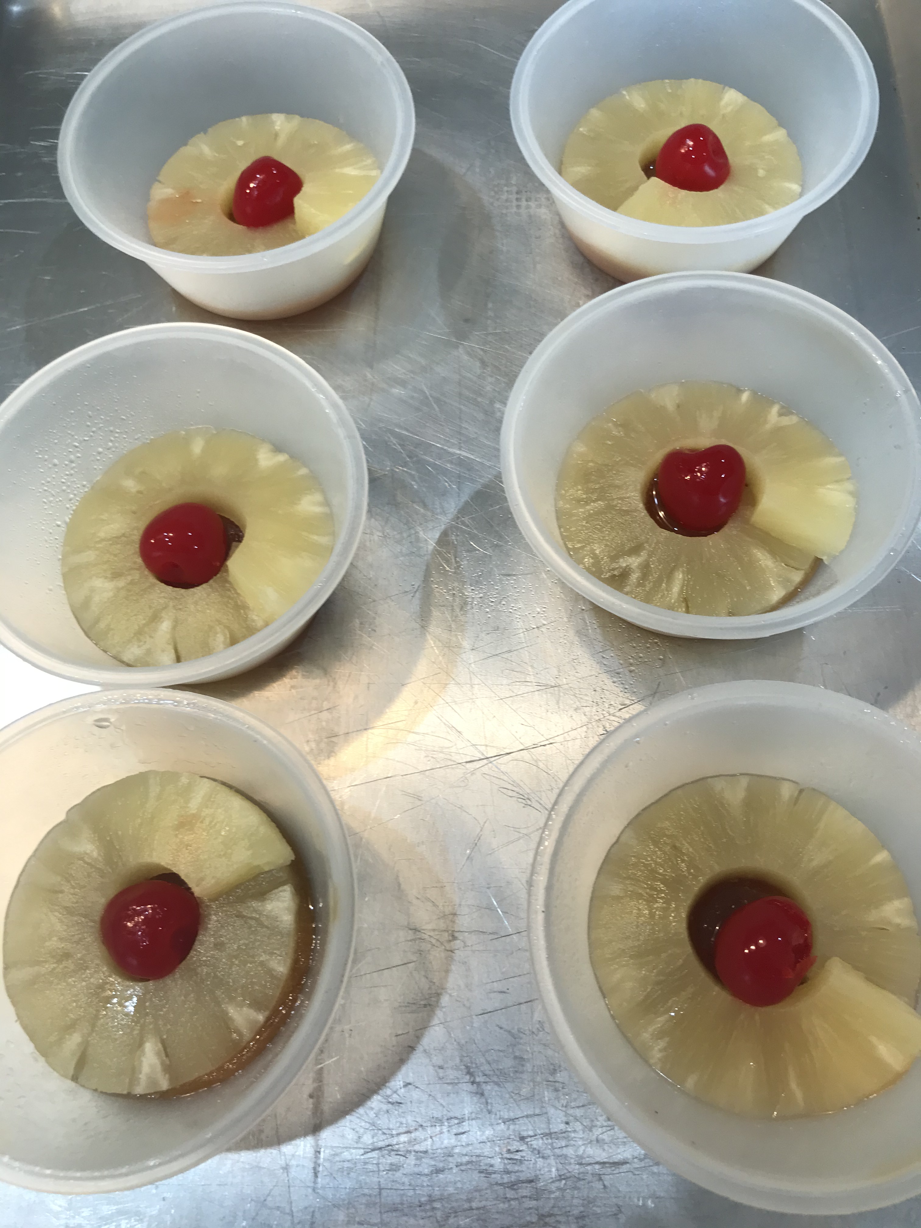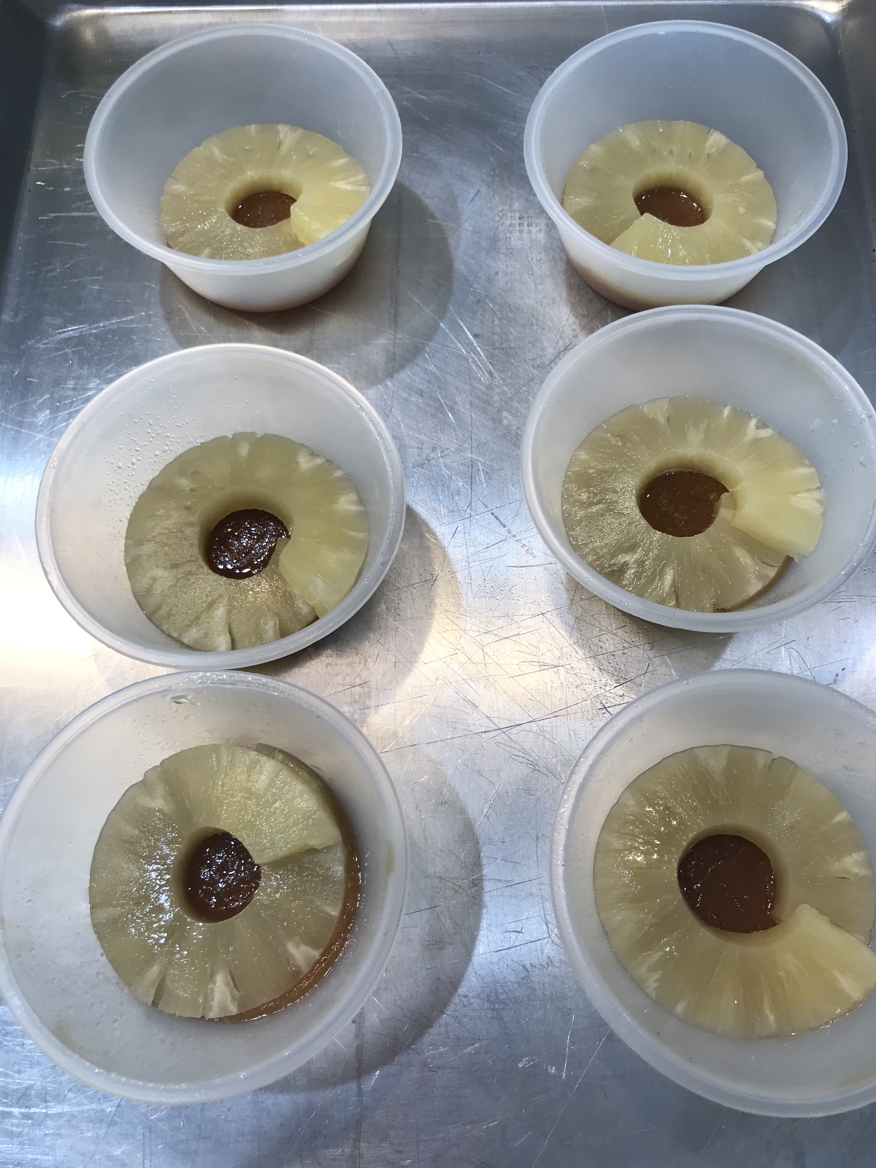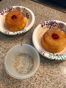 - 1 – 20 oz. can pineapple rings – fruit and the juice will be used. I will make a change on this after my experiment. Tidbit size will work a little better for the small pans,.