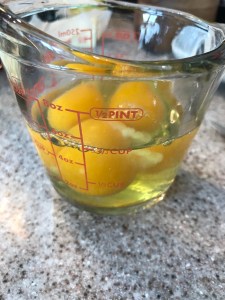 Now, here’s where I would change the shape of the pineapple. The rings were a little bit big for this size pan, so I make a slit in the side and just overlapped them a bit. Next time I would buy the tidbit size and cover the bottom with those. That way they would fit nicely, look better and would be much easier to eat. Lesson learned number one on this experiment. Lay the rings in the bottom and place a cherry in the middle. Make sure you save the juice from the pineapple.