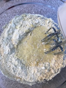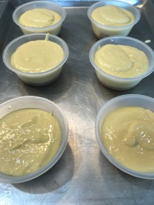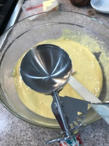 For the batter – The cake mix calls for 1 cup of water, 3 eggs and 1/3 cup of vegetable oil. That would all be just fine to use here, but since there’s all this nice juice left, I use that in place of the water. I got 3/4 a cup to start, then I rinsed out the can to get the last 1/4 cup. Add the juice along with the eggs and oil and mix on medium high for about 3 minutes until well mixed. Use an ice cream scoop (or pour into a measuring cup to make it easier) to fill the pans 2/3 of the way full. I did a little testing and did 2/3 then a little more, then filled them up. The 2/3 full option turned out the best, and they were all good, but didn’t cook together. Plus one ran over that I got REALLY full….ugh.