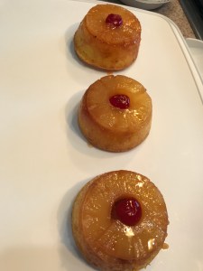 I bought these nonstick silicone cups a while back to make chocolate lava cakes – which are totally yummy but that’s for another post. I’ve been looking for another cute and fun way to use them. I considered breakfast omelet, but those aren’t as fun as a cake, right? I saw pineapple upside down cakes in a muffin pan and that’s what convinced me to try the silicon pans with it. They are perfect size for an individual cake, and I had hoped they would work as advertised and my cakes would flip right out.