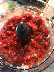 Add as much or as little jalapeno as you like. If I’m making this for family or a party I tend to go easier on the heat. When it’s just people that I know like heat, I crank it up. Same way with the cilantro and garlic. Add them to the levels that you like, it’s your salsa after all. Give the veggies a few pulses to get them started. Add the 2 cans of drained and diced tomatoes and peppers and then the whole tomatoes. Give that a few pulses.