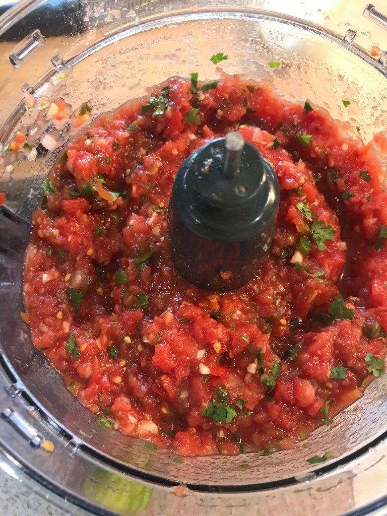 I start with about 1/2 teaspoon of salt, a few grinds of black pepper, 1/4 teaspoon of cumin. Add the lime zest and cilantro and pulse until the salsa is the consistency that you like. I’m usually at about 10-12 pulses to get what I like. At this point, pour everything into a mixing bow, and add the petite diced tomatoes along with the lime juice and give it a taste. Stir in more salt/cumin/chopped cilantro/lime and maybe a pinch of sugar depending on how acidic your tomatoes are.